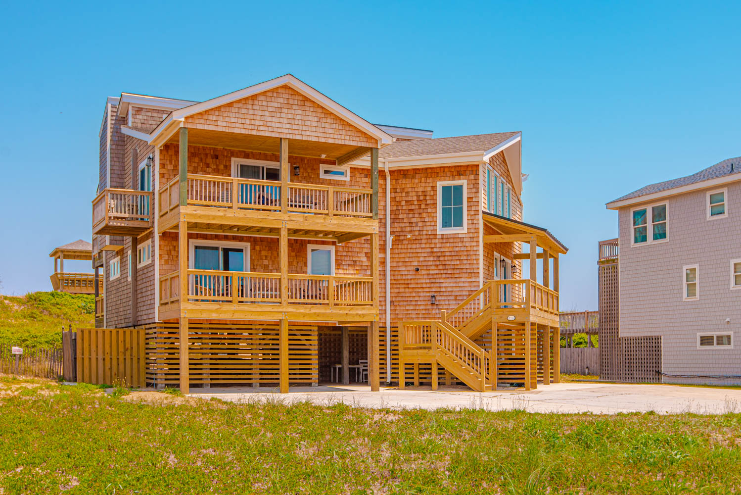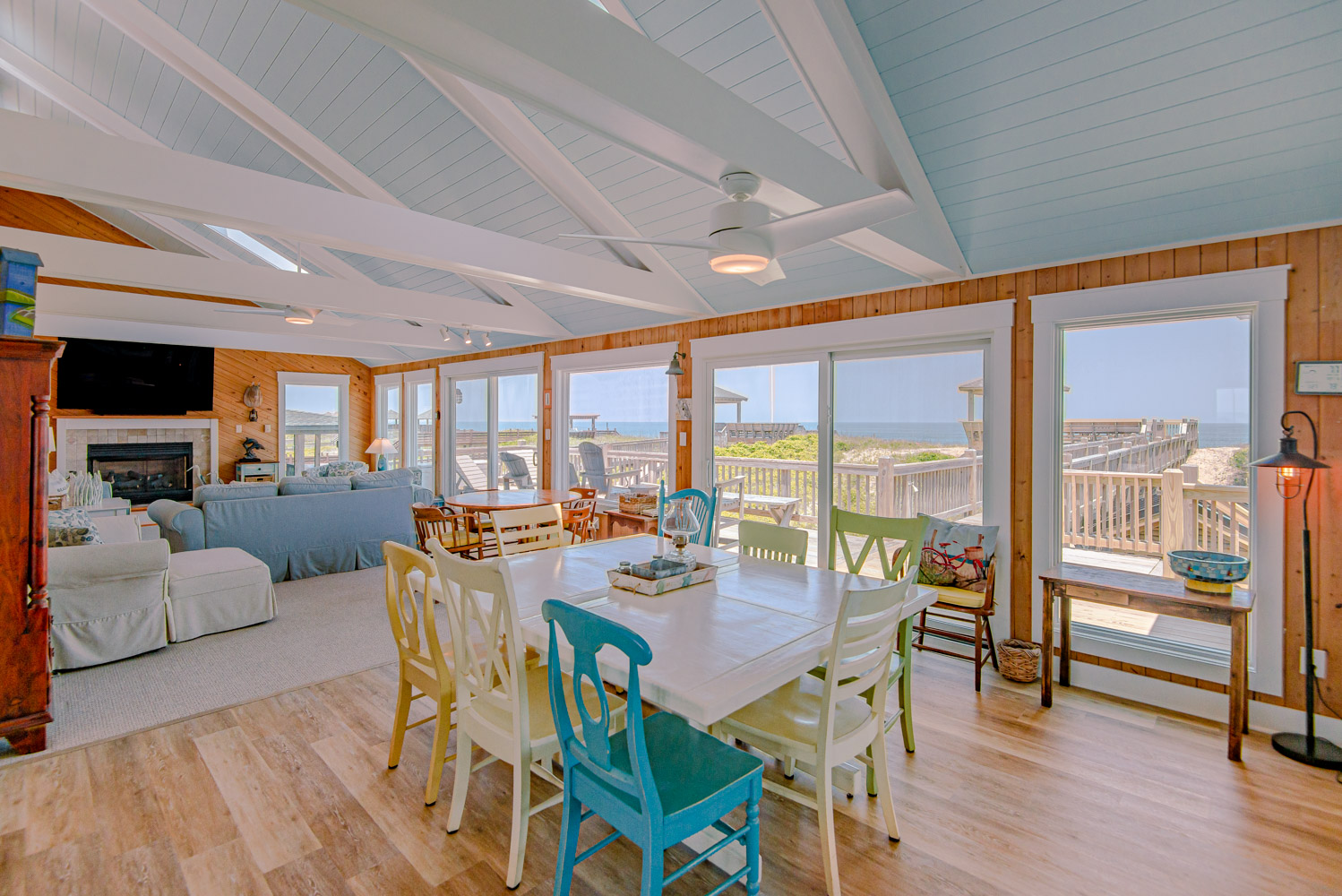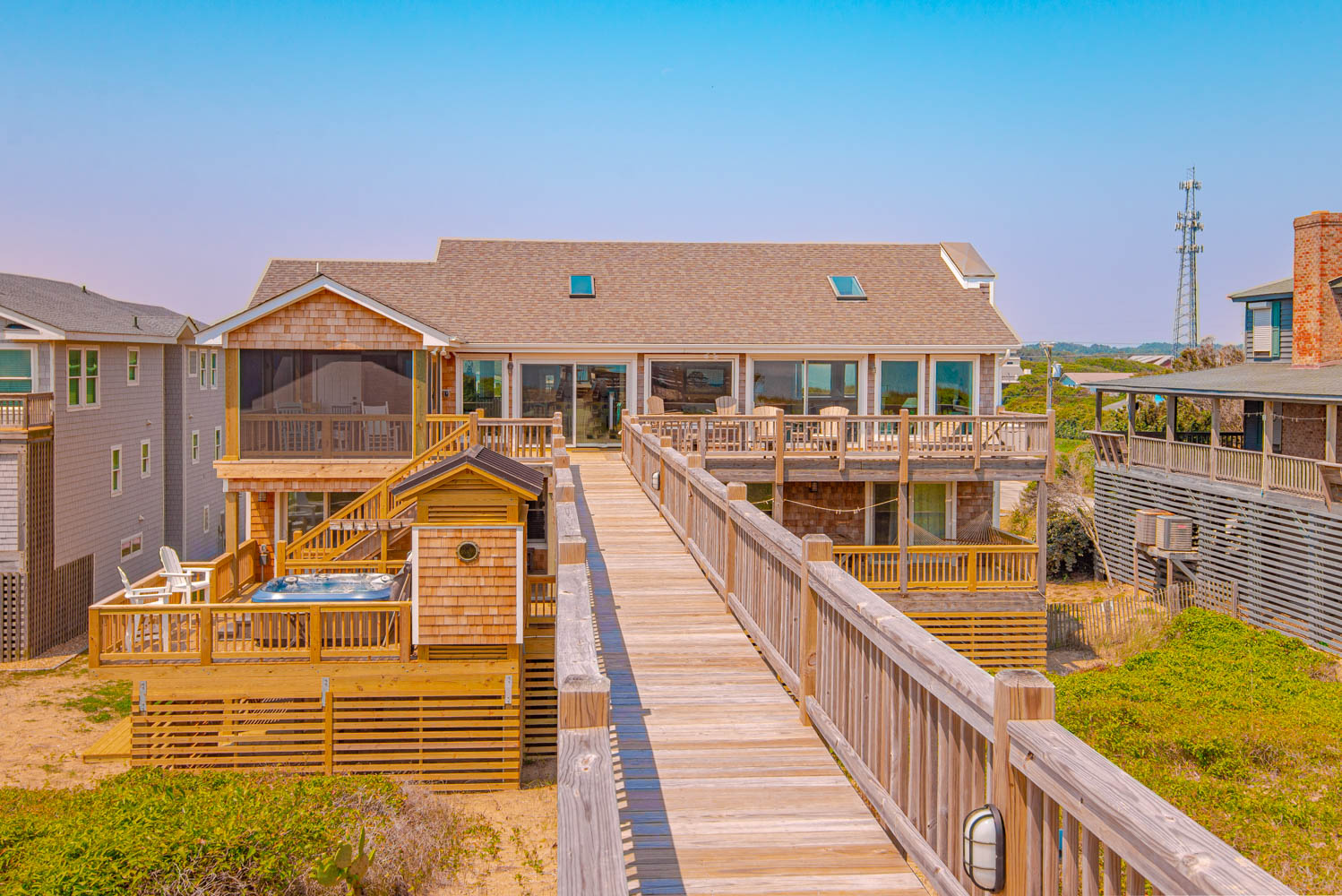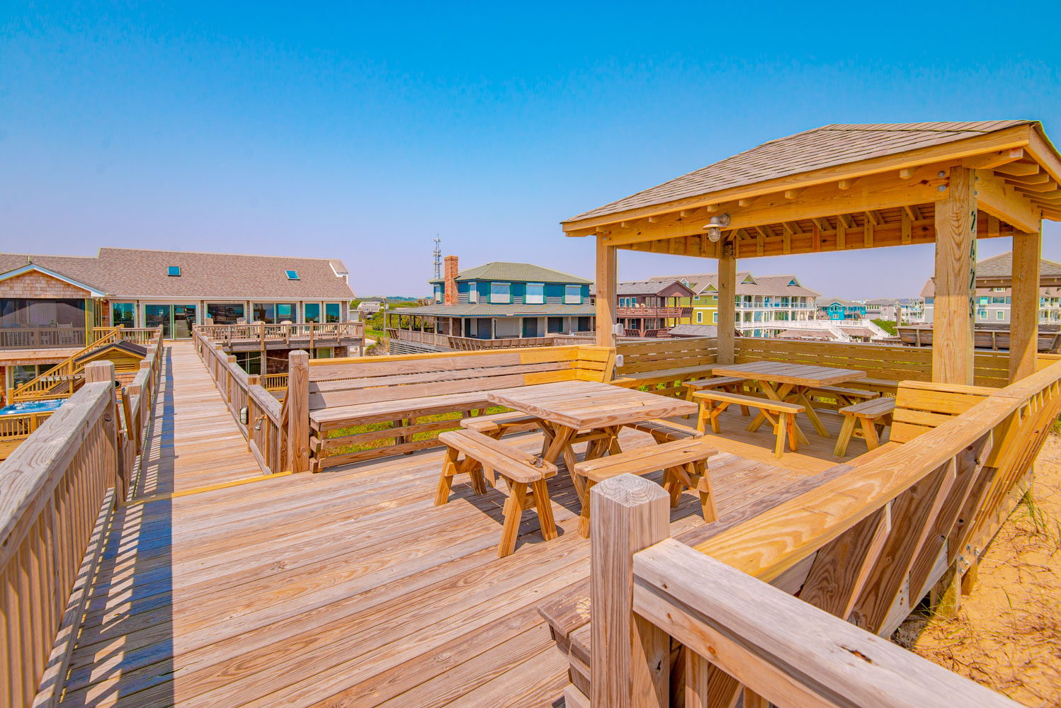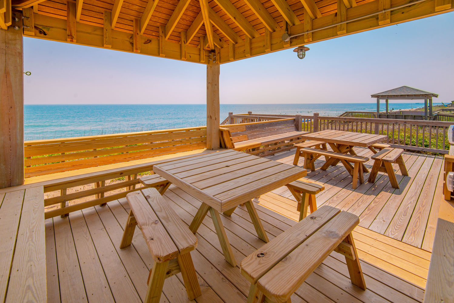 Top Level: Great Room, Magnificent Ocean Views, Large Flat Panel TV, Gas Fireplace, Game Table; Large Dining Area, 2 Seating Areas, Fully Equipped Kitchen, Griddle, Crock Pot, Gas Range, Extended Bar/Counter; Seating Overlooking Vast Windows on the Front, Powder Room, Private Suite w/King, TV, Full Bath Walk-In Shower, Access to Sunset Deck/Balcony; Oceanfront Sun Deck w/Screen Porch, Deck Furniture, Private Boardwalk to Partially Covered Dune Top Deck w/Lights, Built-In Benches, 2 Picnic Tables, Fantastic Ocean and Beach Views.