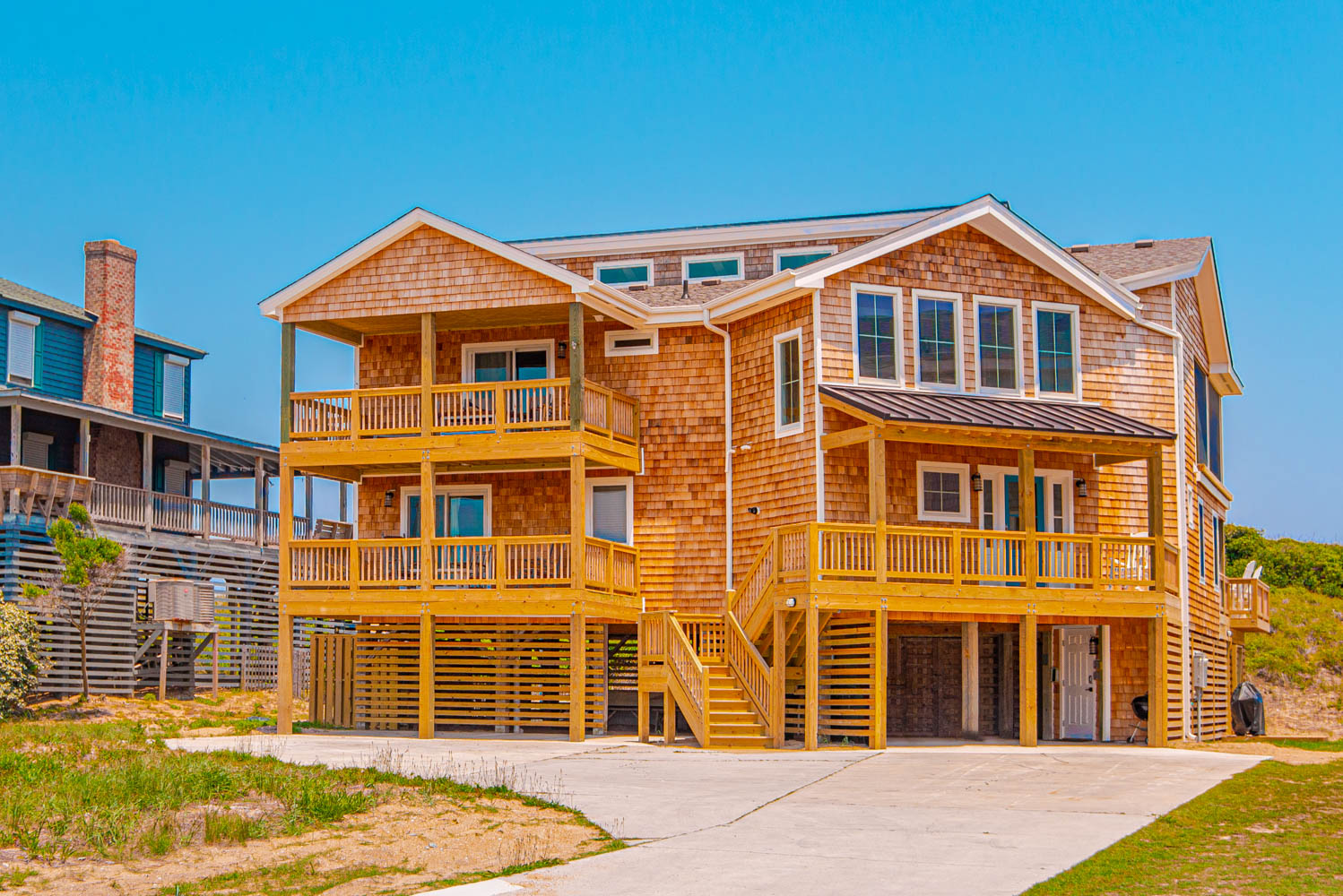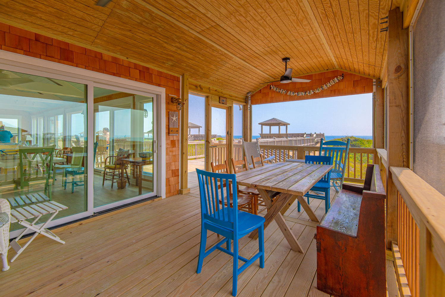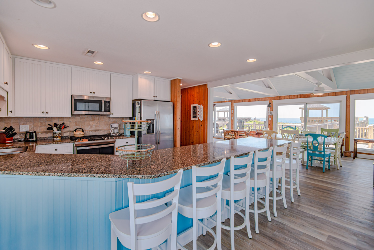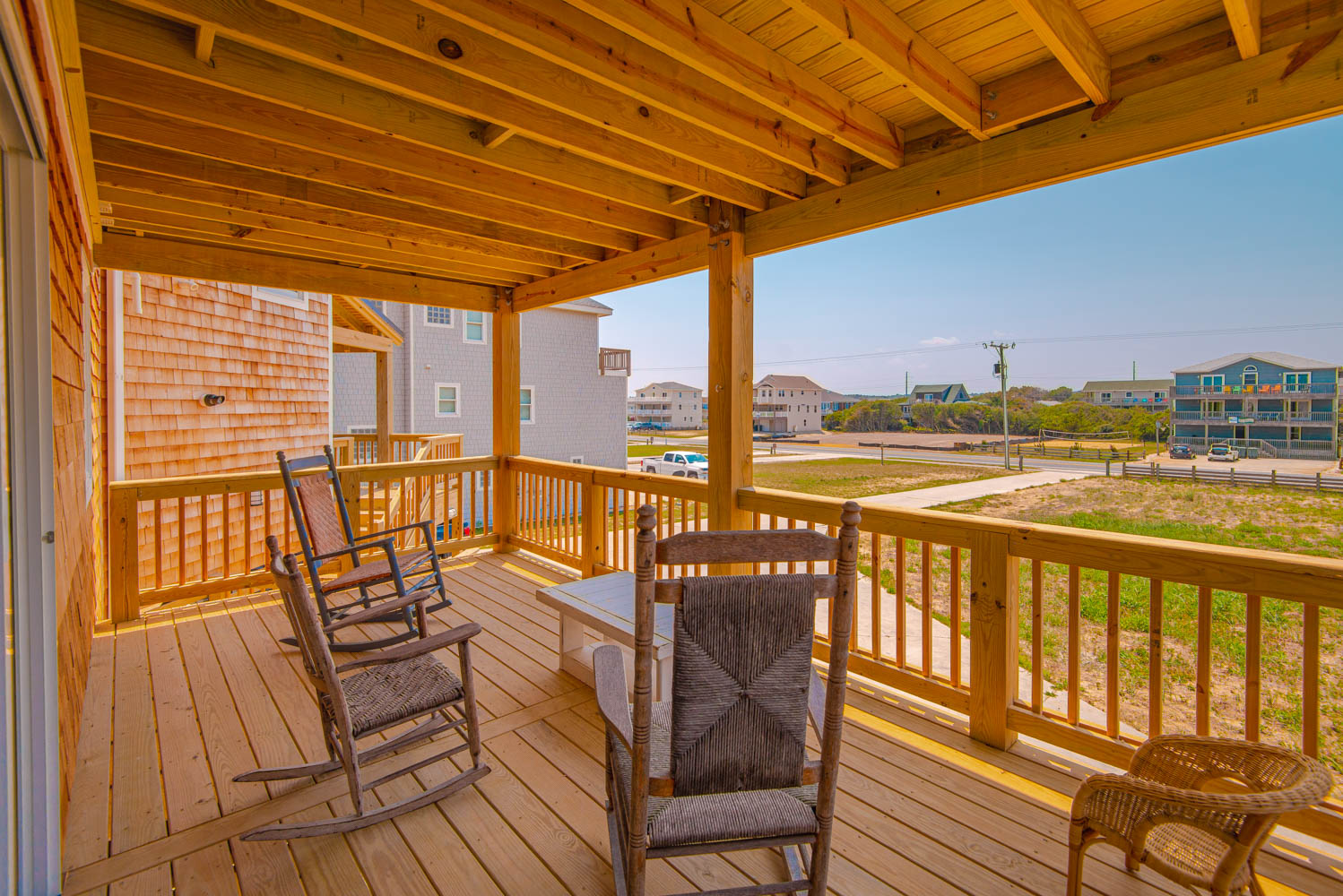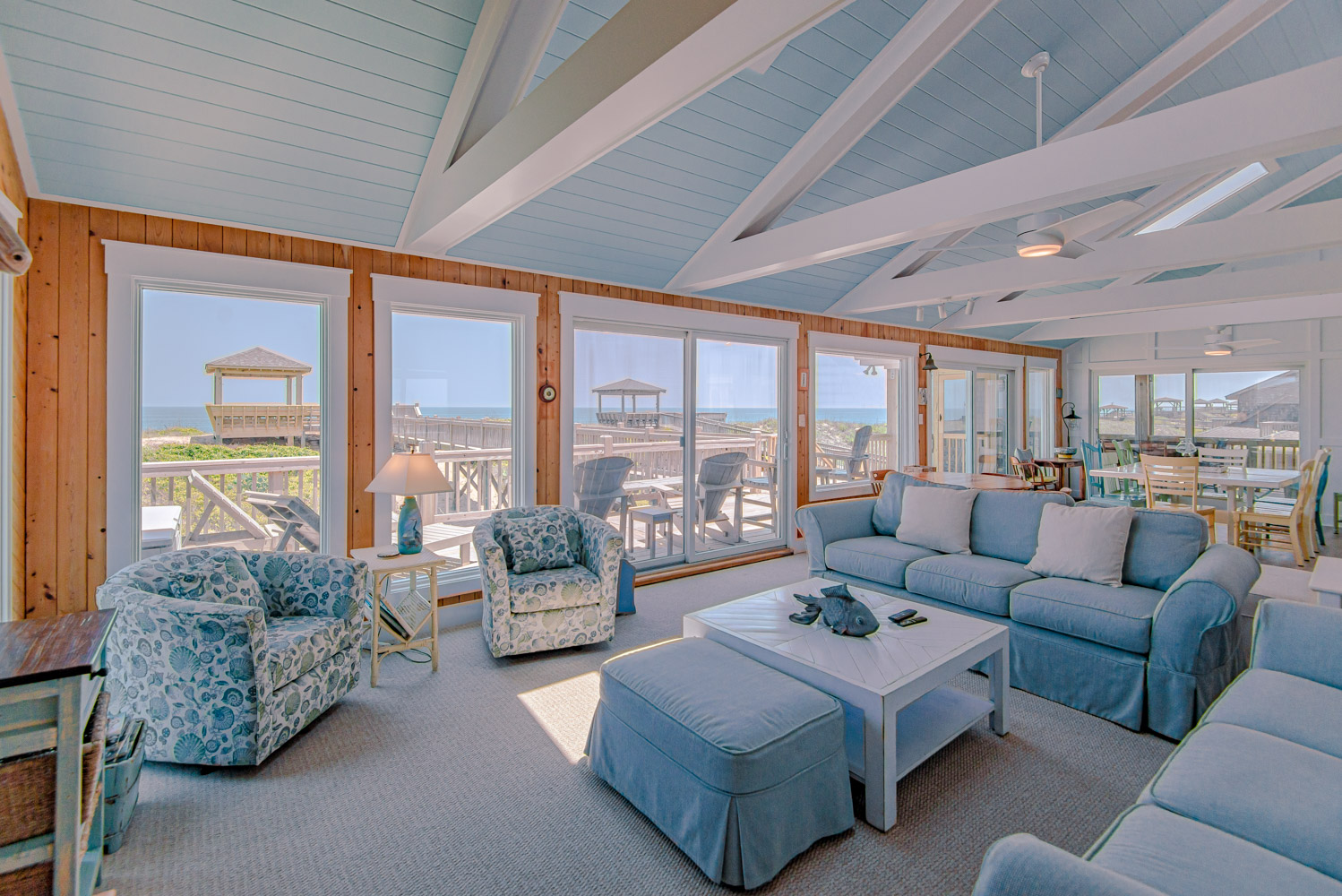 Top Level: Great Room, Magnificent Ocean Views, Large Flat Panel TV, Gas Fireplace, Game Table; Large Dining Area, 2 Seating Areas, Fully Equipped Kitchen, Griddle, Crock Pot, Gas Range, Extended Bar/Counter; Seating Overlooking Vast Windows on the Front, Powder Room, Private Suite w/King, TV, Full Bath Walk-In Shower, Access to Sunset Deck/Balcony; Oceanfront Sun Deck w/Screen Porch, Deck Furniture, Private Boardwalk to Partially Covered Dune Top Deck w/Lights, Built-In Benches, 2 Picnic Tables, Fantastic Ocean and Beach Views.