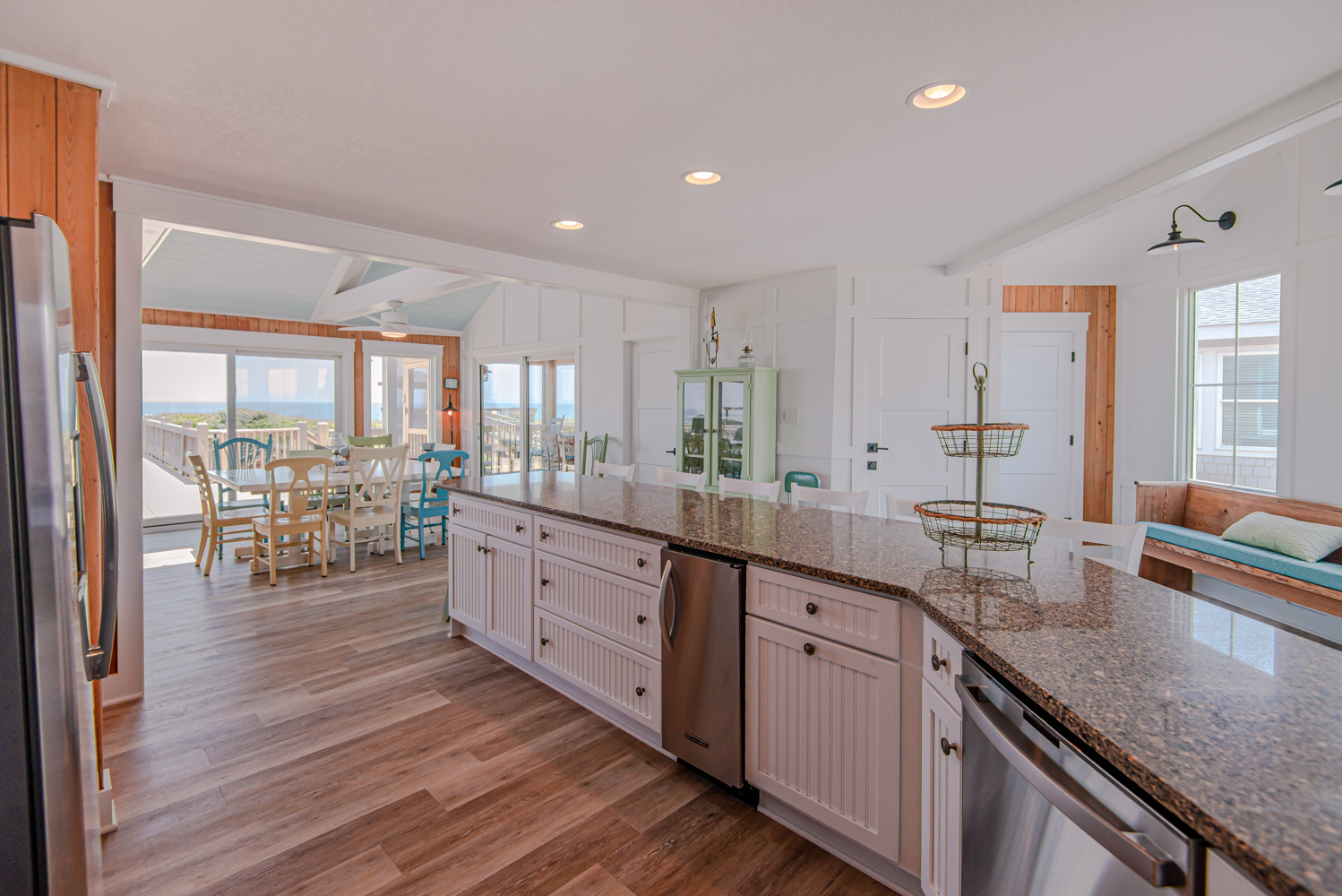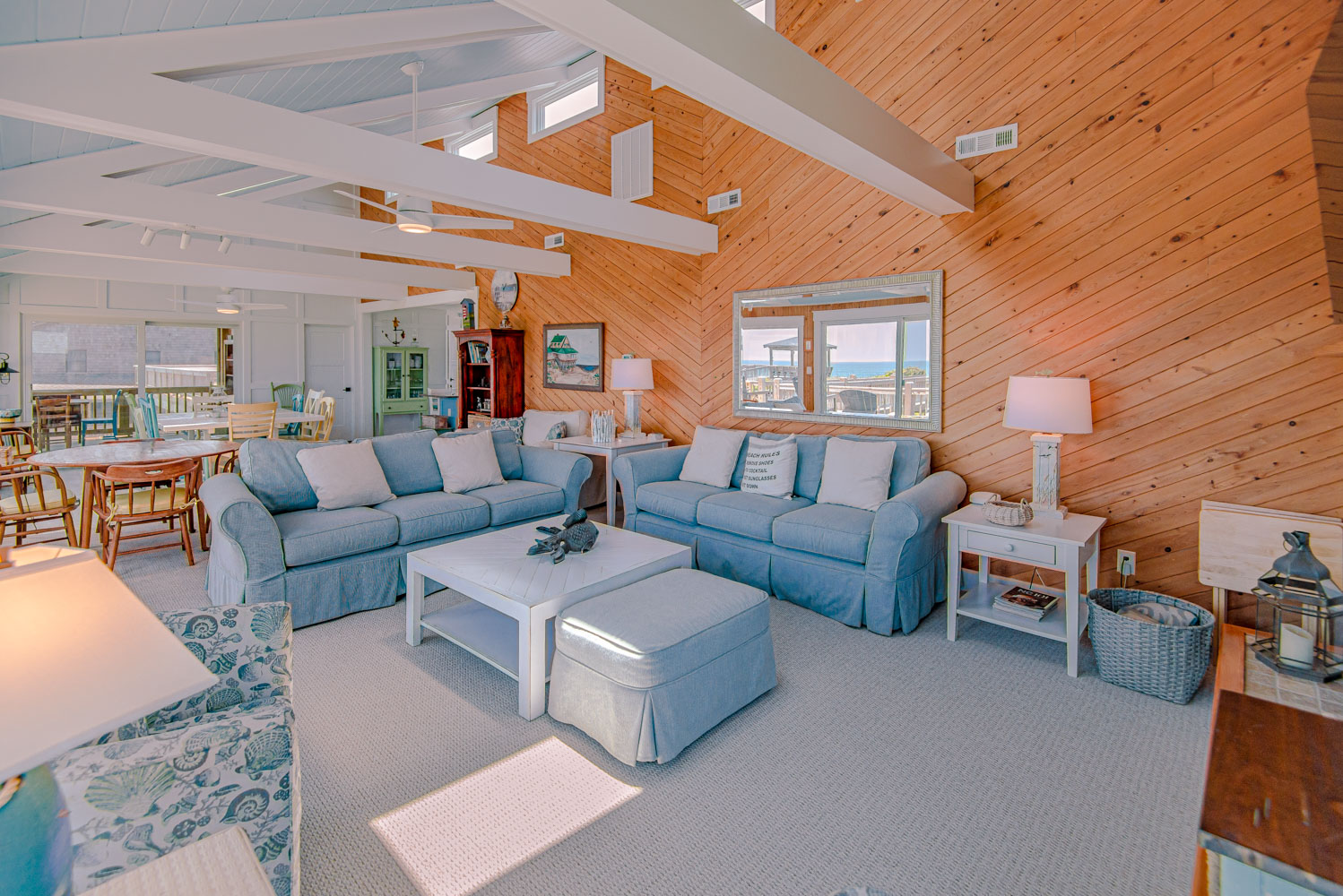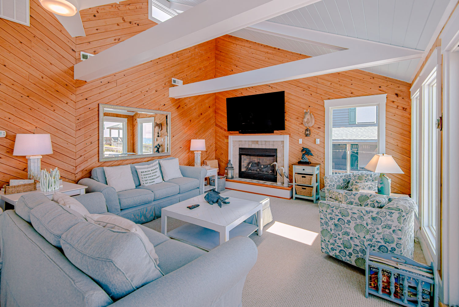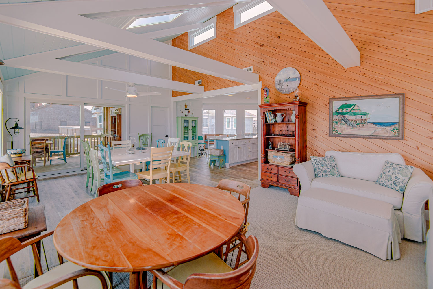 Top Level: Great Room, Magnificent Ocean Views, Large Flat Panel TV, Gas Fireplace, Game Table; Large Dining Area, 2 Seating Areas, Fully Equipped Kitchen, Griddle, Crock Pot, Gas Range, Extended Bar/Counter; Seating Overlooking Vast Windows on the Front, Powder Room, Private Suite w/King, TV, Full Bath Walk-In Shower, Access to Sunset Deck/Balcony; Oceanfront Sun Deck w/Screen Porch, Deck Furniture, Private Boardwalk to Partially Covered Dune Top Deck w/Lights, Built-In Benches, 2 Picnic Tables, Fantastic Ocean and Beach Views.