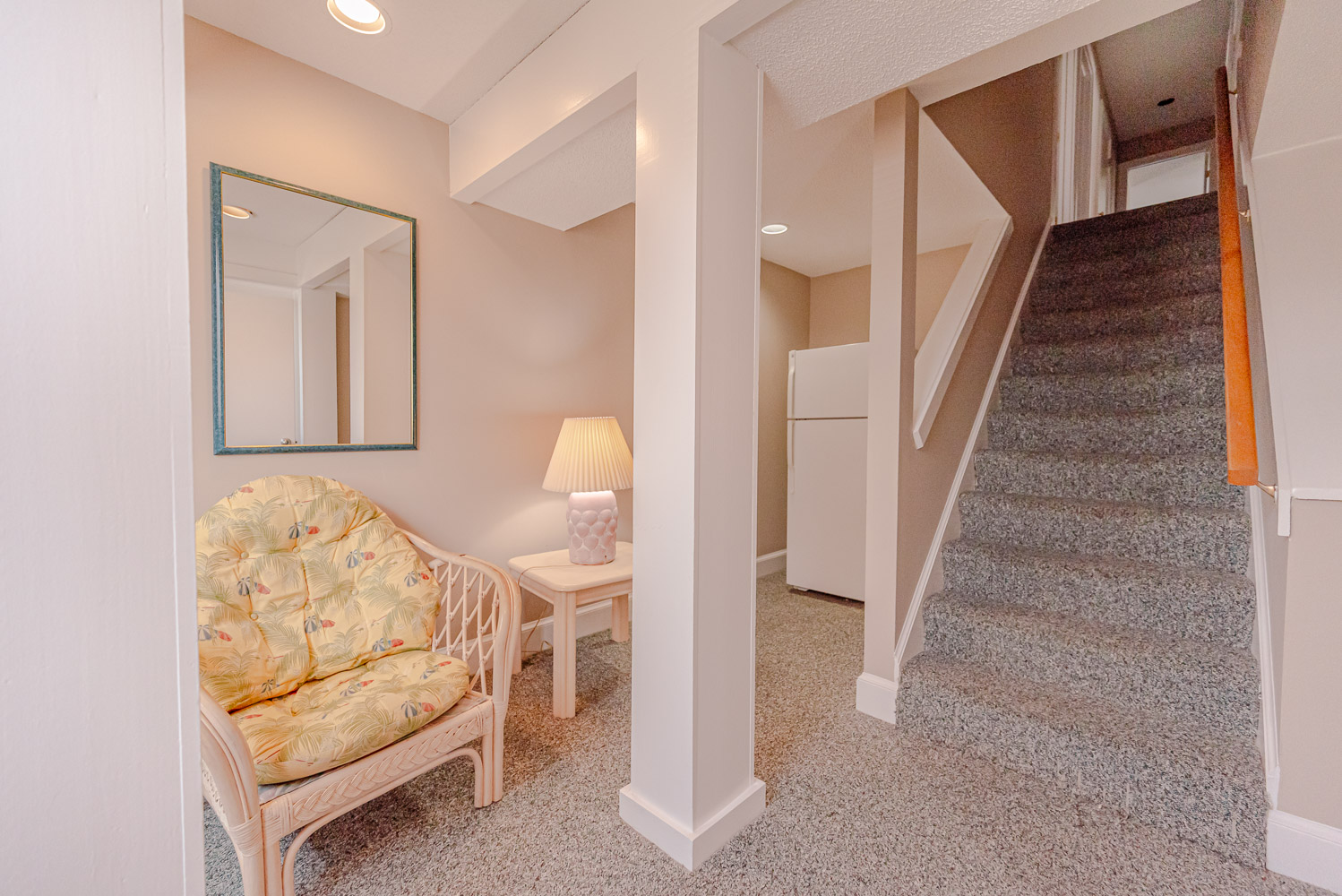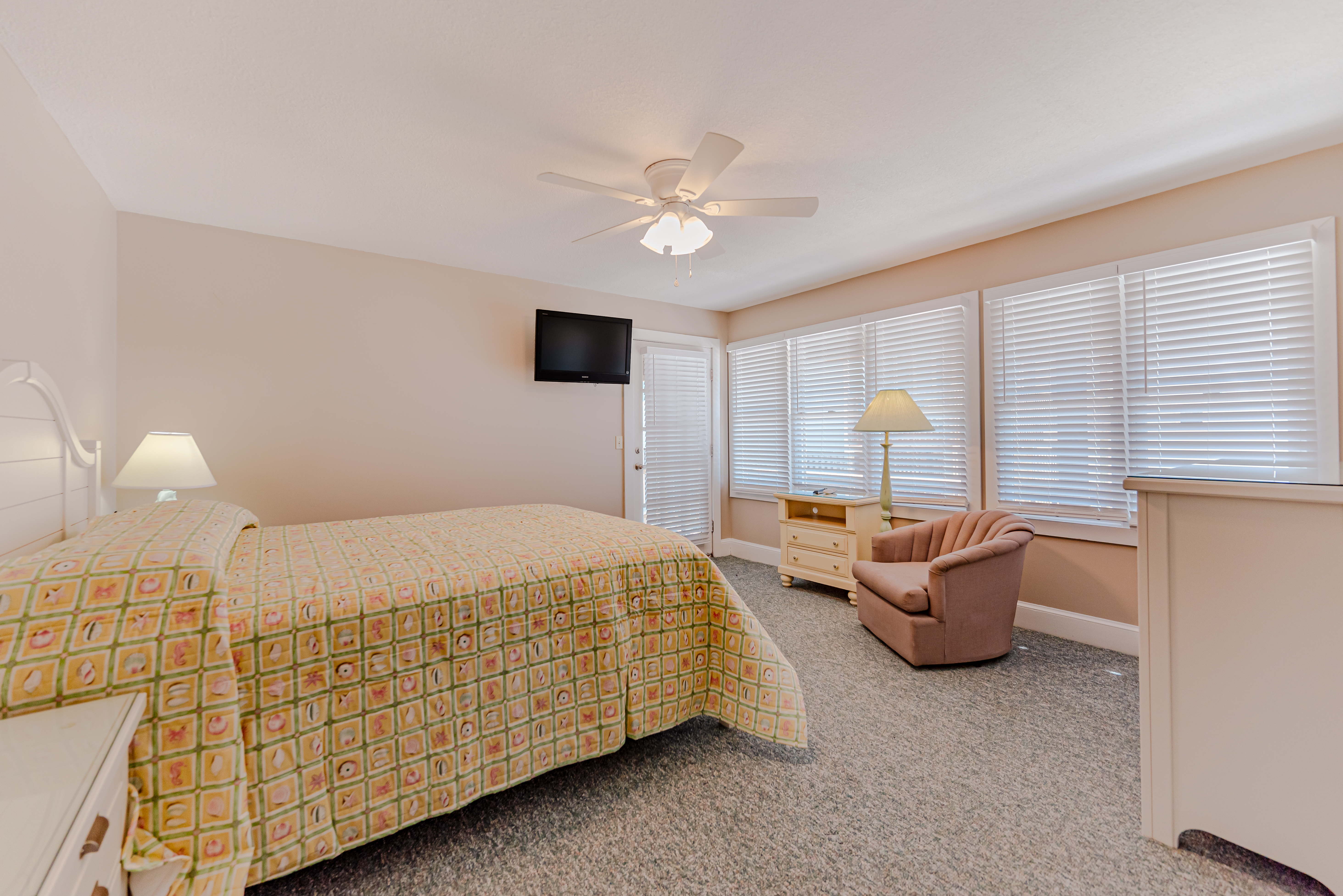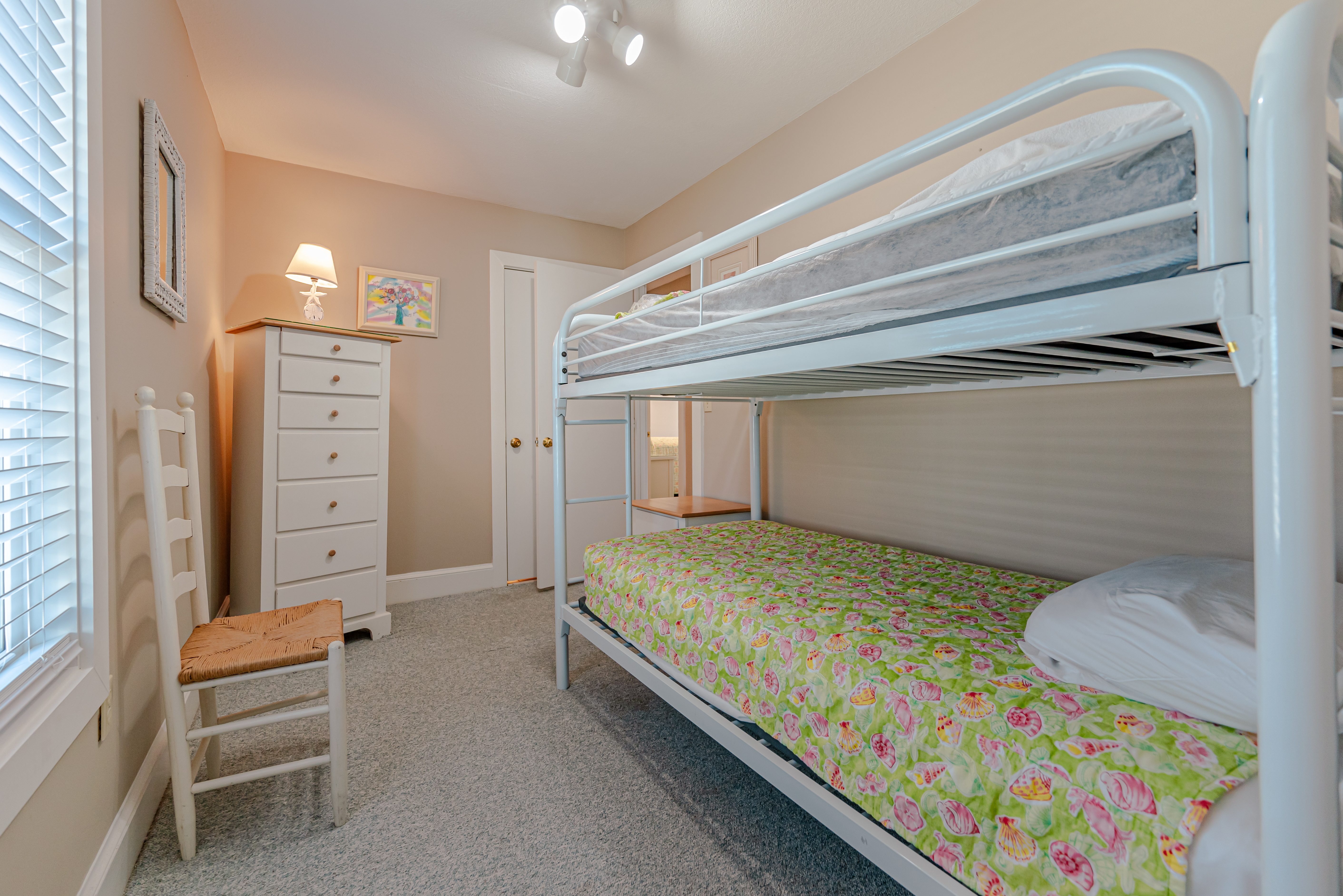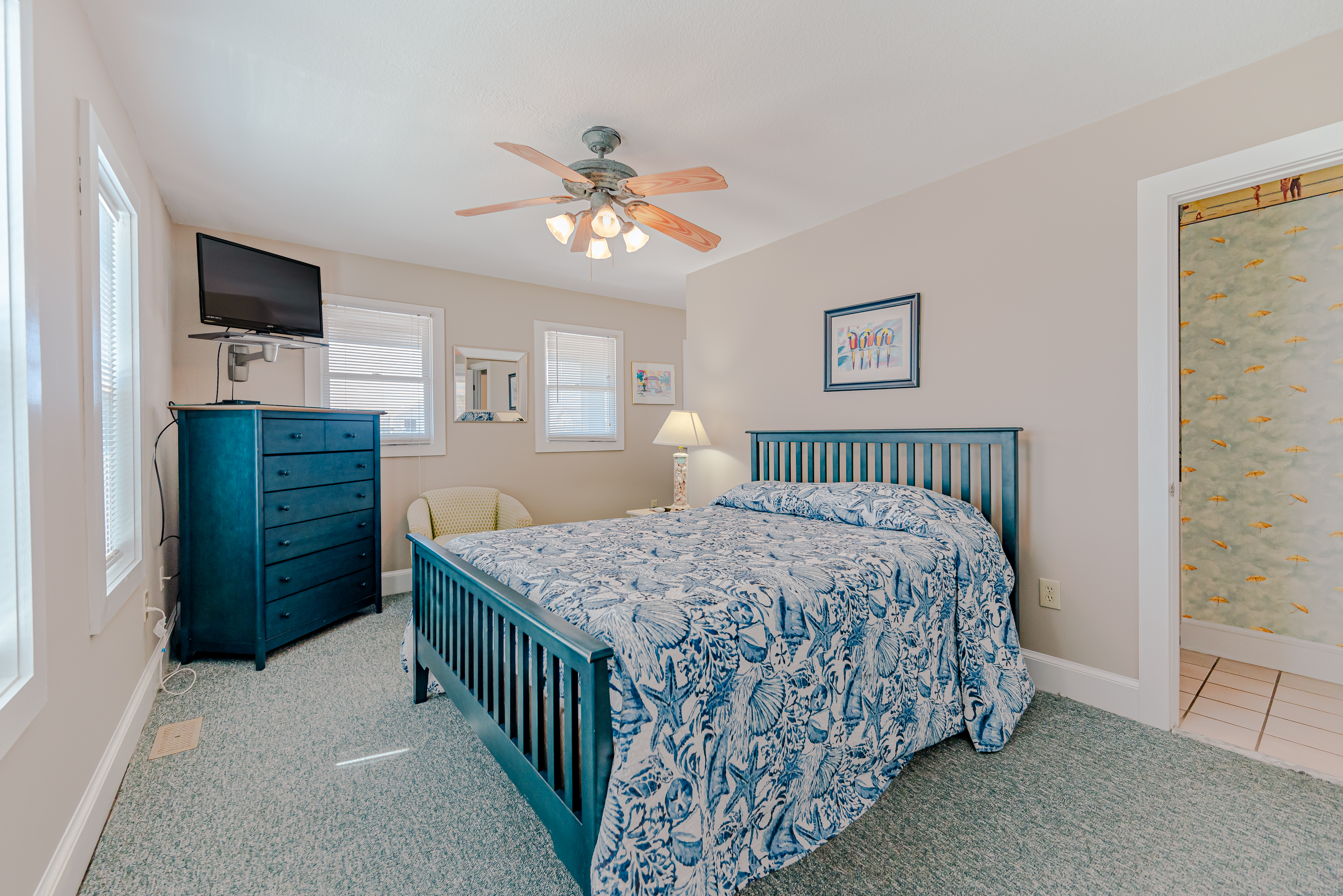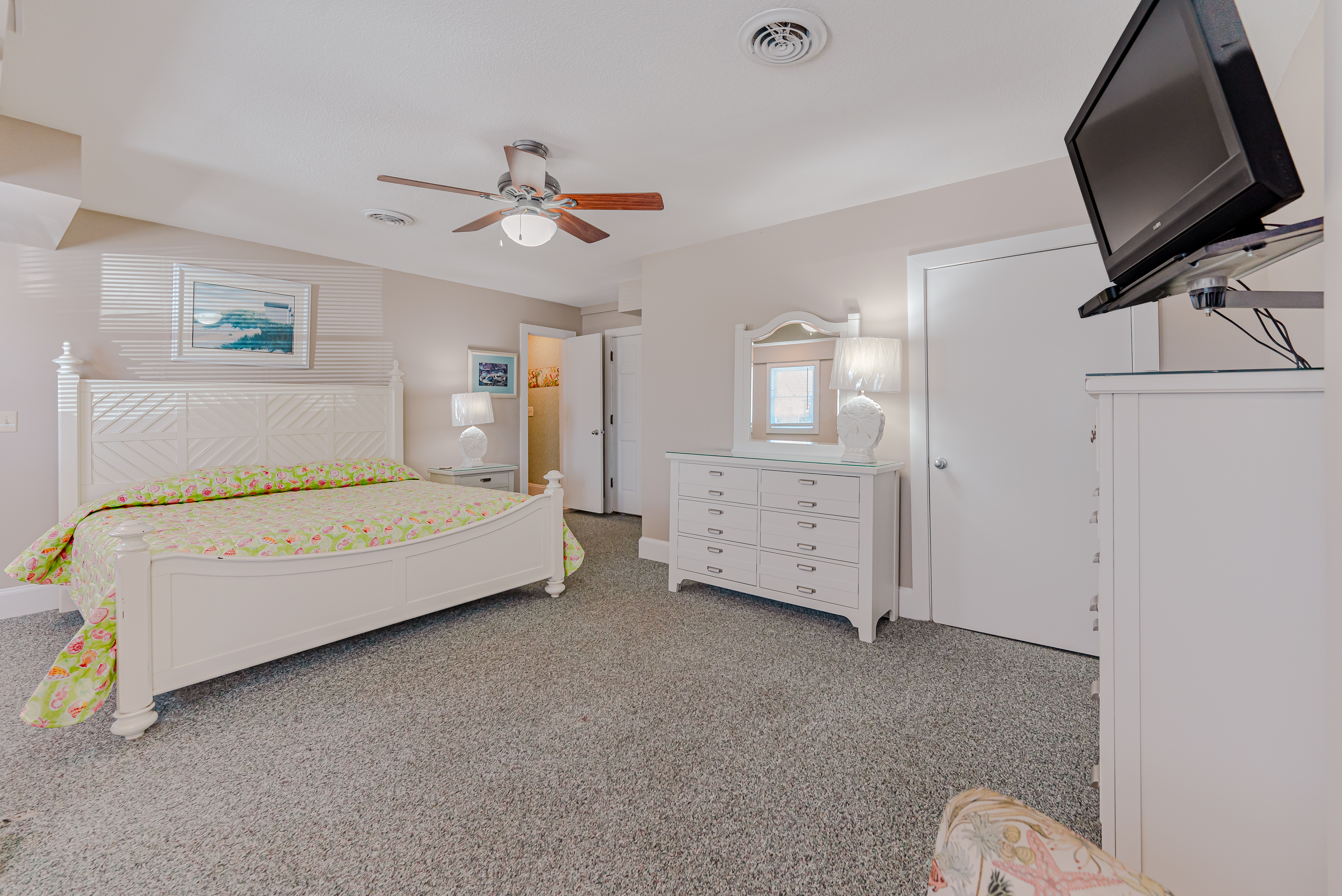 Mid Level: 4 Bedrooms (Private Suite w/King, Flat Screen TV, Full Bath w/Tub/Shower, Access to Deck; 1 w/Queen, Flat Screen TV, Access to Deck; Jack-n-Jill Full Bath w/Tub/Shower; 1 w/Queen, Access to Deck; 1 w/Bunk Set) Full Hall Bath w/Tub/Shower; Laundry Area, Wrap Around Covered Deck w/Deck Furniture and Steps to Private Walkway to Beach w/Dune Top Deck and Steps to Beach.