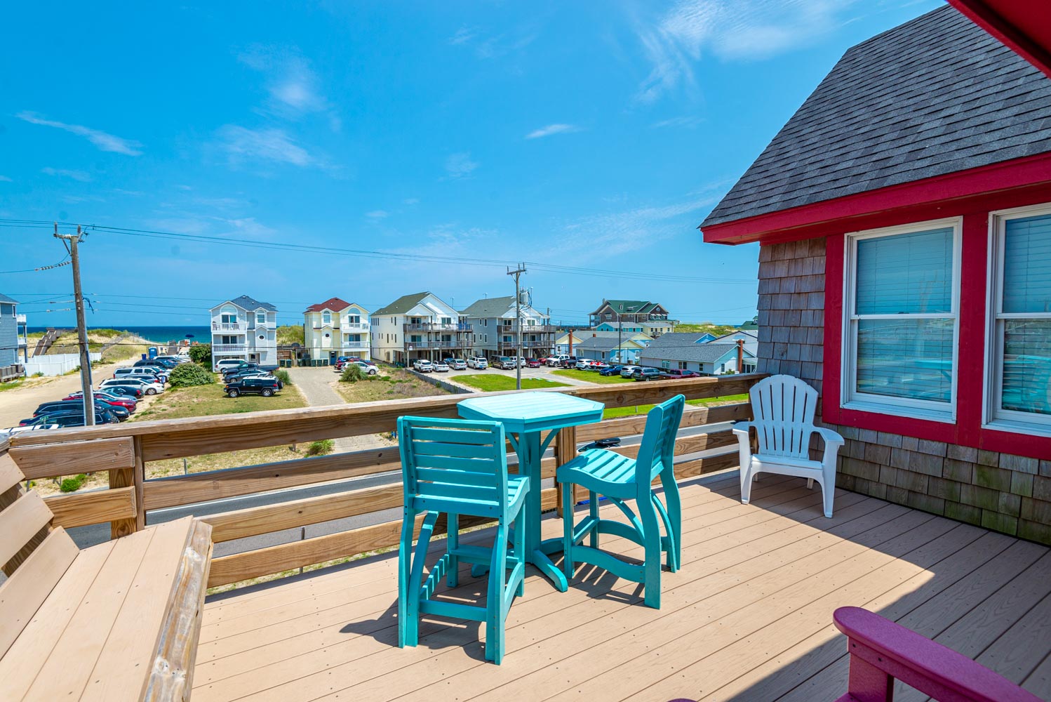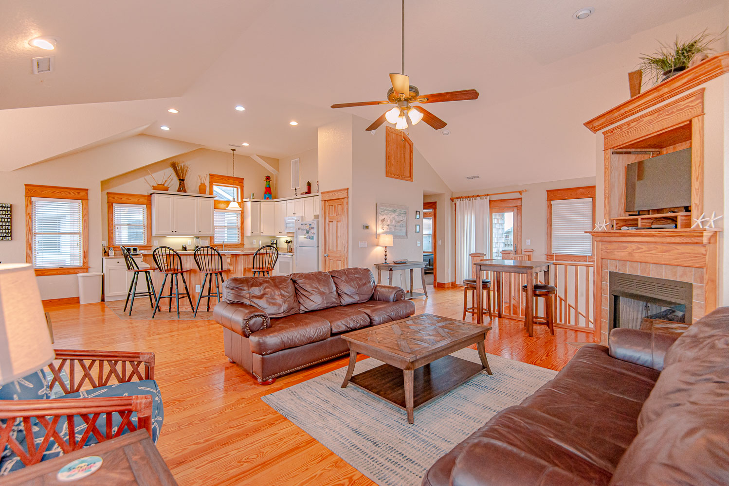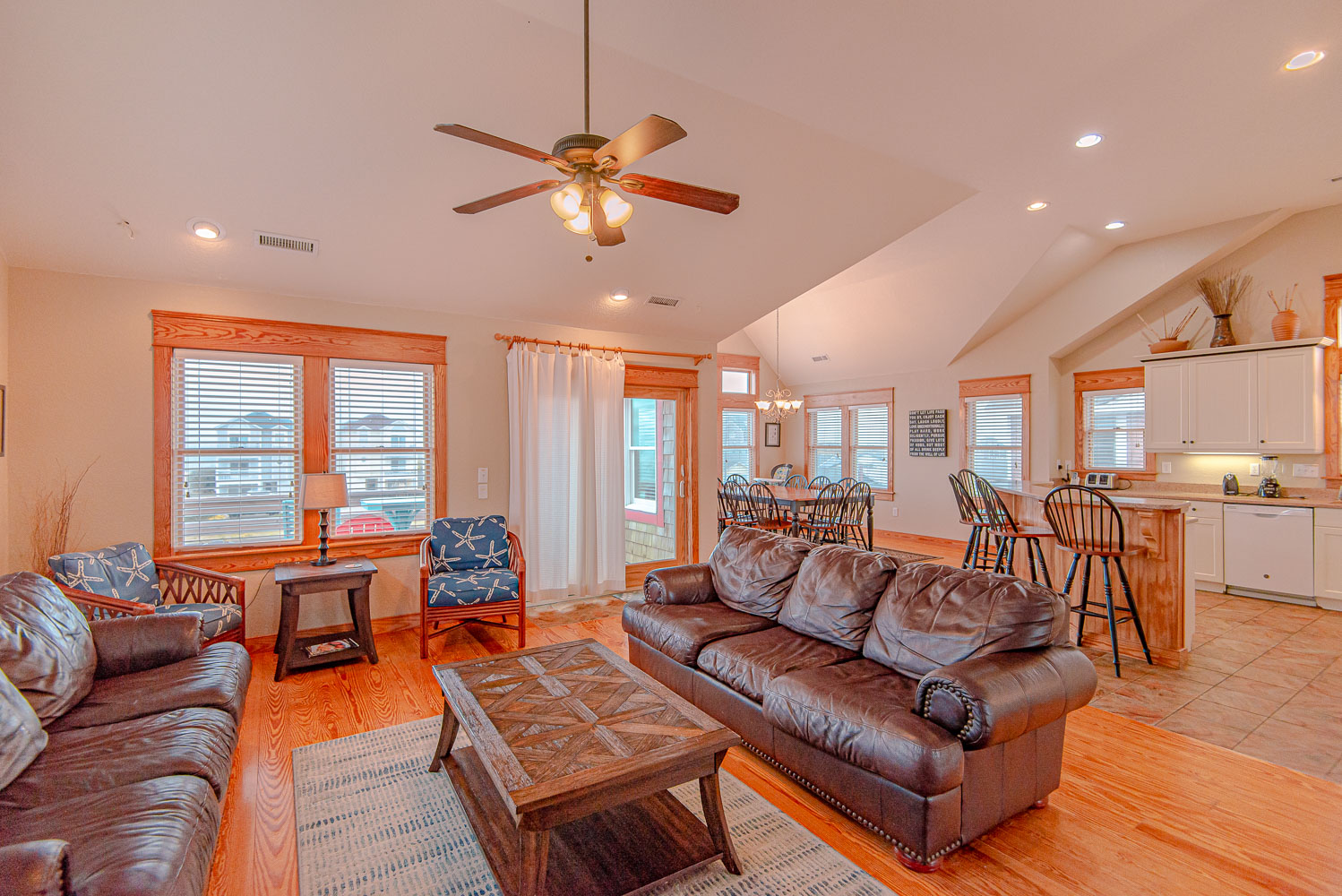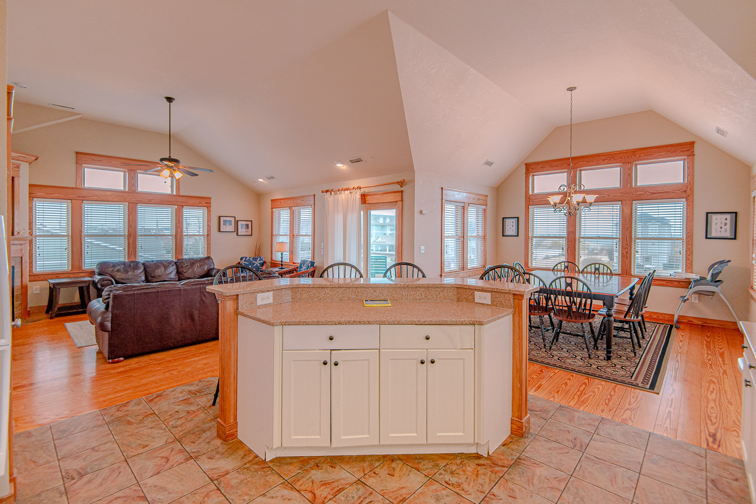 Top Level: Fantastic Living Area, TV, Leather Furniture, Beautiful Hardwood and Tile Floors, Cathedral Ceilings, Ocean to Sound Views; Very Well Equipped Kitchen w/Island Bar Seating for Four (4), New Cabinetry, Dining Area w/Seating for Ten (10); Half Bath, Private Suite w/King, TV, Full Bath w/Tub/Shower; Two Front Sun Decks w/Ocean Views, Built-In Benches, Furniture, and Back Sun Deck Overlooking Pool Area, Roanoke Sound Views, and Furniture.
