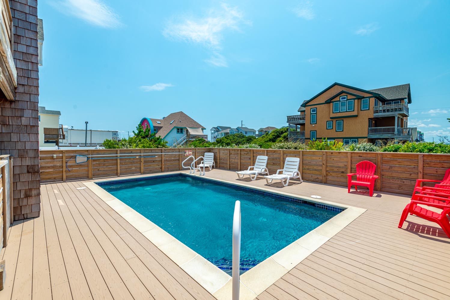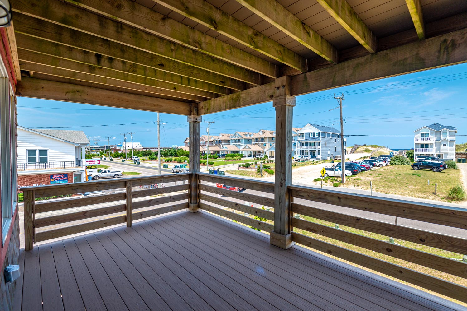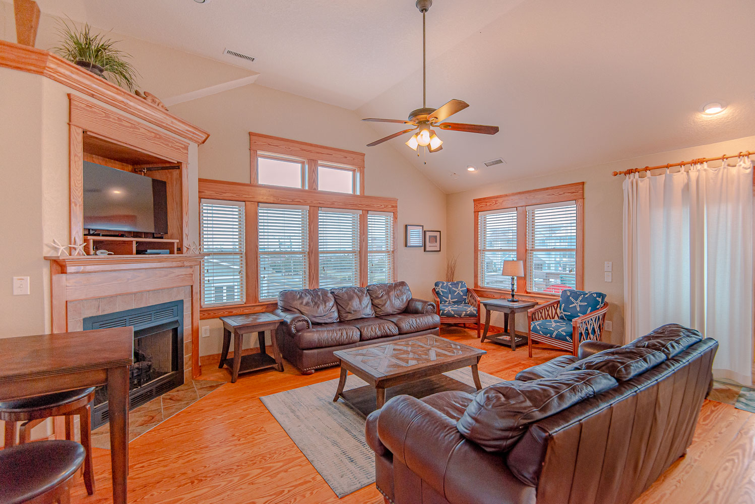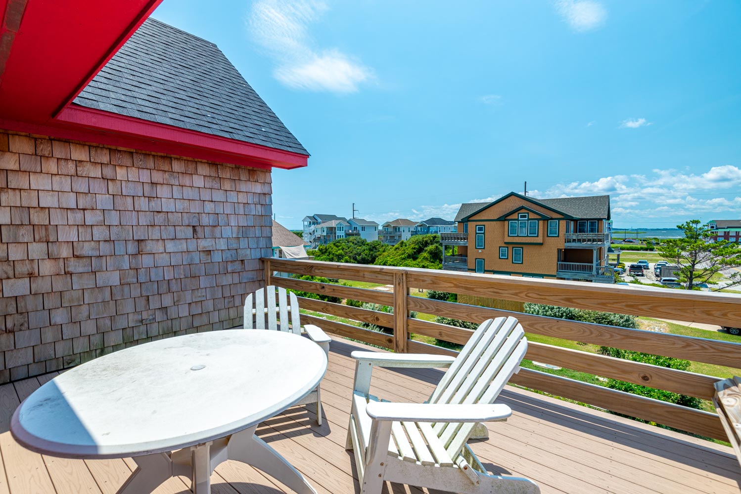 Top Level: Fantastic Living Area, TV, Leather Furniture, Beautiful Hardwood and Tile Floors, Cathedral Ceilings, Ocean to Sound Views; Very Well Equipped Kitchen w/Island Bar Seating for Four (4), New Cabinetry, Dining Area w/Seating for Ten (10); Half Bath, Private Suite w/King, TV, Full Bath w/Tub/Shower; Two Front Sun Decks w/Ocean Views, Built-In Benches, Furniture, and Back Sun Deck Overlooking Pool Area, Roanoke Sound Views, and Furniture.