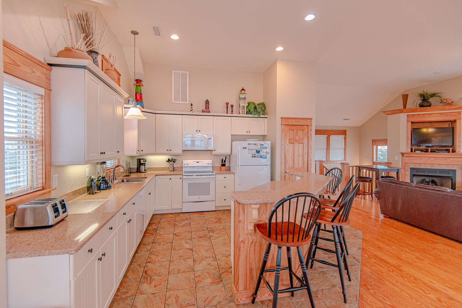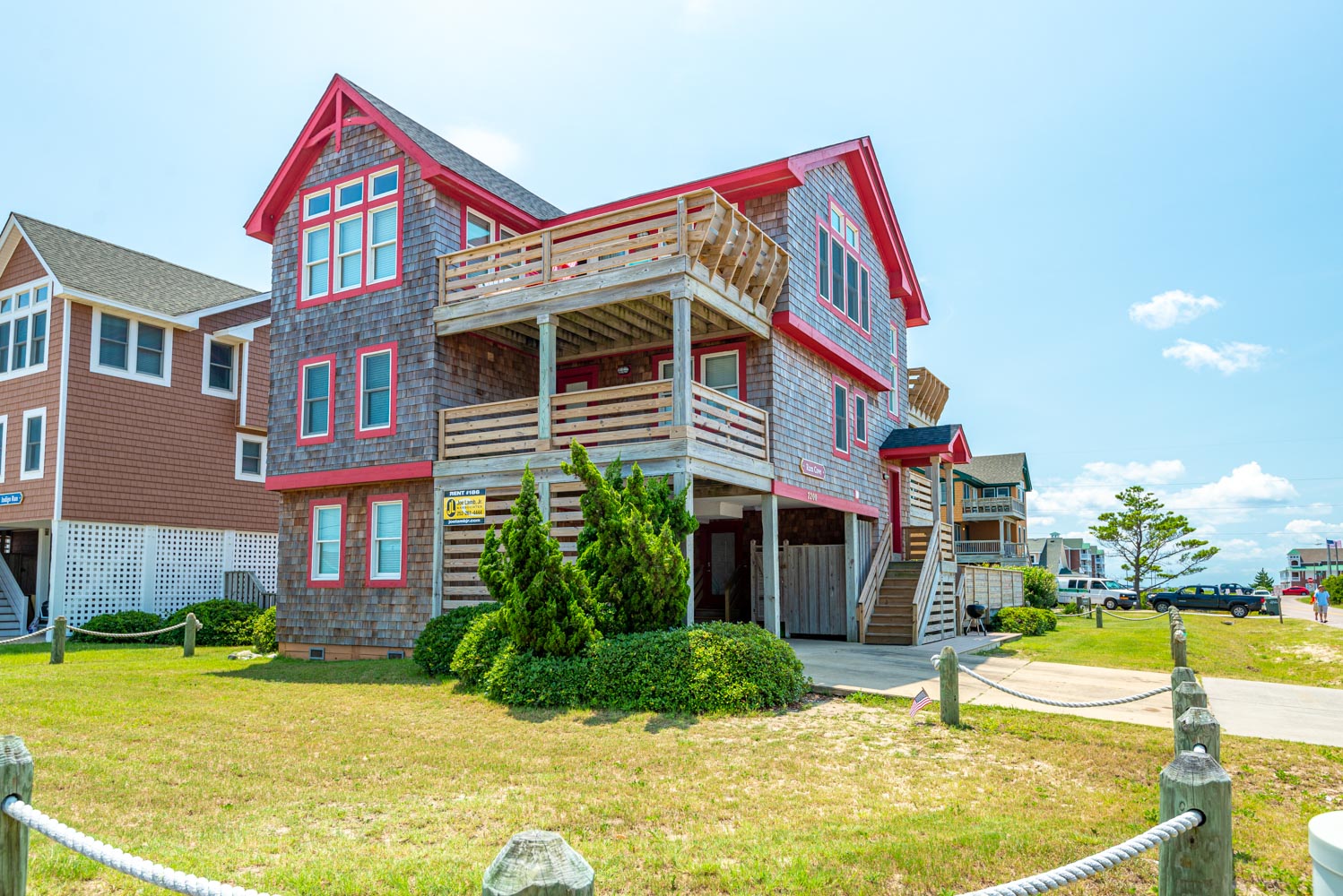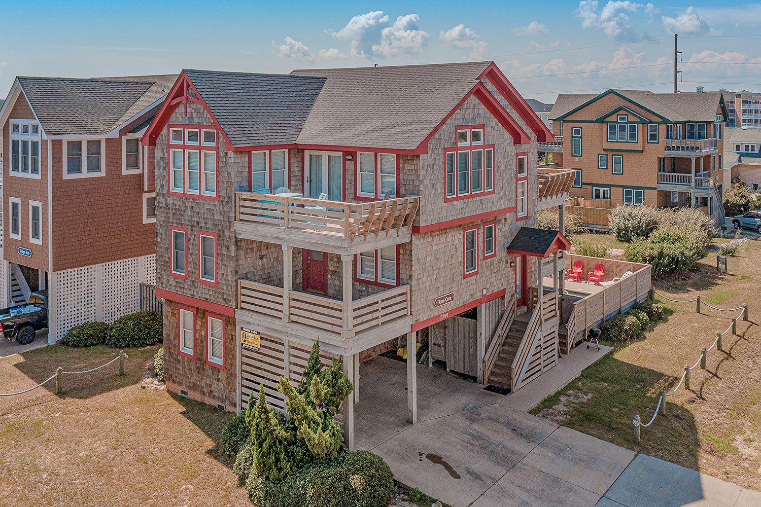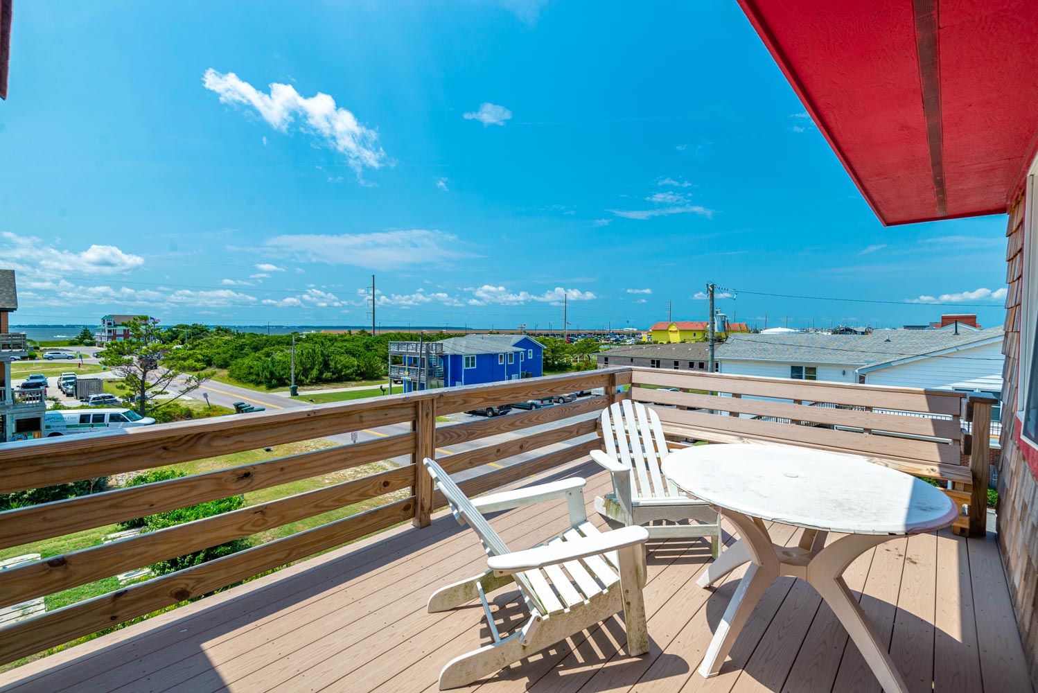 Top Level: Fantastic Living Area, TV, Leather Furniture, Beautiful Hardwood and Tile Floors, Cathedral Ceilings, Ocean to Sound Views; Very Well Equipped Kitchen w/Island Bar Seating for Four (4), New Cabinetry, Dining Area w/Seating for Ten (10); Half Bath, Private Suite w/King, TV, Full Bath w/Tub/Shower; Two Front Sun Decks w/Ocean Views, Built-In Benches, Furniture, and Back Sun Deck Overlooking Pool Area, Roanoke Sound Views, and Furniture.