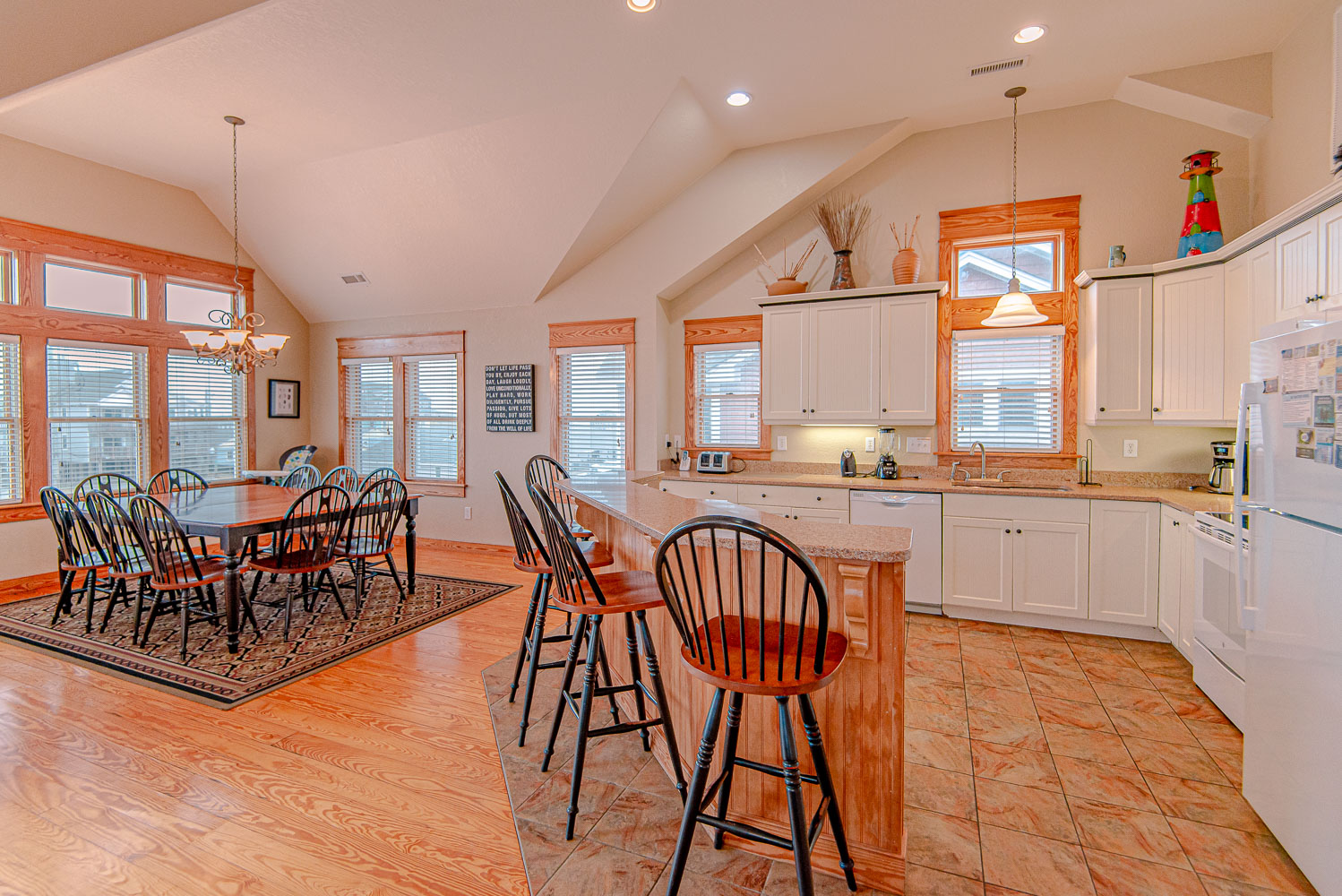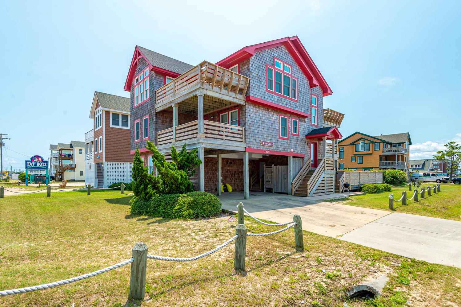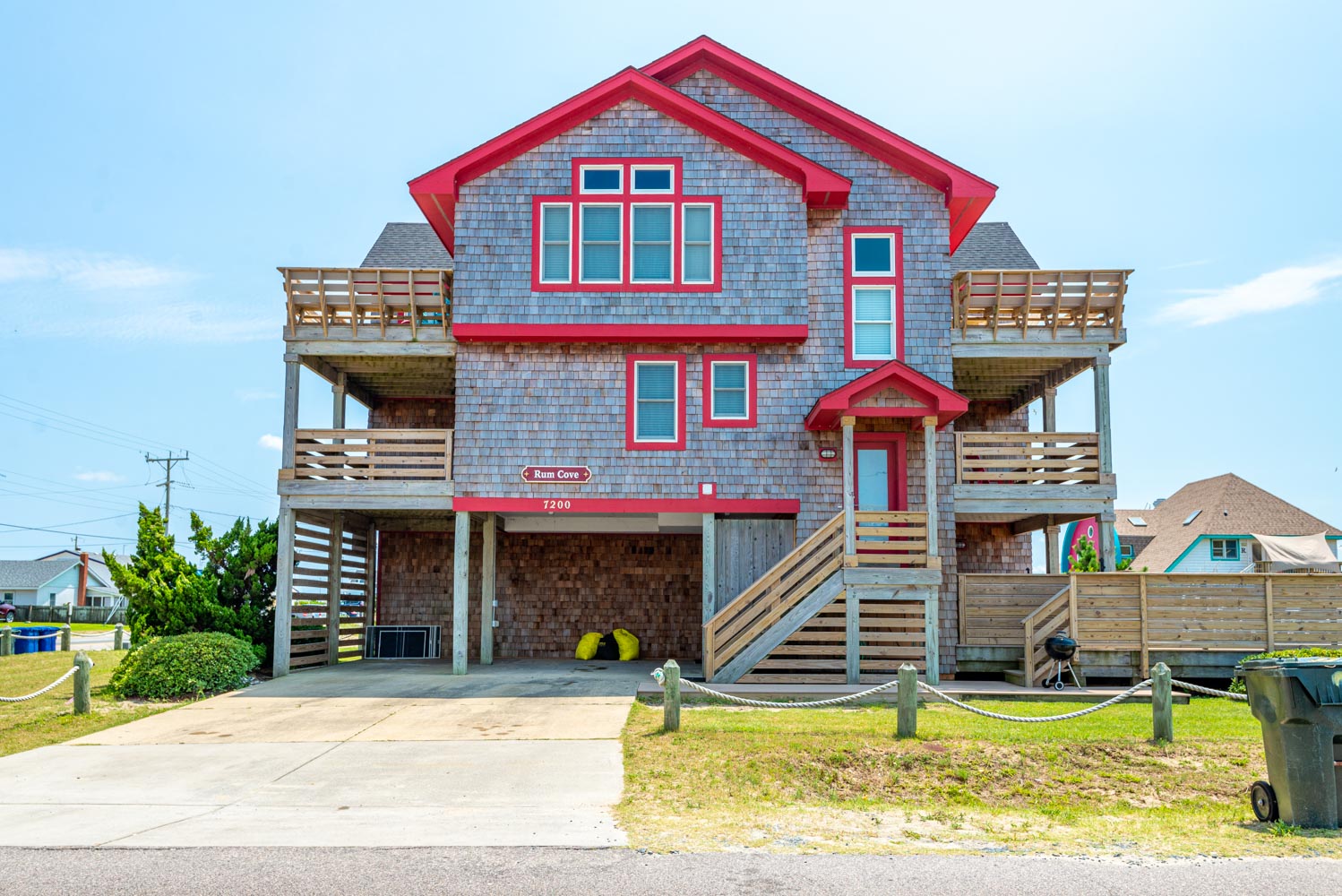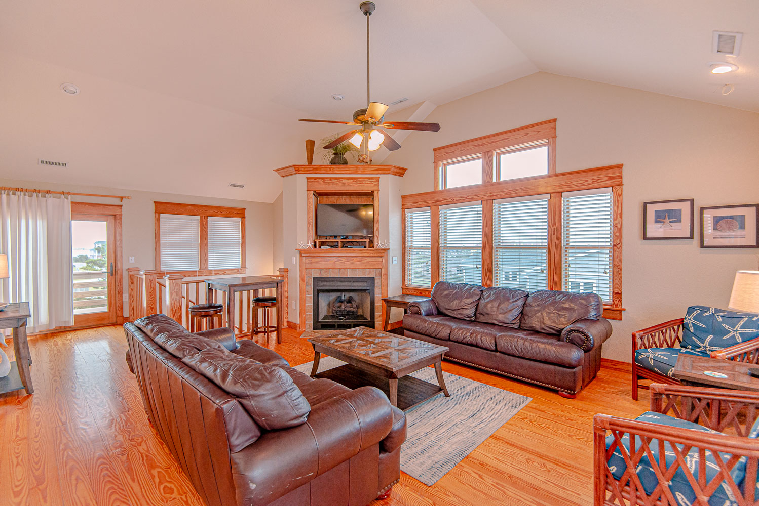 Top Level: Fantastic Living Area, TV, Leather Furniture, Beautiful Hardwood and Tile Floors, Cathedral Ceilings, Ocean to Sound Views; Very Well Equipped Kitchen w/Island Bar Seating for Four (4), New Cabinetry, Dining Area w/Seating for Ten (10); Half Bath, Private Suite w/King, TV, Full Bath w/Tub/Shower; Two Front Sun Decks w/Ocean Views, Built-In Benches, Furniture, and Back Sun Deck Overlooking Pool Area, Roanoke Sound Views, and Furniture.
