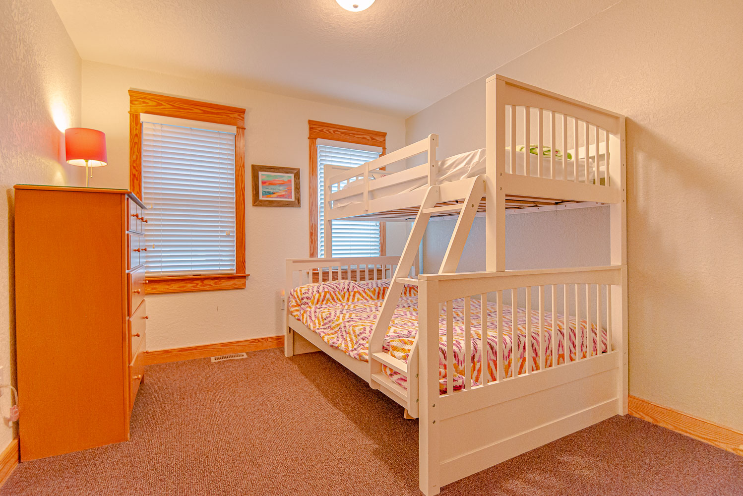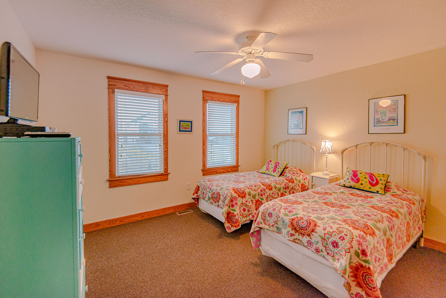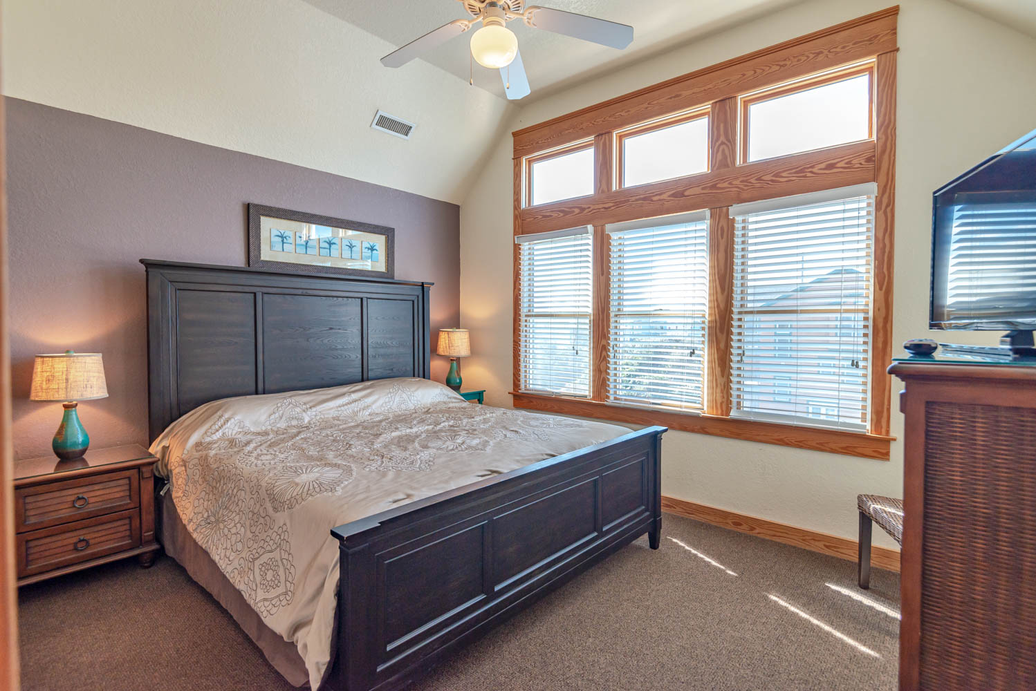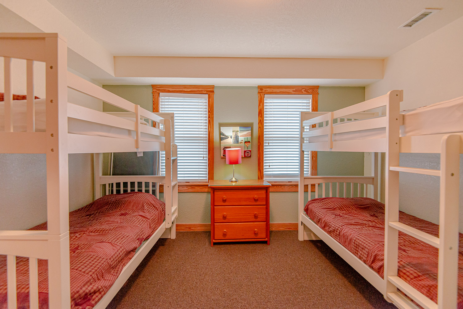 Mid Level: 4 Bedrooms (Private Suite w/King, TV Full Bath w/Tub/Shower, Private Suite w/Queen, TV, Full Bath w/Tub/Shower, Private Suite w/Duo Bunk, Full Bath w/Walk-In Shower; Private Suite w/2 Singles, TV, Full Bath w/Tub/Shower), Front Covered Deck, and Back Covered Deck w/Deck Furniture Overlooking Pool Area.