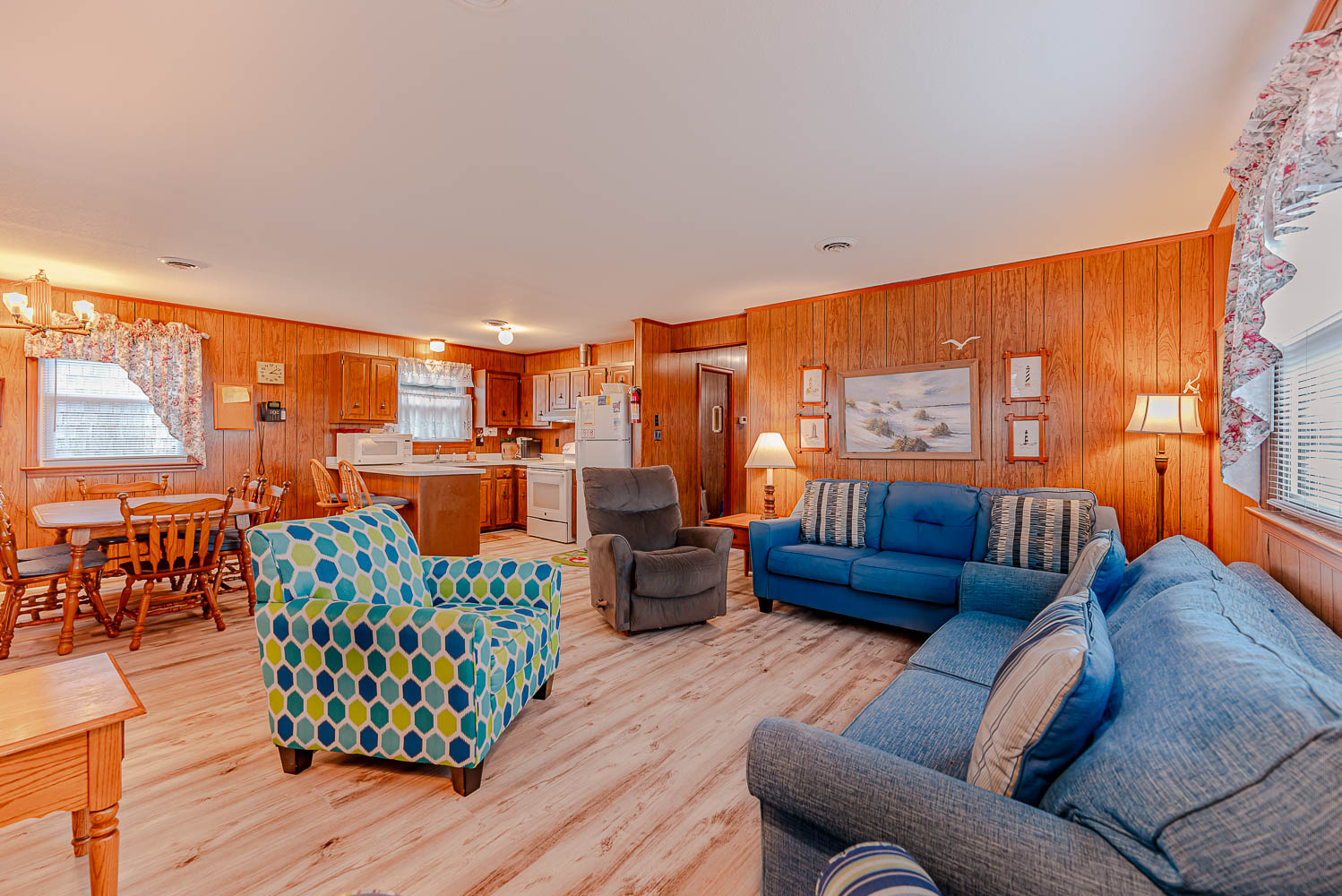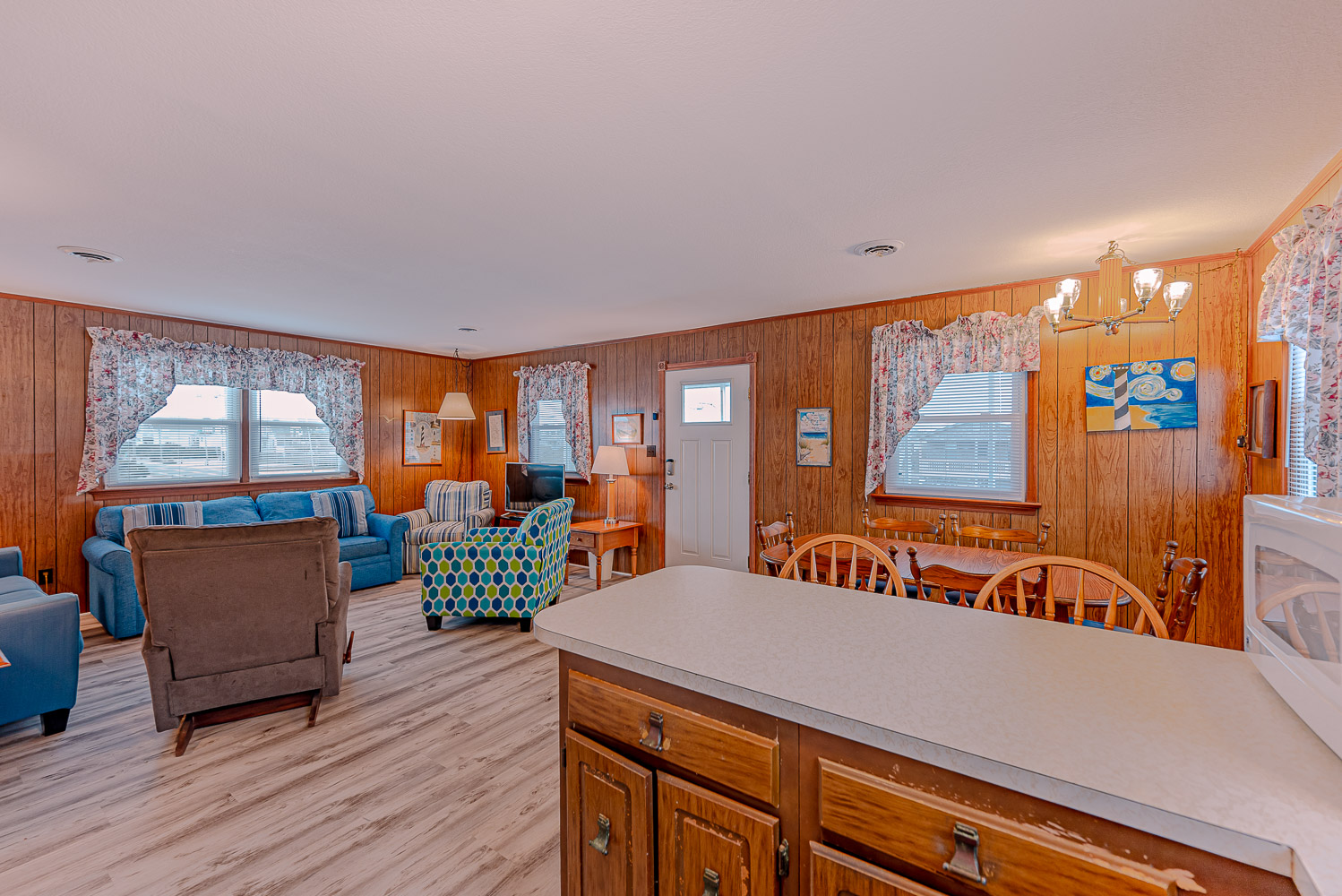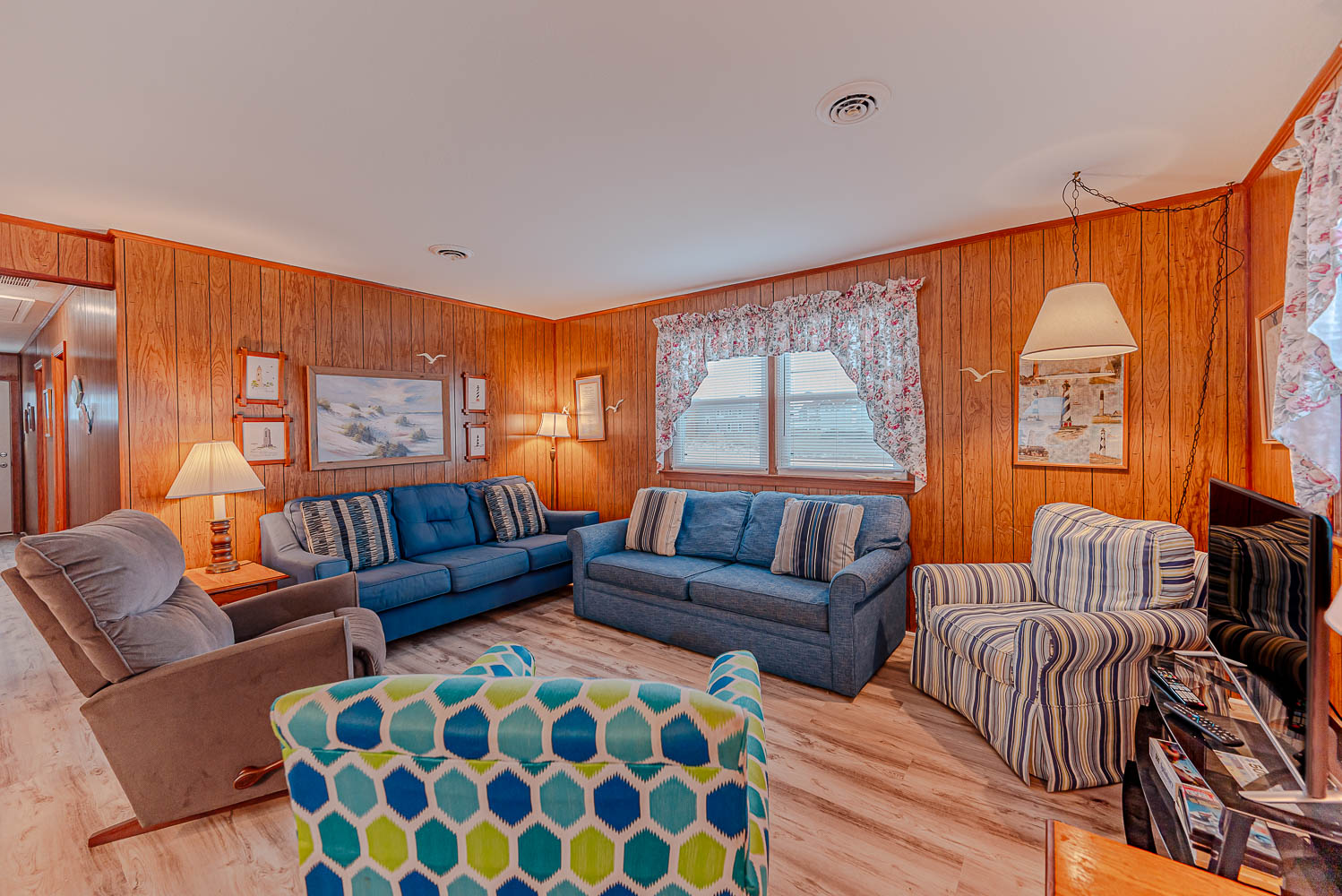 Main Level: Living/Dining/Kitchen Area, 43 Inch TV, 3 Bedrooms (2 w/Queens, 1 w/Queen, 28 Inch TV), Full Hall Bath w/Walk-In Shower; Full Hall Bath w/Tub/Shower; Screen Porch w/Table, Chairs; and Sun Deck w/Built-In Seating.