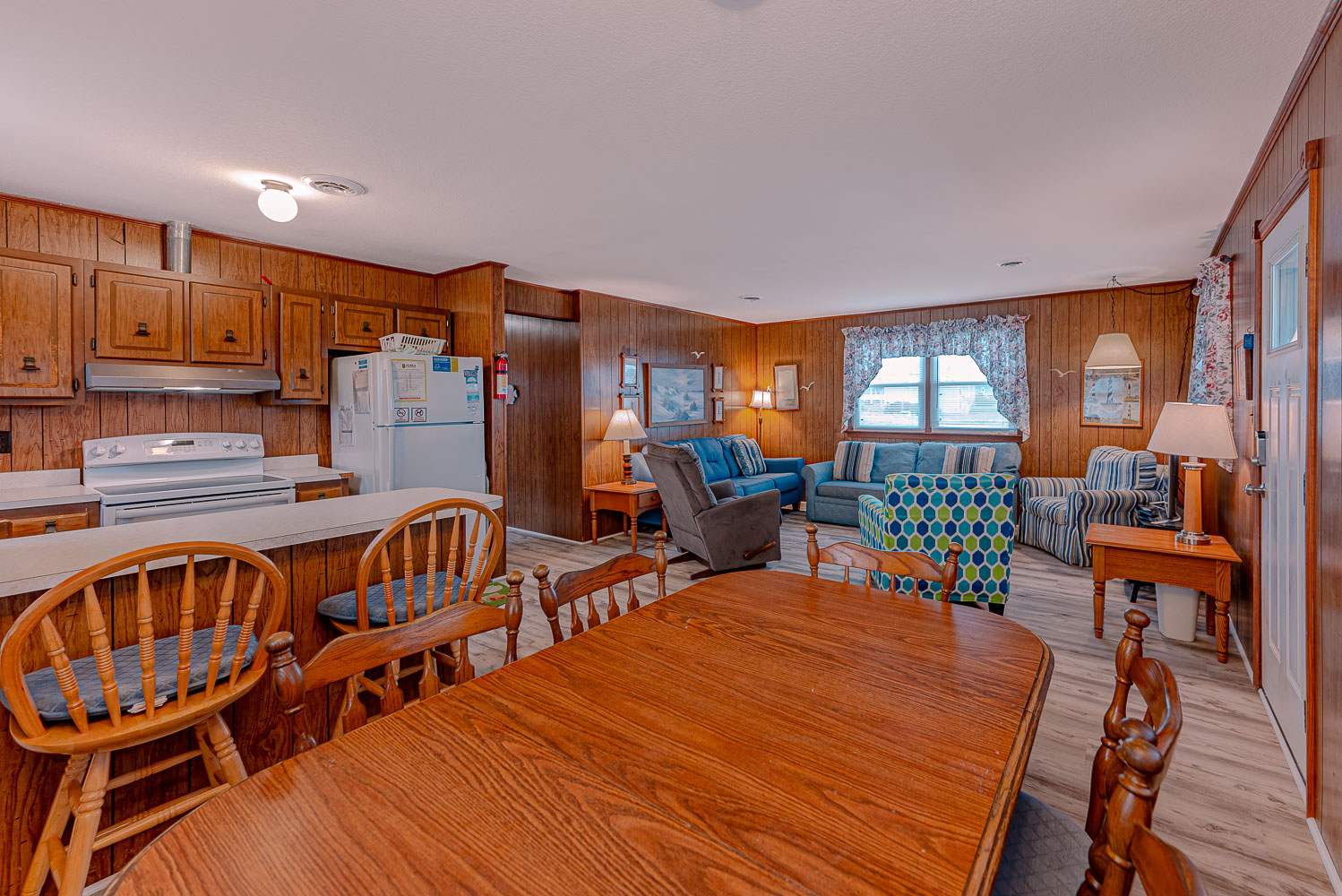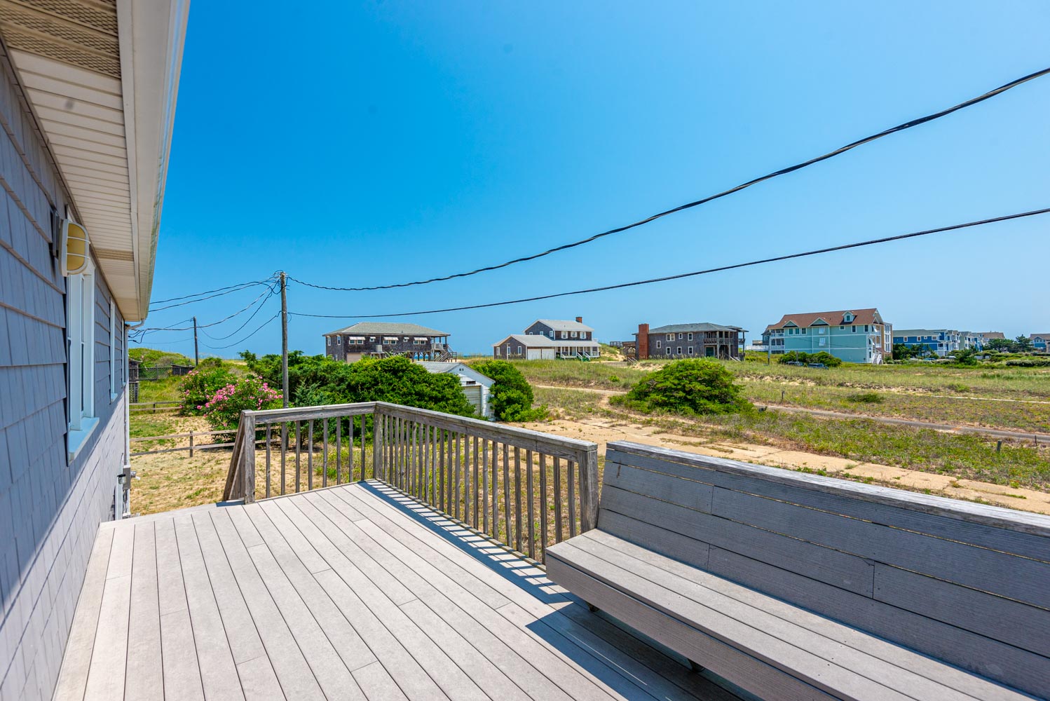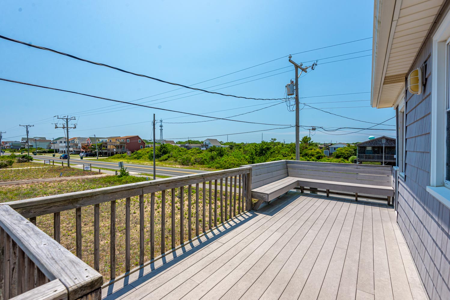Main Level: Living/Dining/Kitchen Area, 43 Inch TV, 3 Bedrooms (2 w/Queens, 1 w/Queen, 28 Inch TV), Full Hall Bath w/Walk-In Shower; Full Hall Bath w/Tub/Shower; Screen Porch w/Table, Chairs; and Sun Deck w/Built-In Seating.