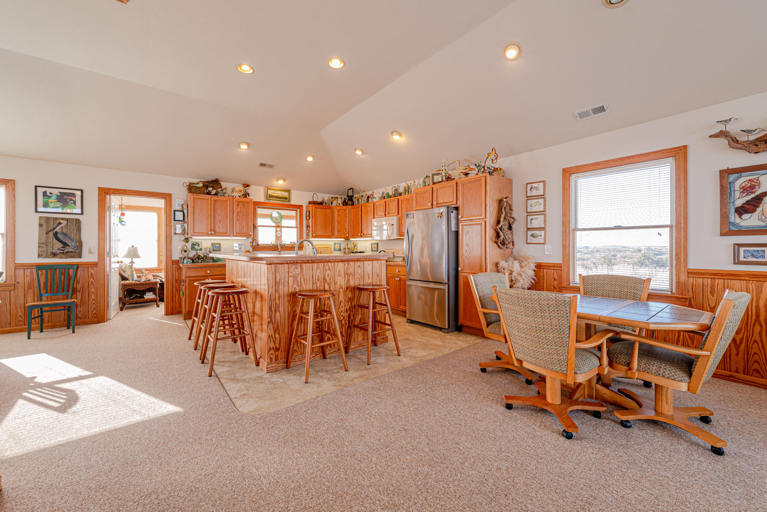 The top level boasts an open Living/Dining/Kitchen area with screened porch, sun deck, sunroom, and observation deck. The views are spectacular and there is plenty of space for your group! The mid-level has four bedrooms, covered porch and the main entry to the home. Ample parking, enclosed outside shower and fishing cleaning station are on the ground level.
