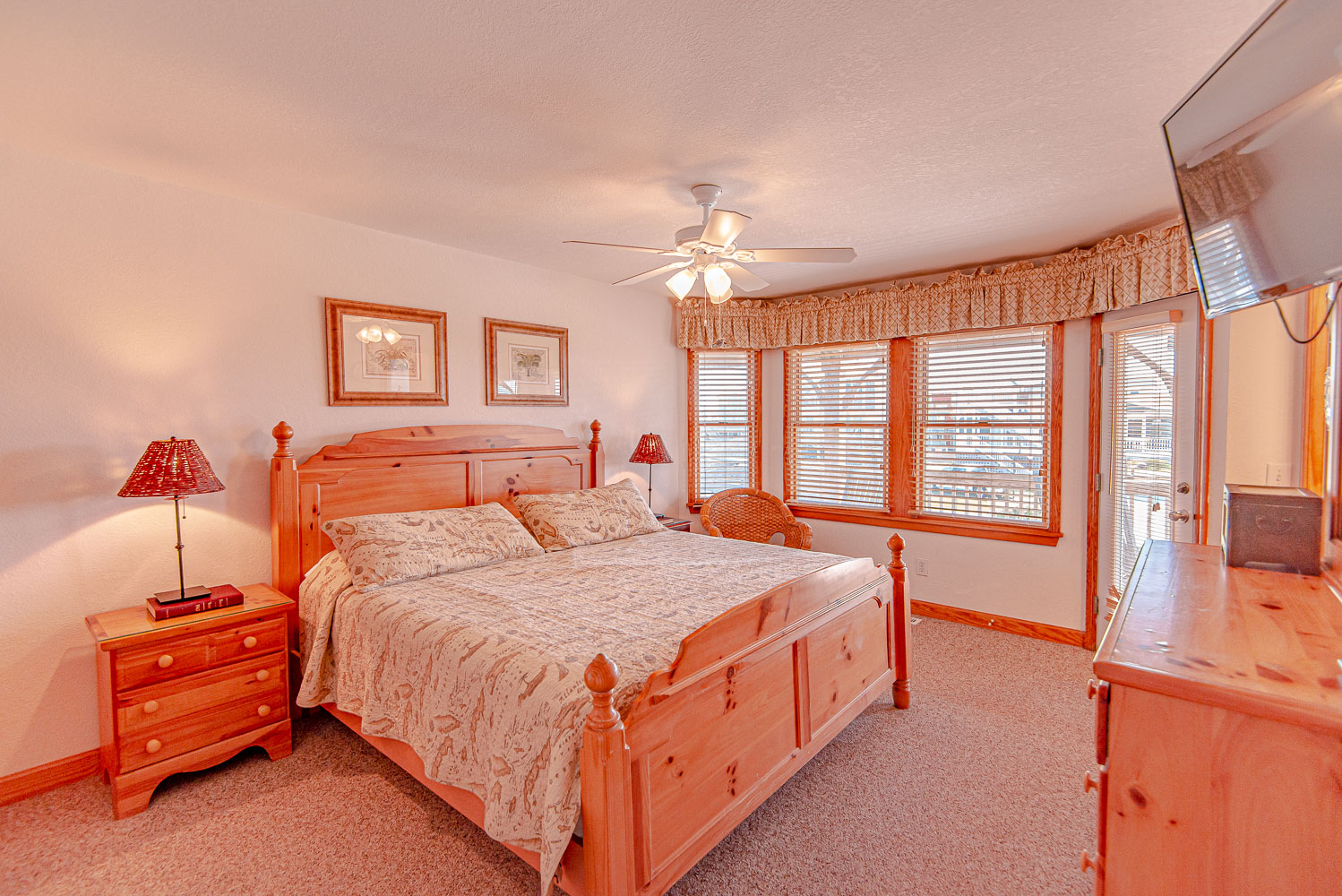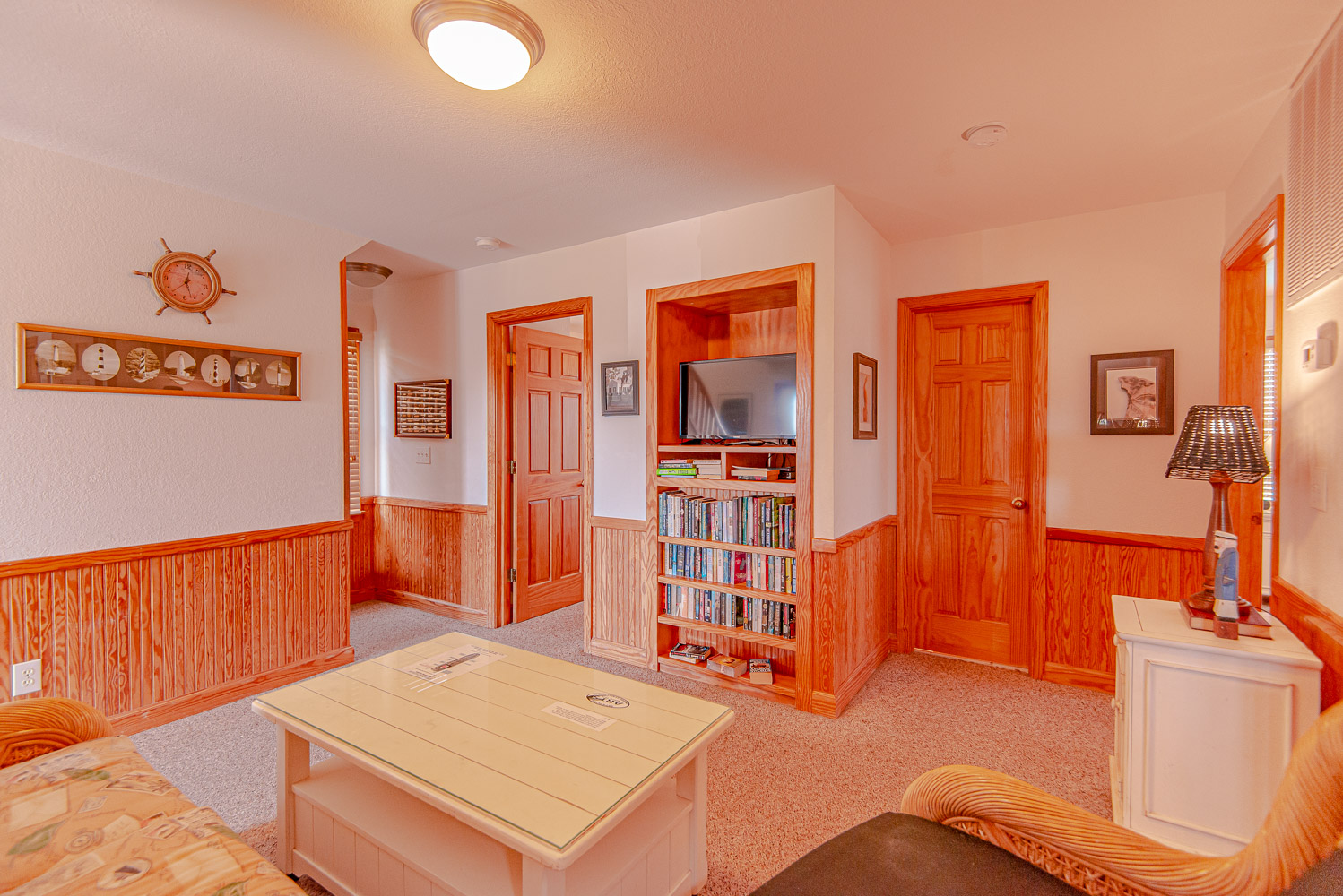 Mid Level: 3 Bedrooms (Private Suite w/King, TV, Full Bath w/Tub; 2 w/Kings, TVs), Shared Full Bath w/Tub, a Den, TV, Sleep Sofa, and Covered Deck.