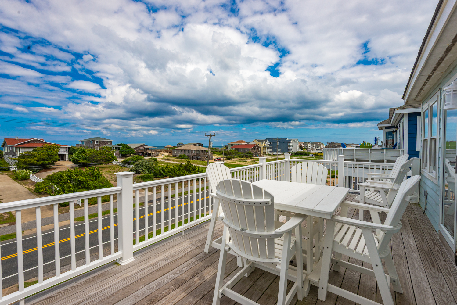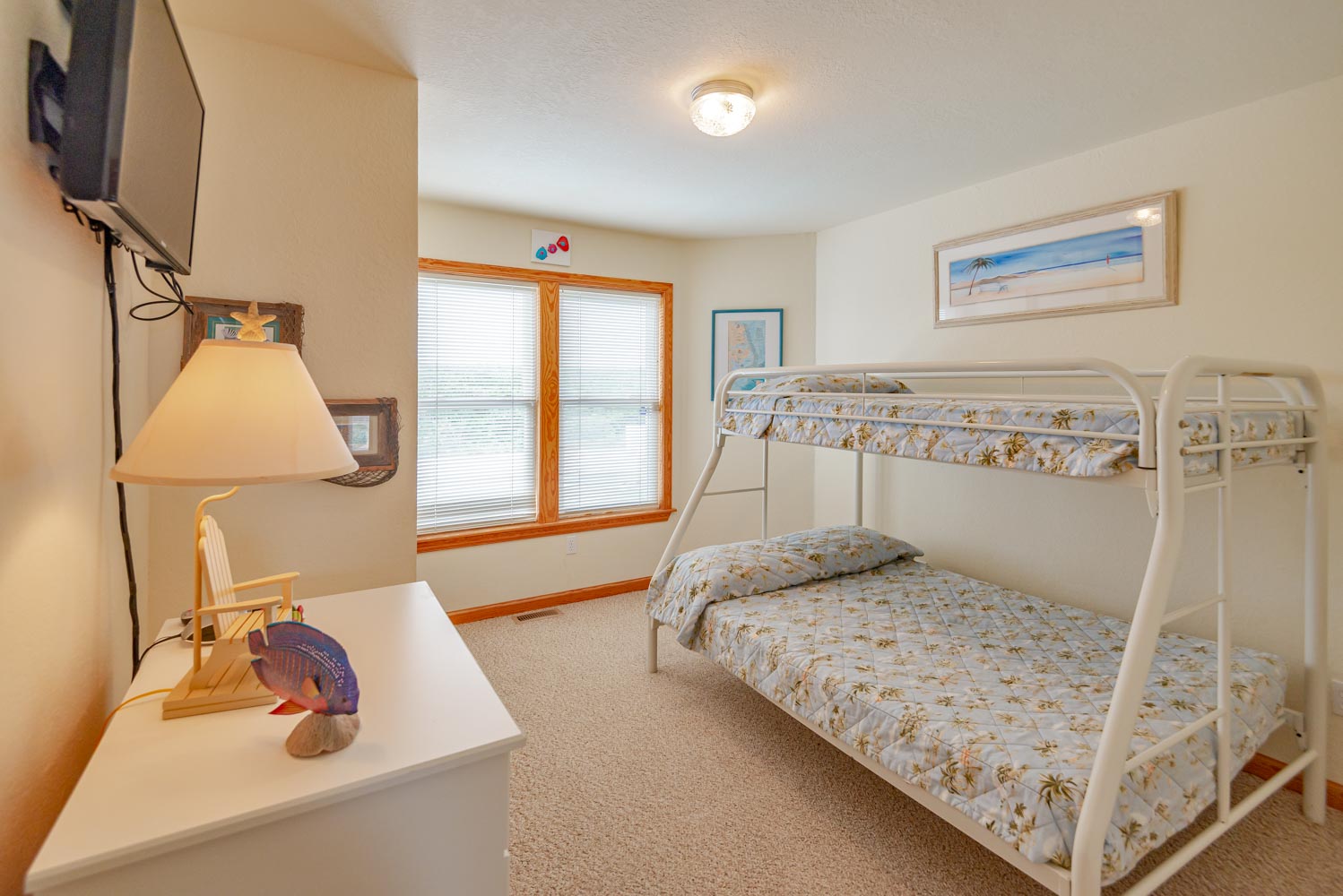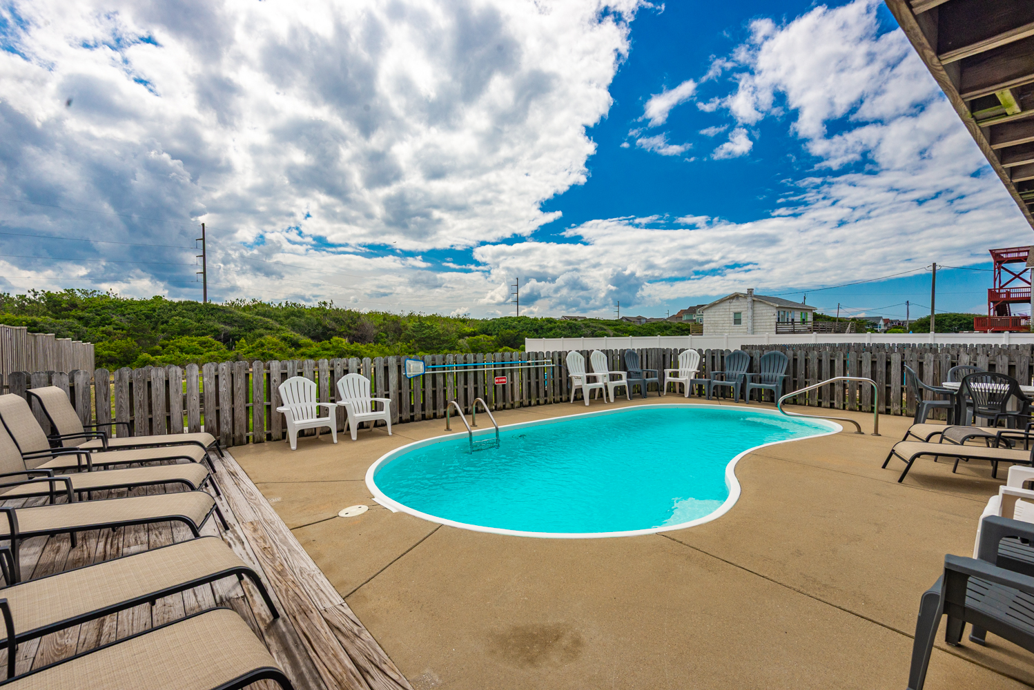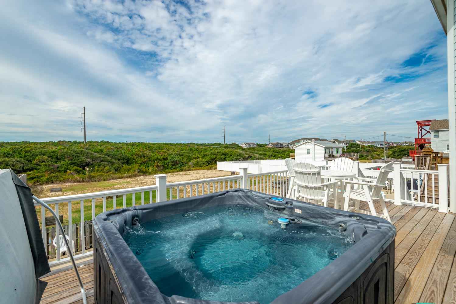 Mid Level: 3 Bedrooms (Private Suite w/King, TV, Full Bath w/Jacuzzi Tub; 1 w/Queen,& TV, 1 w/ Duo Bunk & TV), Shared Full Hall Bath w/Tub/Shower, Laundry Area, Living Area w/TV, Wet Bar, & Access to Front Covered Deck w/Ocean Views & Deck Furniture & Rear Sun Deck w/Hot Tub Overlooking Pool & Table & Chairs.