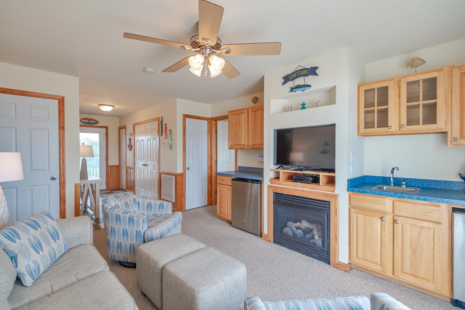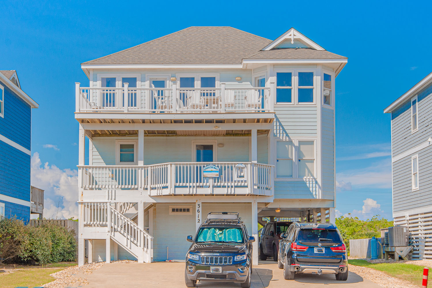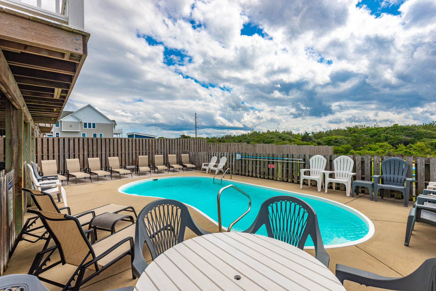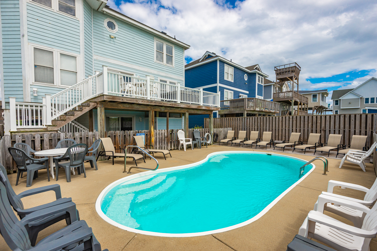 Mid Level: 3 Bedrooms (Private Suite w/King, TV, Full Bath w/Jacuzzi Tub; 1 w/Queen,& TV, 1 w/ Duo Bunk & TV), Shared Full Hall Bath w/Tub/Shower, Laundry Area, Living Area w/TV, Wet Bar, & Access to Front Covered Deck w/Ocean Views & Deck Furniture & Rear Sun Deck w/Hot Tub Overlooking Pool & Table & Chairs.