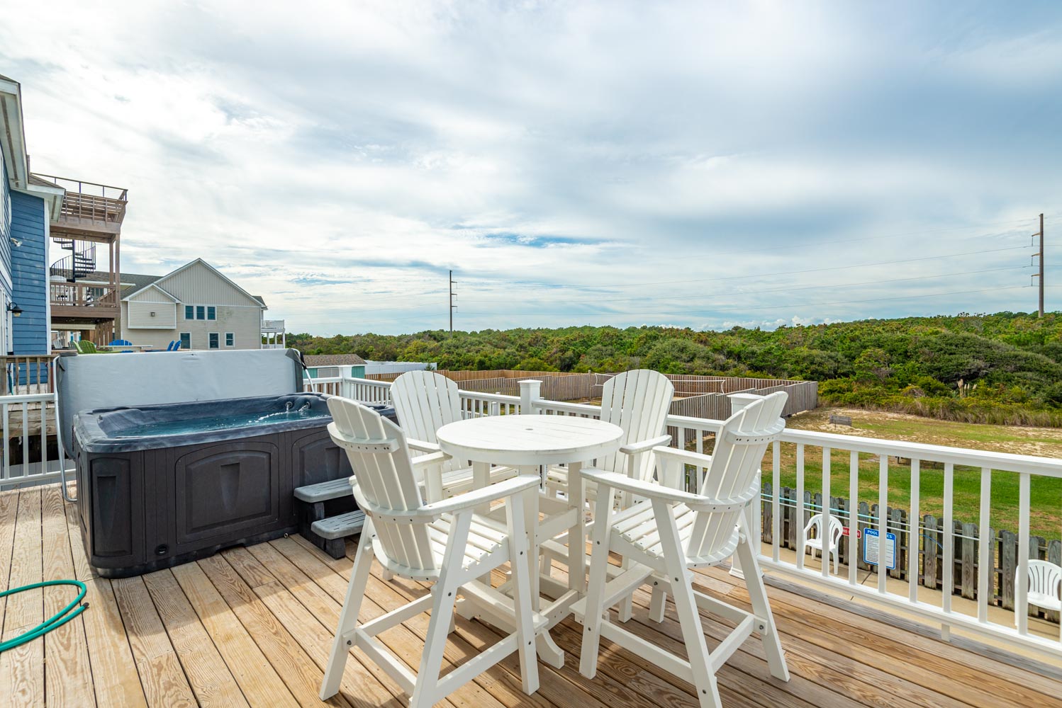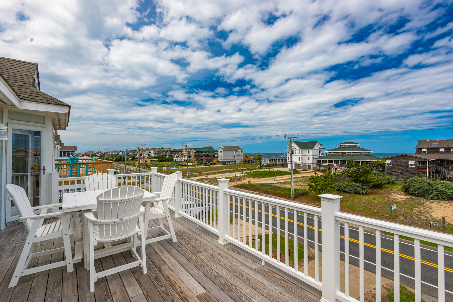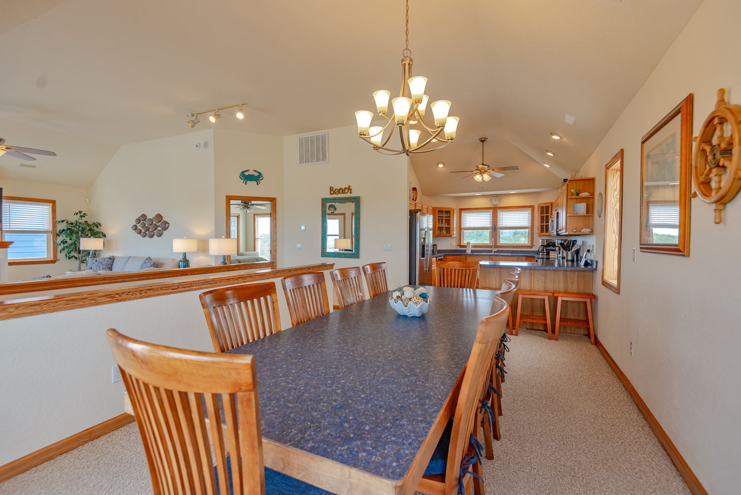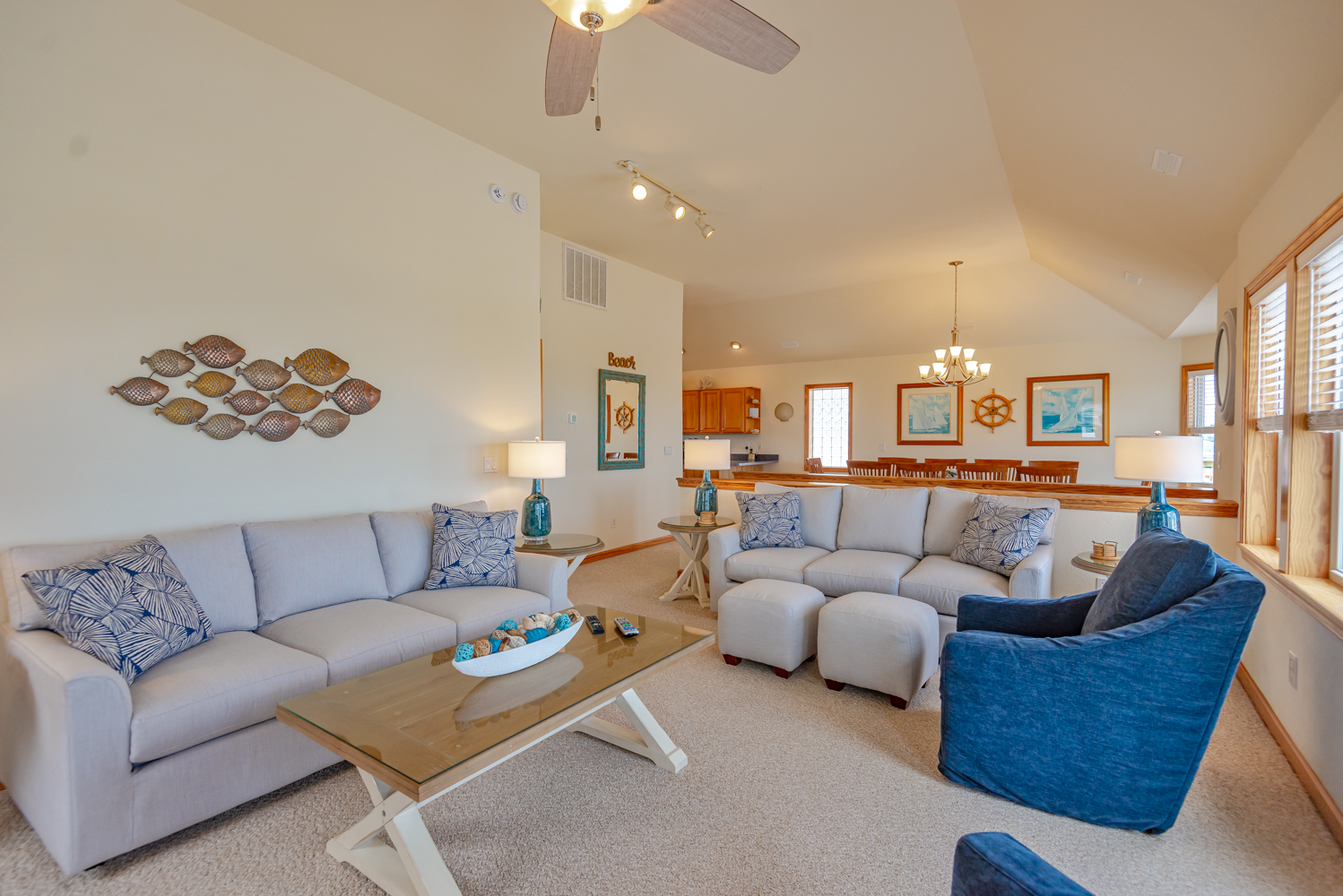 Top Level: Living Area w/TV, Kitchen Area w/Stainless Steel Appliances, Bar Seating for Two (2), Dining Area w/Seating for Ten (10), Private Suite w/King, TV, Full Bath w/Jacuzzi Tub; & Access to Sun Deck w/Ocean Views & Deck Furniture.