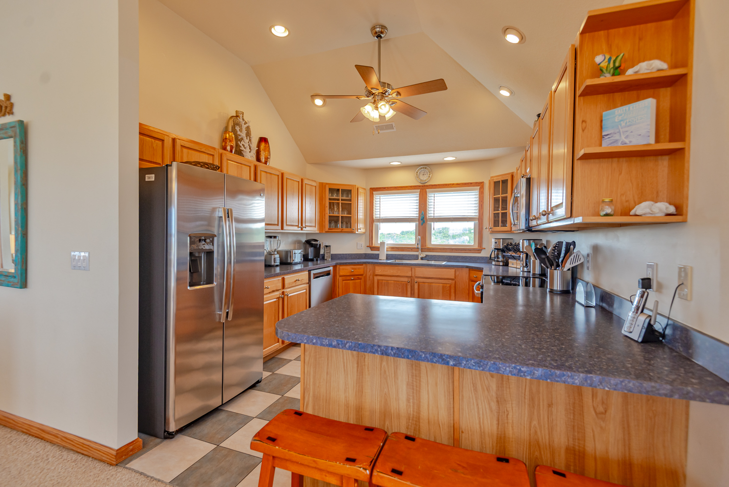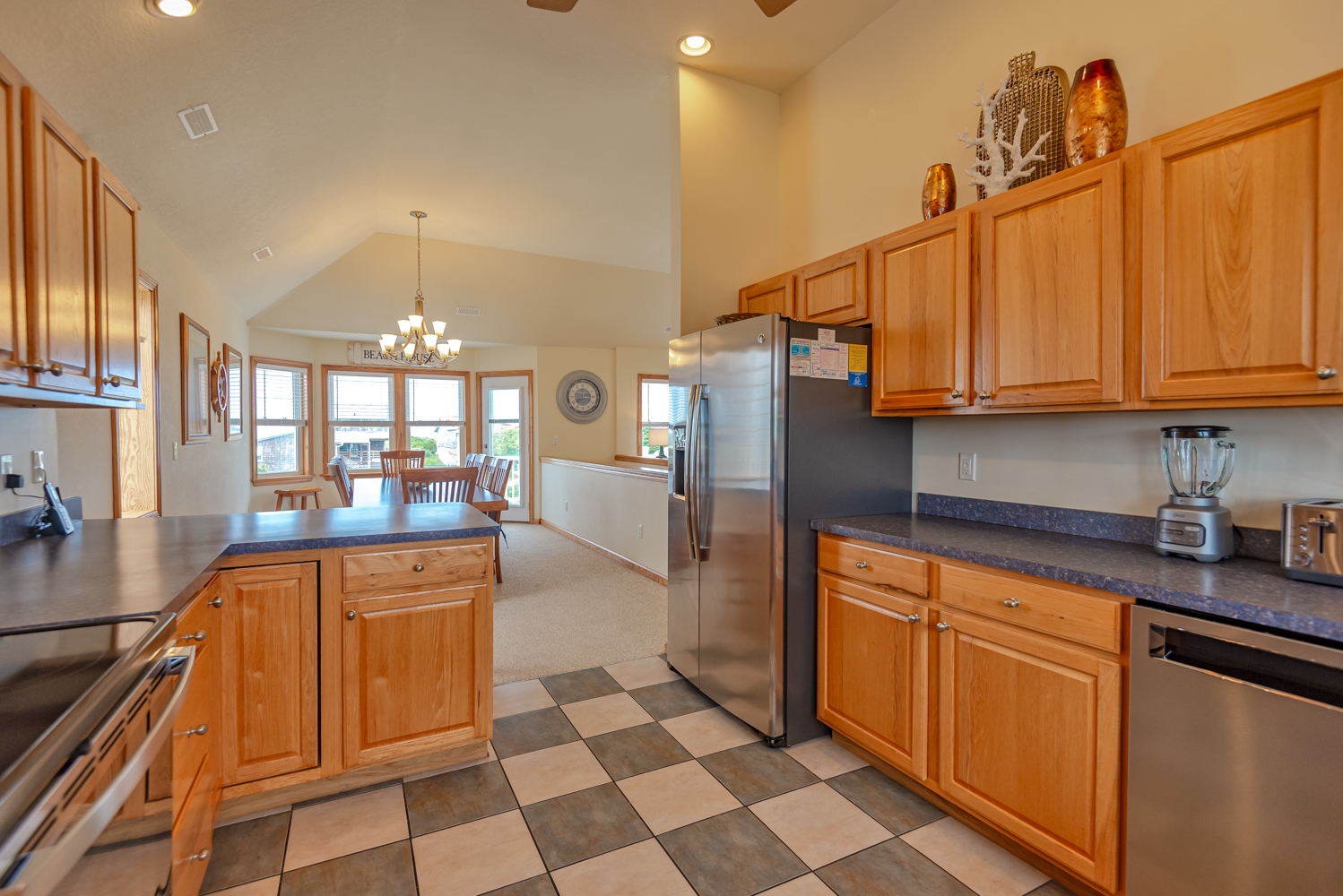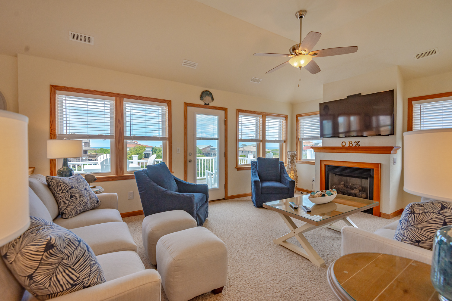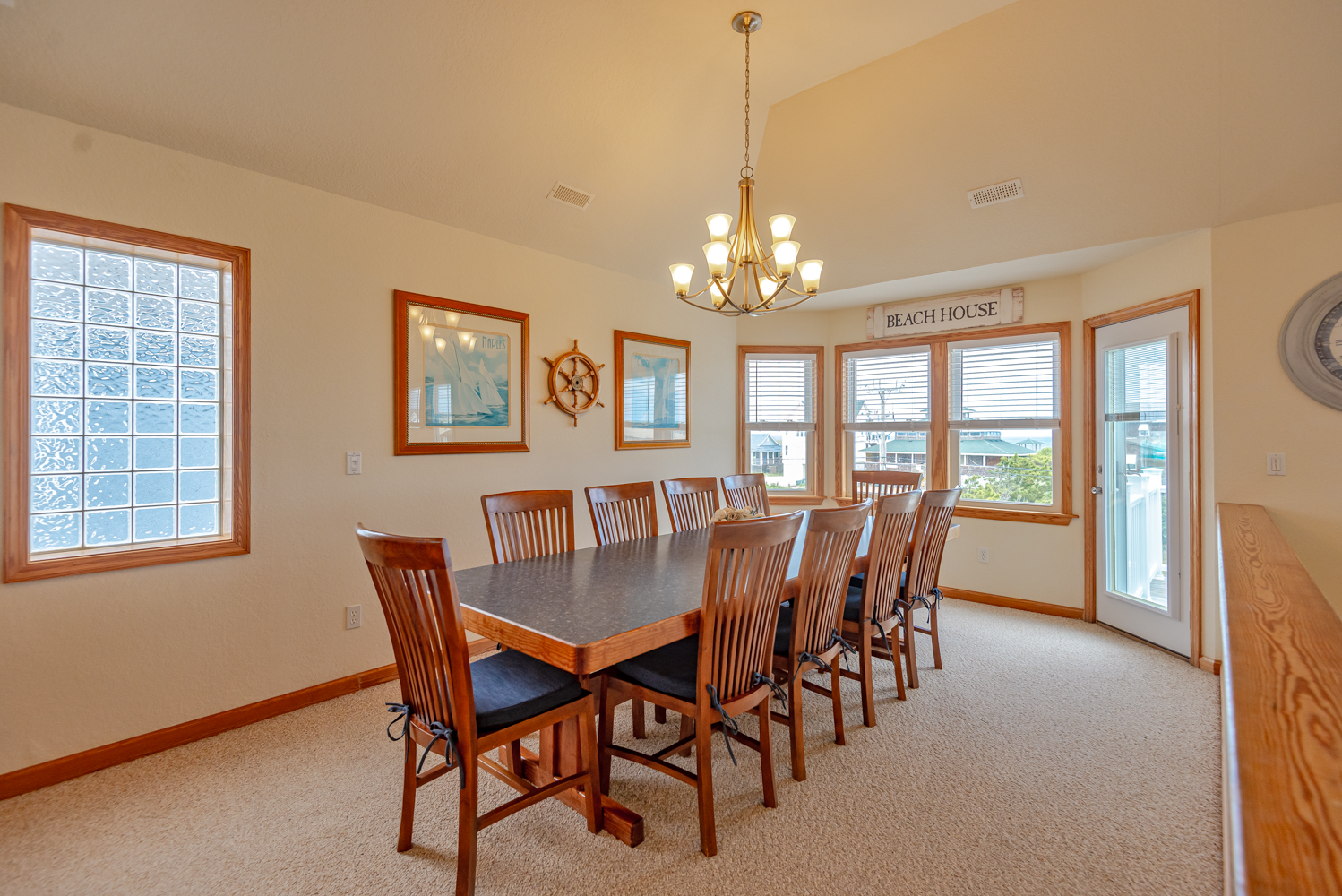 Top Level: Living Area w/TV, Kitchen Area w/Stainless Steel Appliances, Bar Seating for Two (2), Dining Area w/Seating for Ten (10), Private Suite w/King, TV, Full Bath w/Jacuzzi Tub; & Access to Sun Deck w/Ocean Views & Deck Furniture.