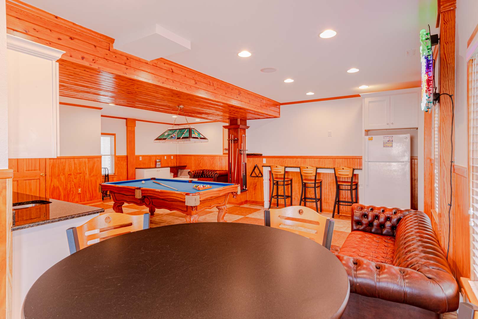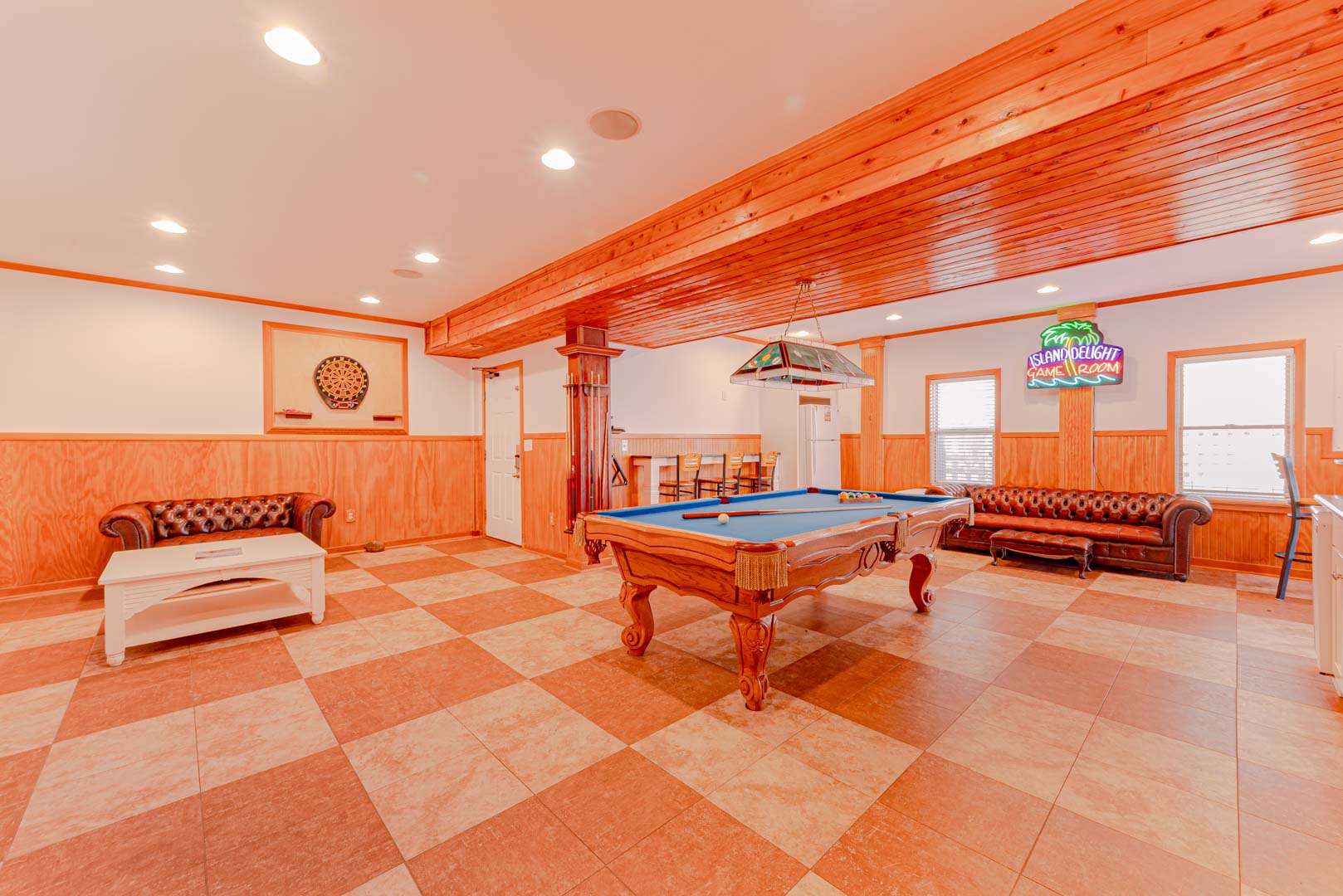 Ground Level: Parking for 5 Cars, Basketball Goal, Steps to Mid Level Covered Deck, Covered Entry, Elevator to All Levels, Rec Room w/8 ft. Regulation Pool Table, Smart TV, Dart Board, Full Size Refrigerator, Wet Bar w/Ice Maker, Microwave, Bar Seats 4, Café Table, Sofa, Full Bath w/access to Pool Patio, Tiki Bar, Enclosed Outside Shower, Private Swimming Pool - Open Seasonally, Hot Tub , Corn Hole Boards & Volleyball Area.