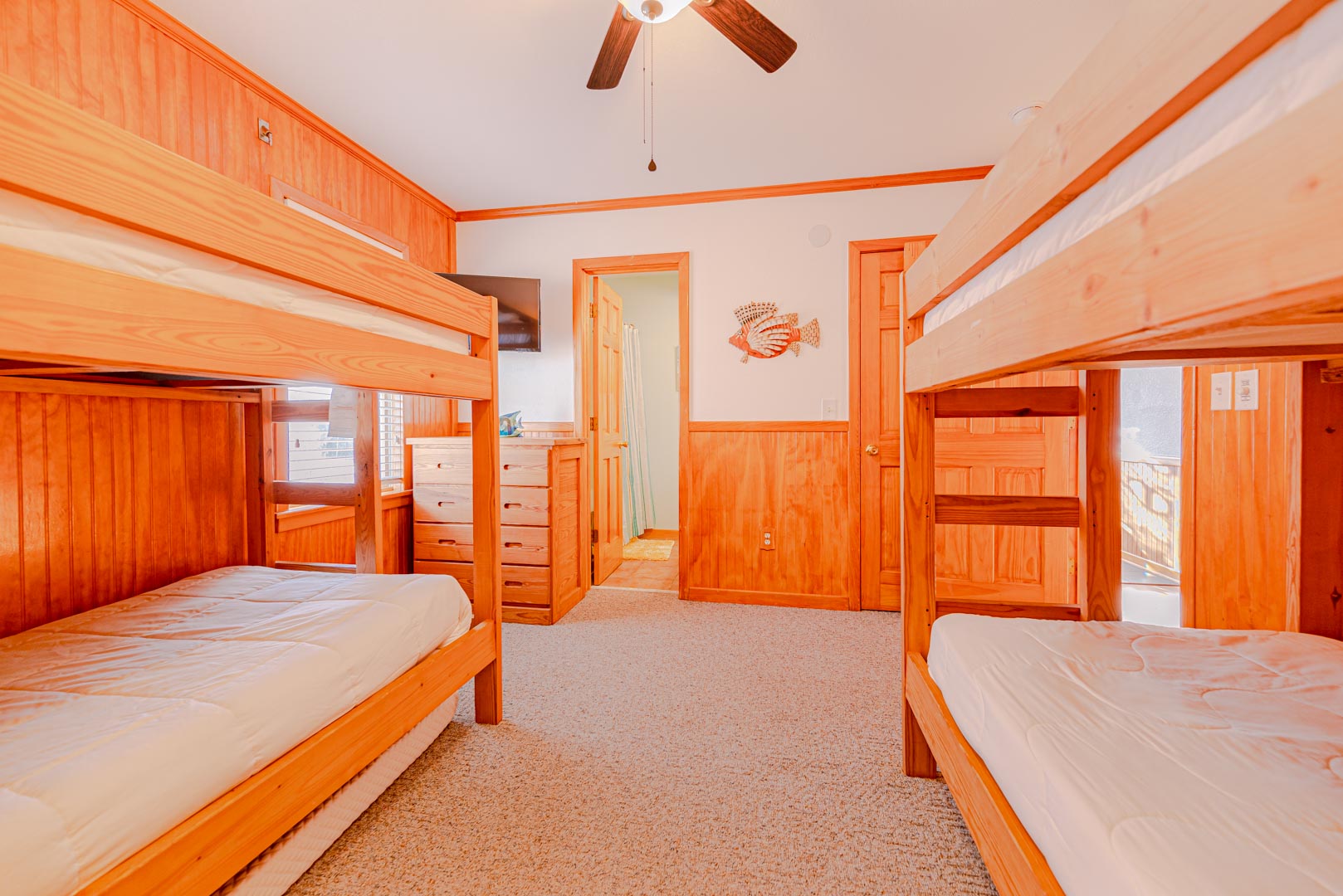 Mid Level: 4 Bedrooms (Private Suite w/King, Smart TV, Full Bath w/Tub/Shower, & Covered Deck Overlooking Pool Area, 2 Private Suites w/Queen, Smart TV, & Full Bath w/Tub/Shower, Private Suite w/2 Bunk Sets, Smart TV, & Full Bath w/Tub/Shower), Hall Access to Front Covered Deck, & Laundry Area.