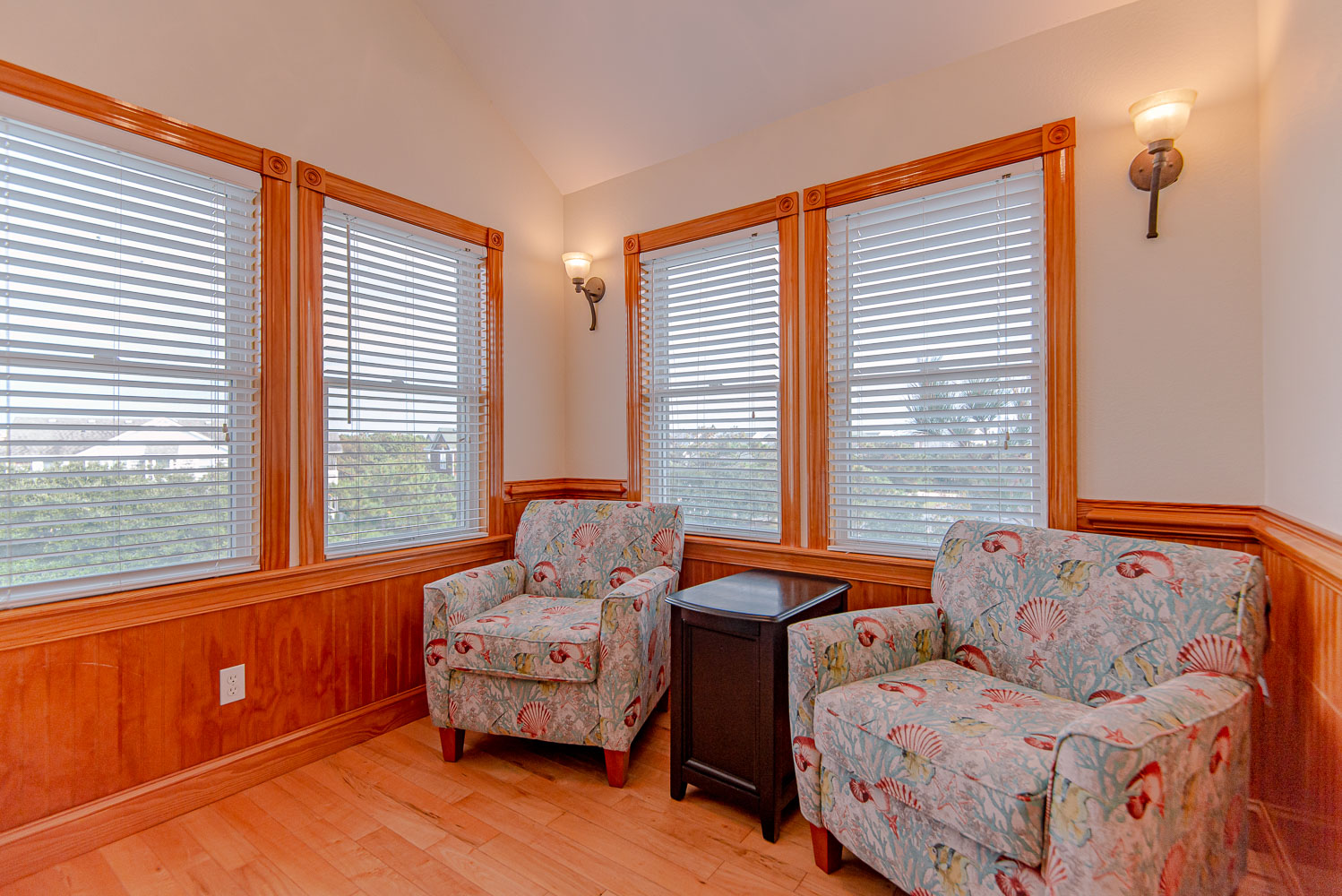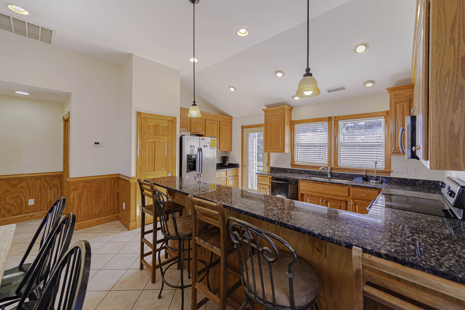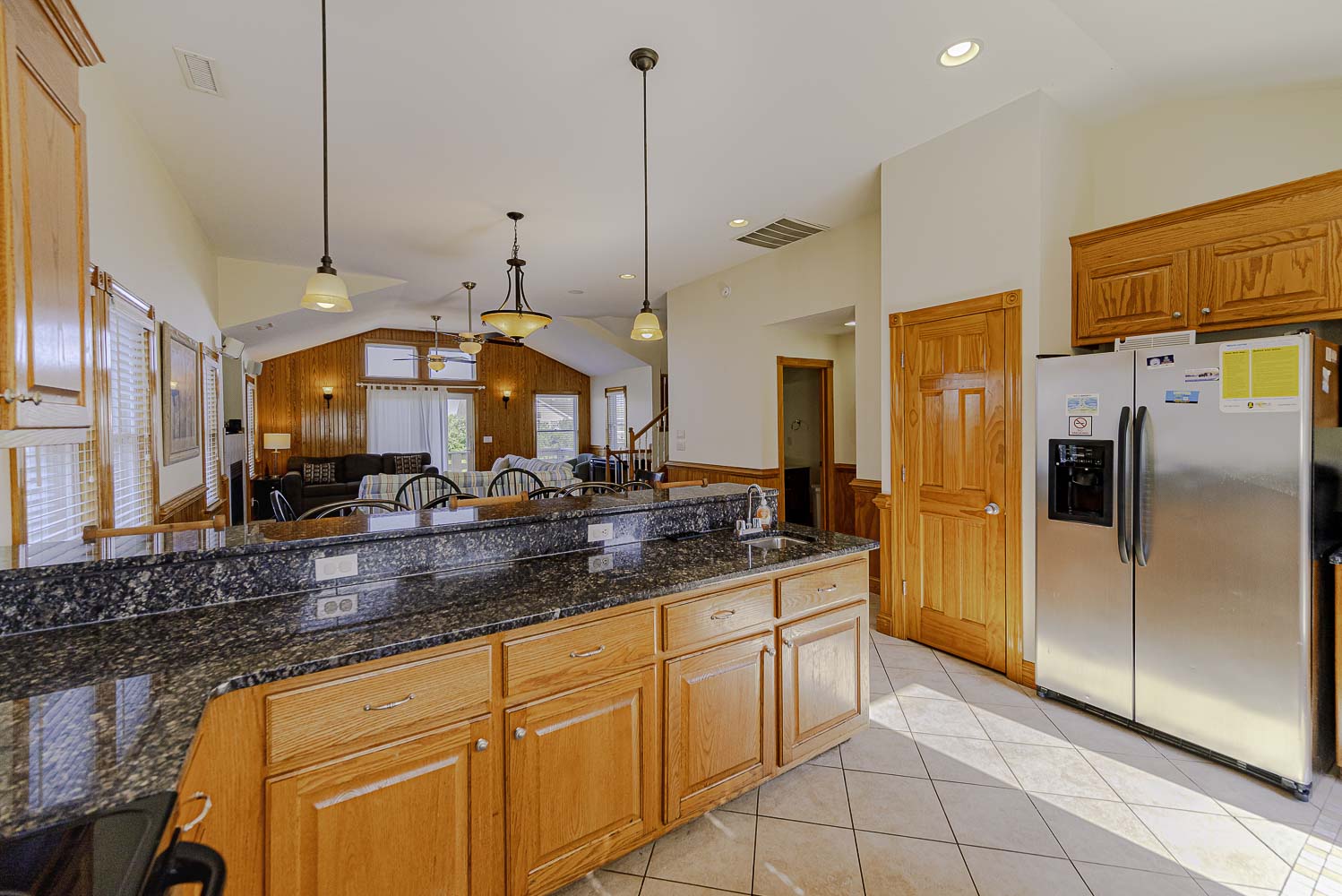 Top Level: Nicely Decorated, Inviting Living Area, Flat Screen TV, DVD, Hardwood Floors, Kitchen Area, Breakfast Bar Seating for Four (4), Granite Counters, Stainless Steel Appliances, Dining Area, Seating for Six (6), Steps to Small Sitting Area w/Chairs, Half Bath, Private Suite w/King, TV, Full Bath w/Tiled Walk-In Shower, & Access to 2 Sun Decks.