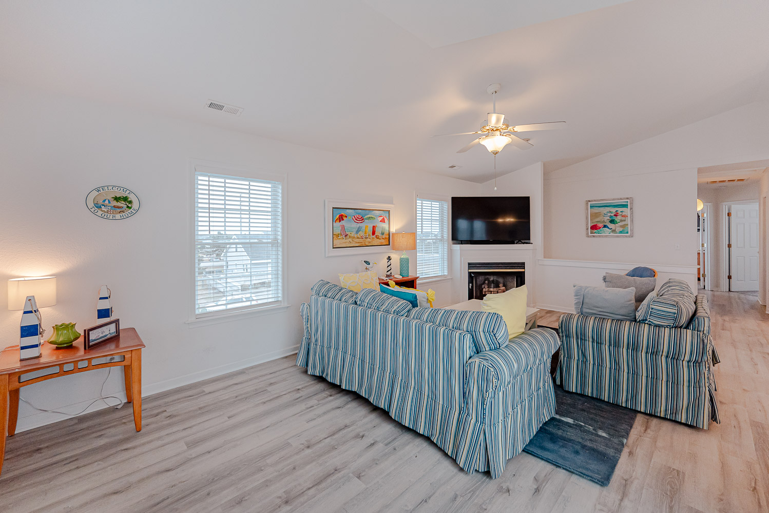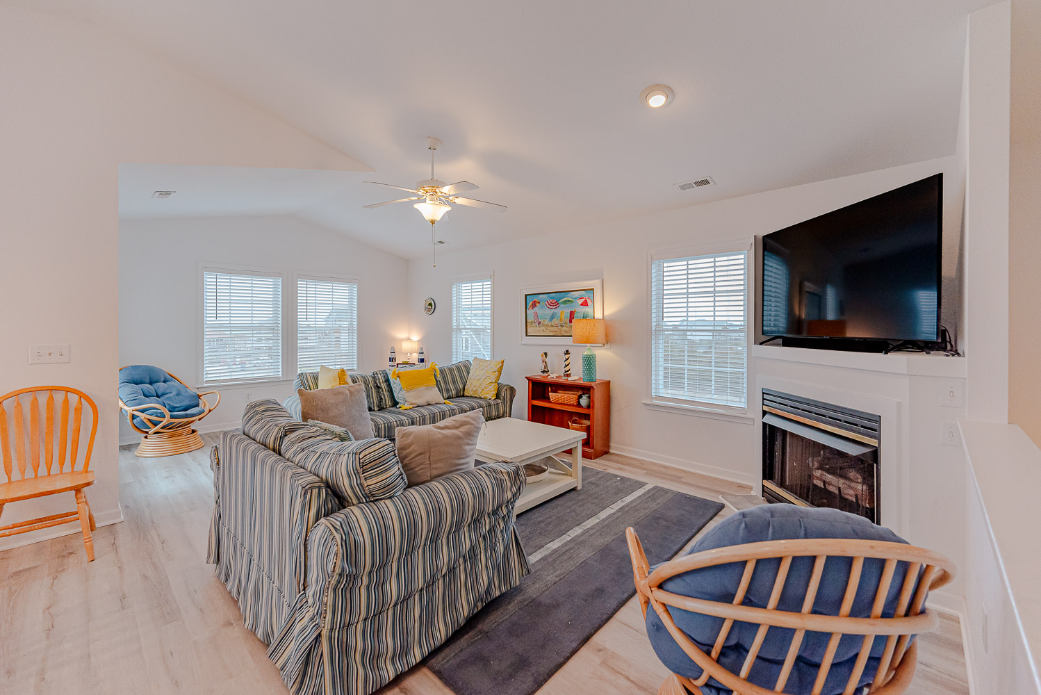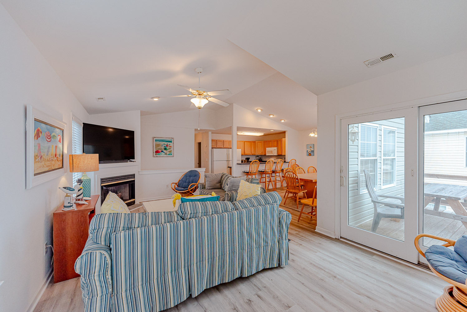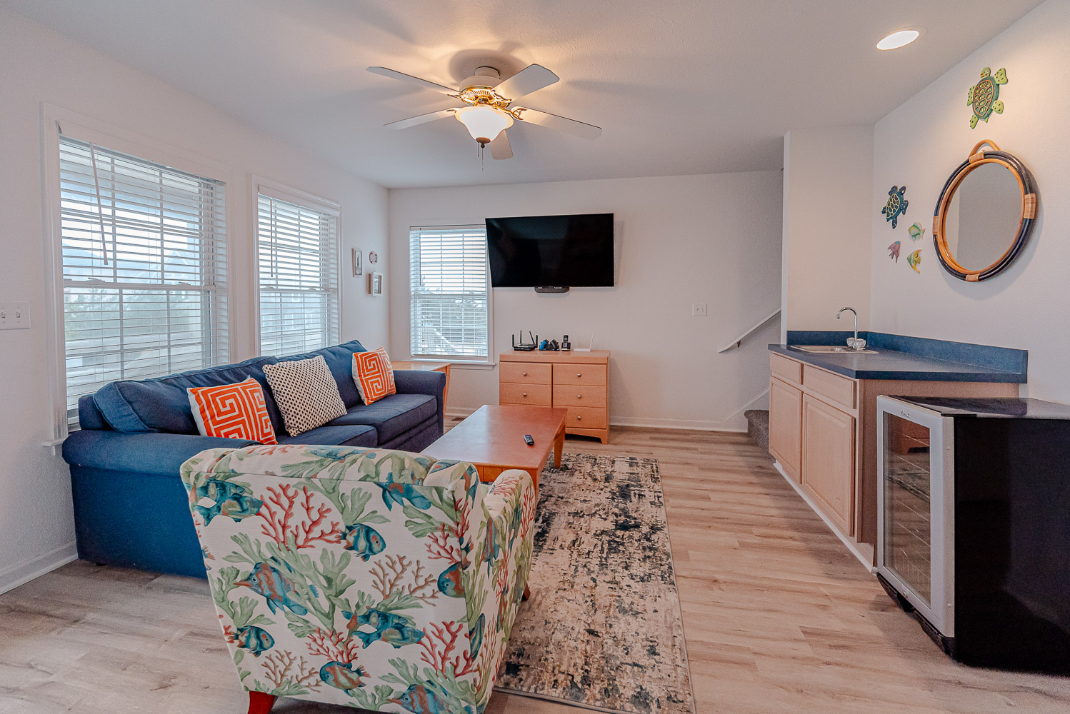 Top Level: Living Area, HDTV, Cathedral Ceilings, Full Equipped Kitchen Area, Breakfast Bar w/Seating for 4, Dining Area, Half Bath, 2 Bedrooms (Private Suite w/Kings, HDTV, Full Bath w/Walk-In Shower, Jacuzzi Tub; Private Suite w/King, TV, Full Bath w/Tub/Shower), and Sun Deck, Deck Furniture, and Ocean Views.