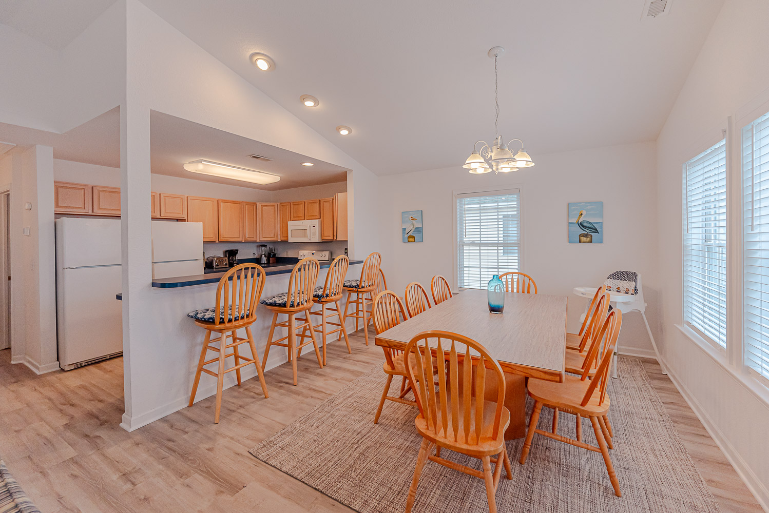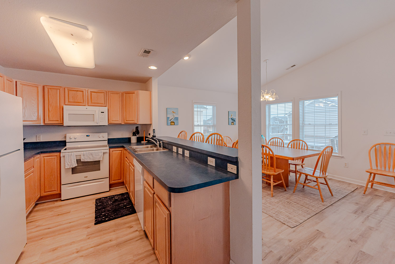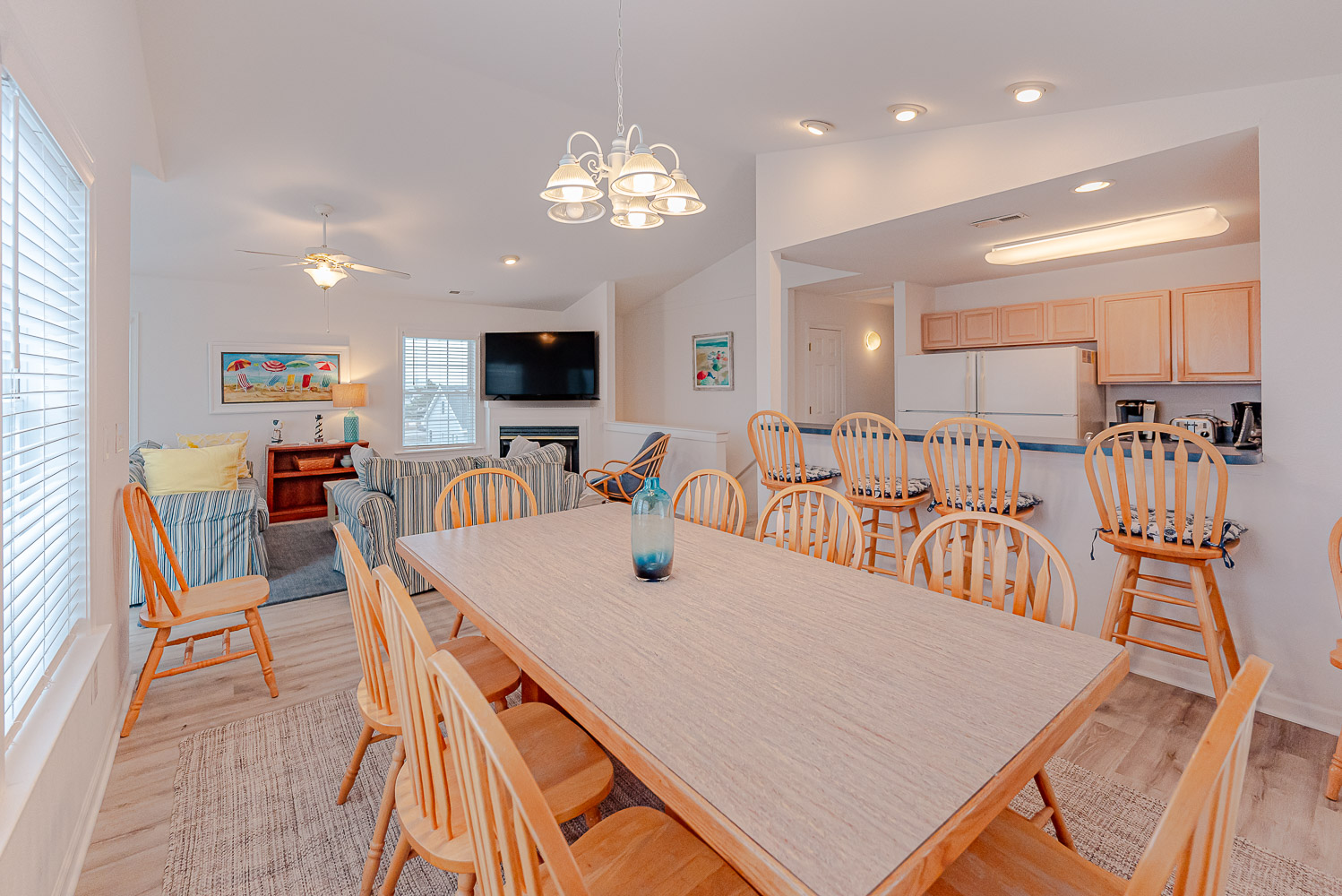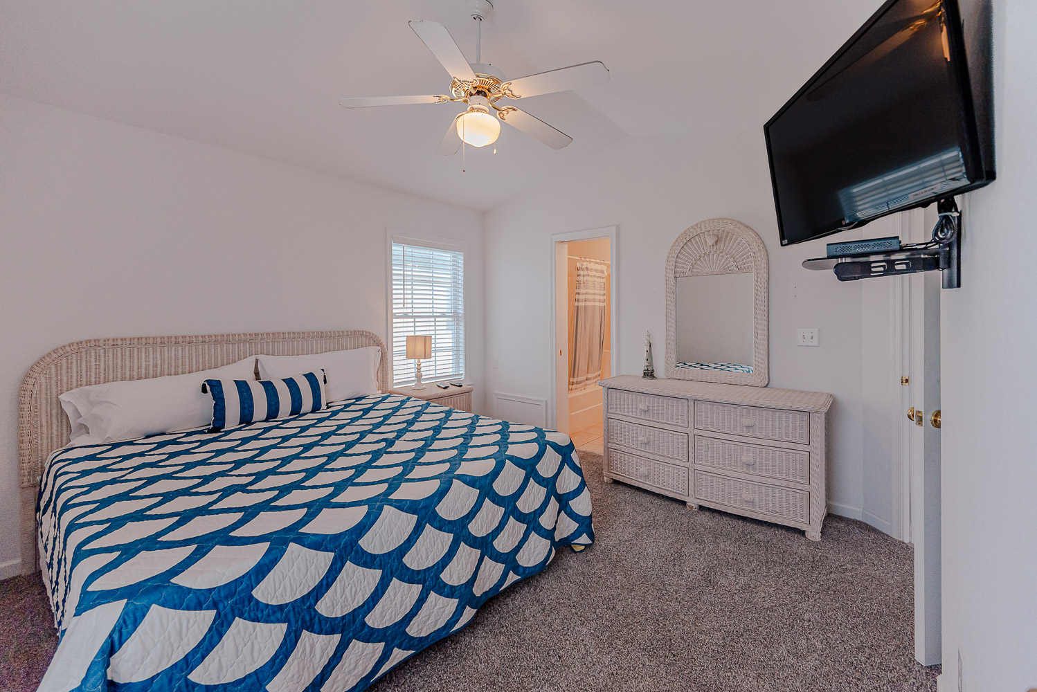 Top Level: Living Area, HDTV, Cathedral Ceilings, Full Equipped Kitchen Area, Breakfast Bar w/Seating for 4, Dining Area, Half Bath, 2 Bedrooms (Private Suite w/Kings, HDTV, Full Bath w/Walk-In Shower, Jacuzzi Tub; Private Suite w/King, TV, Full Bath w/Tub/Shower), and Sun Deck, Deck Furniture, and Ocean Views.