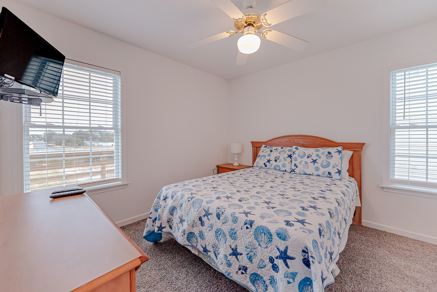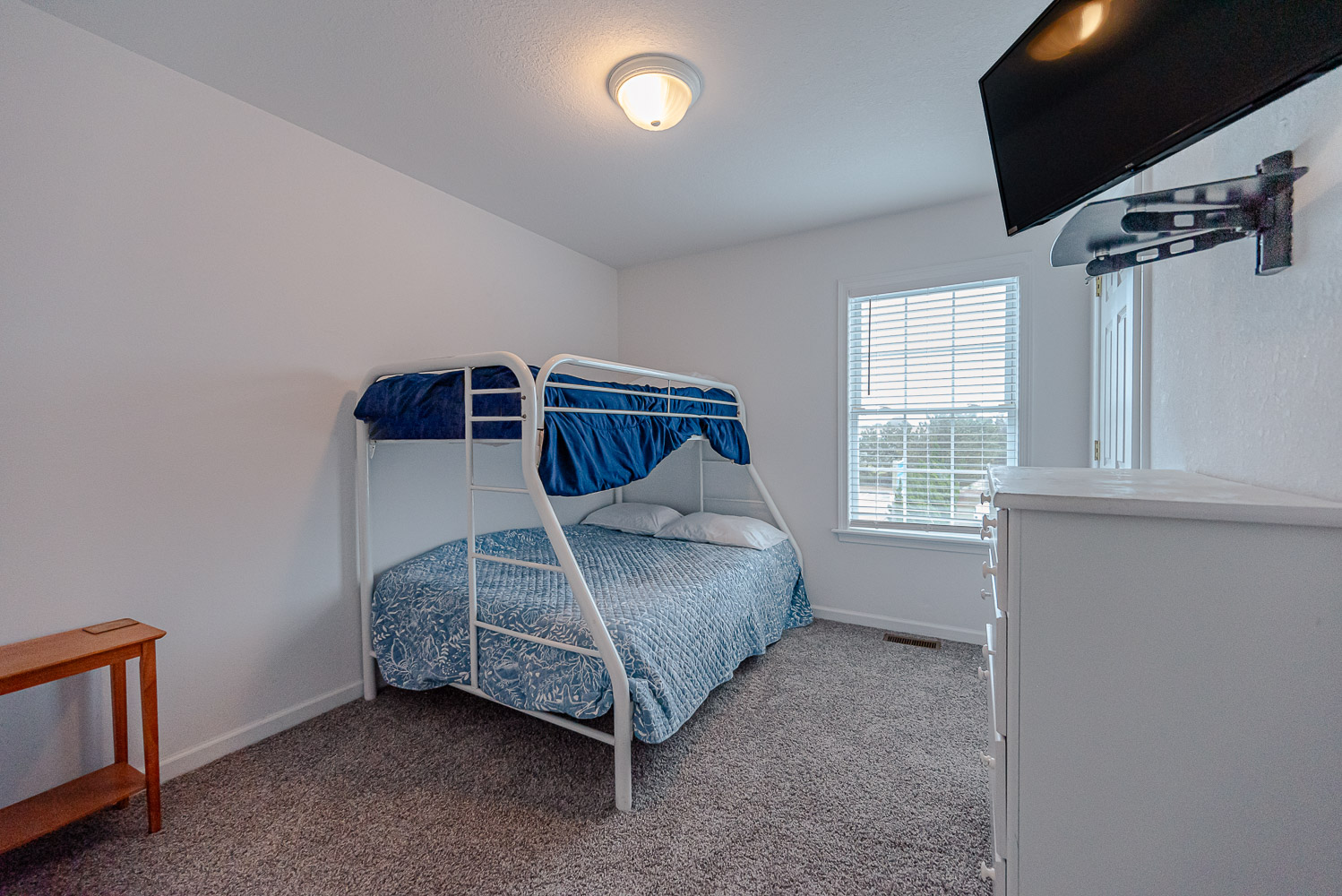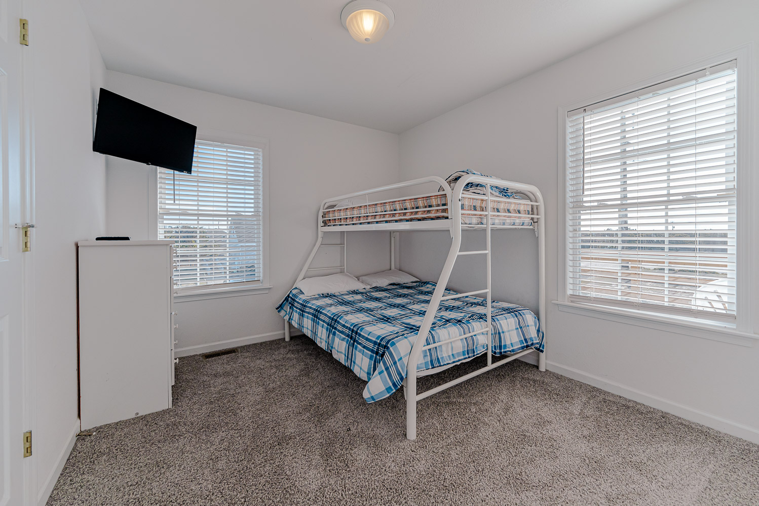 Mid Level: 4 Bedrooms (Private Suite w/Queen, HDTV, Full Bath w/Tub/Shower; Private Suite w/Queen, HDTV, Full Bath w/Tub/Shower; 2 w/Duo Bunks, HDTVs), Laundry Area, Full Hall Bath w/Tub/Shower, Den, HDTV, Wet Bar, Wine Cooler; Covered Porch; and Sun Deck w/Deck Furniture.