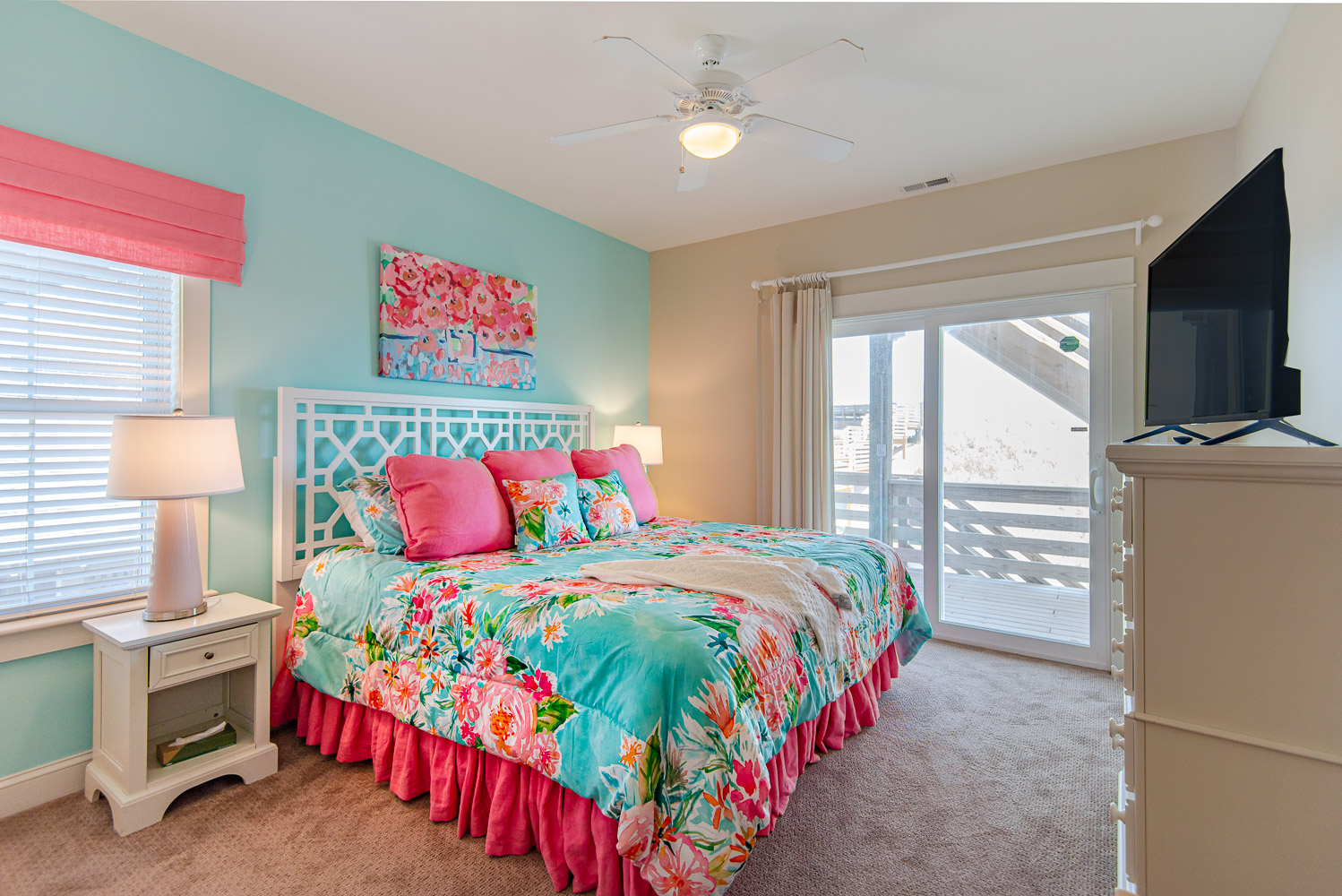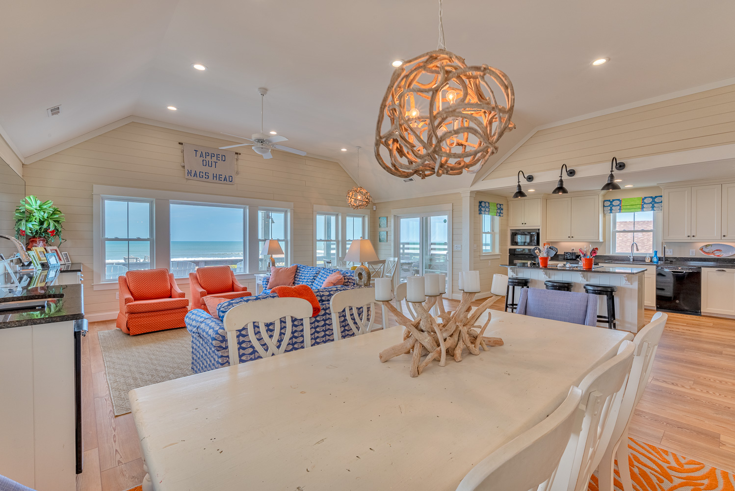 Top Level: Living/Dining/Kitchen Area w/Island Bar and Seating for 4, 65 Inch Smart TV, Ocean Views, Wet Bar, Free Standing Ice Maker, Half Bath, Private Suite w/King, TV, Full Bath, Covered Deck w/Deck Furniture, and Sun Deck w/Deck Furniture.