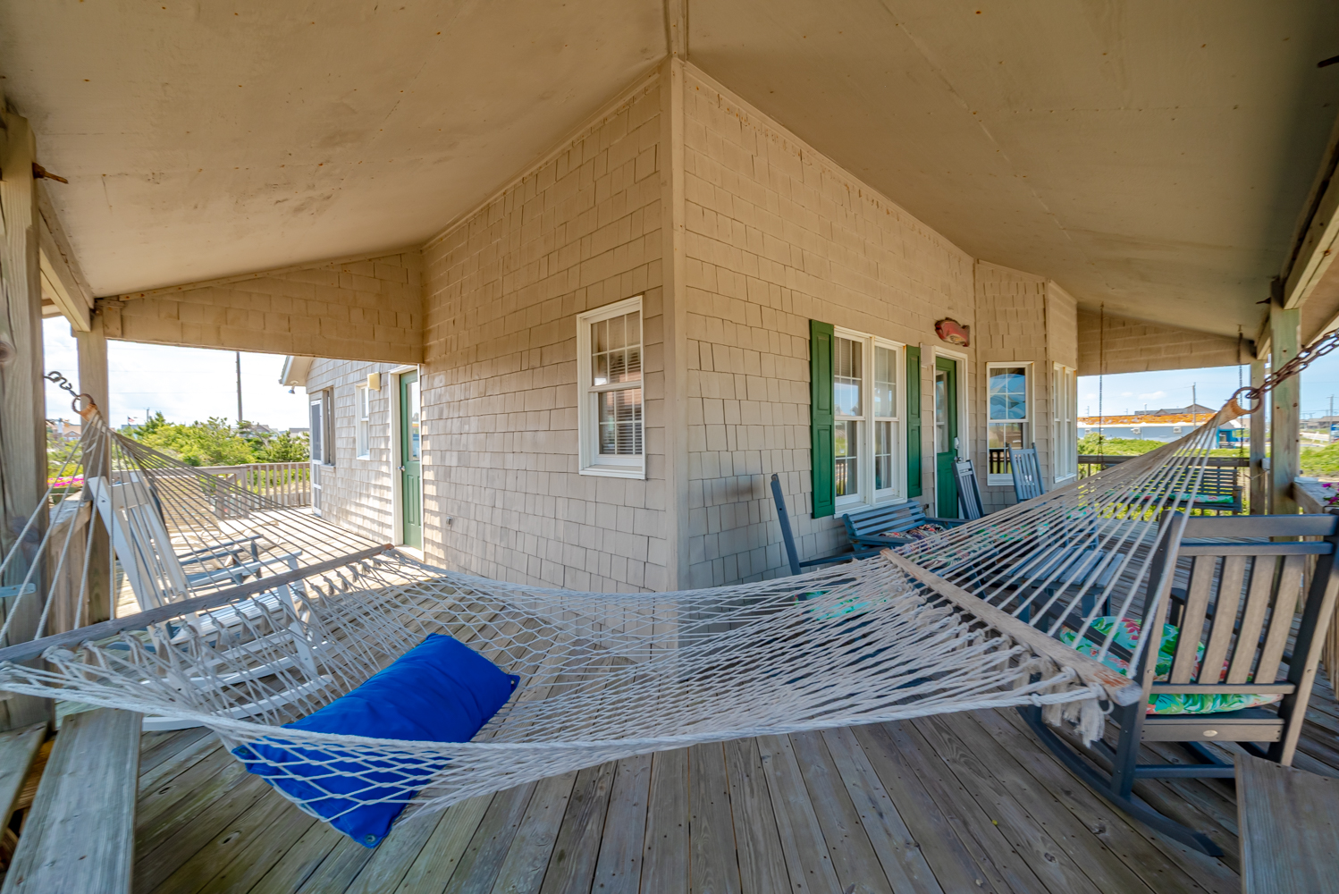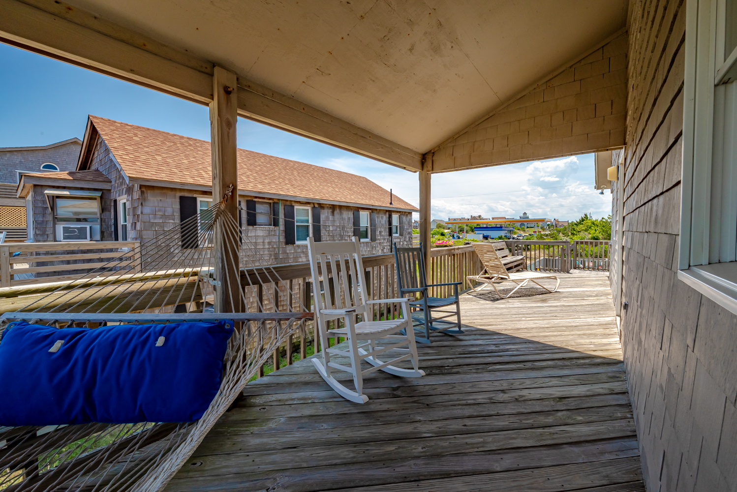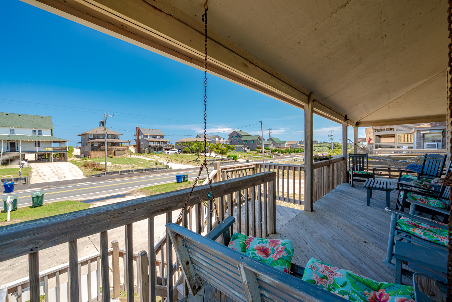 Mid Level: Living/Dining/Kitchen Areas, TV, Gas Fireplace, 2 Bedrooms (1 Private Suite w/King, Full Bath, 1 Bedroom w/Queen, TV), Full Bath, Screen Porch w/Furniture, Covered Deck w/Furniture, and Sun Deck w/Hammock, Built-In Seating, Rocking Chairs, and 3 Porch Swings.