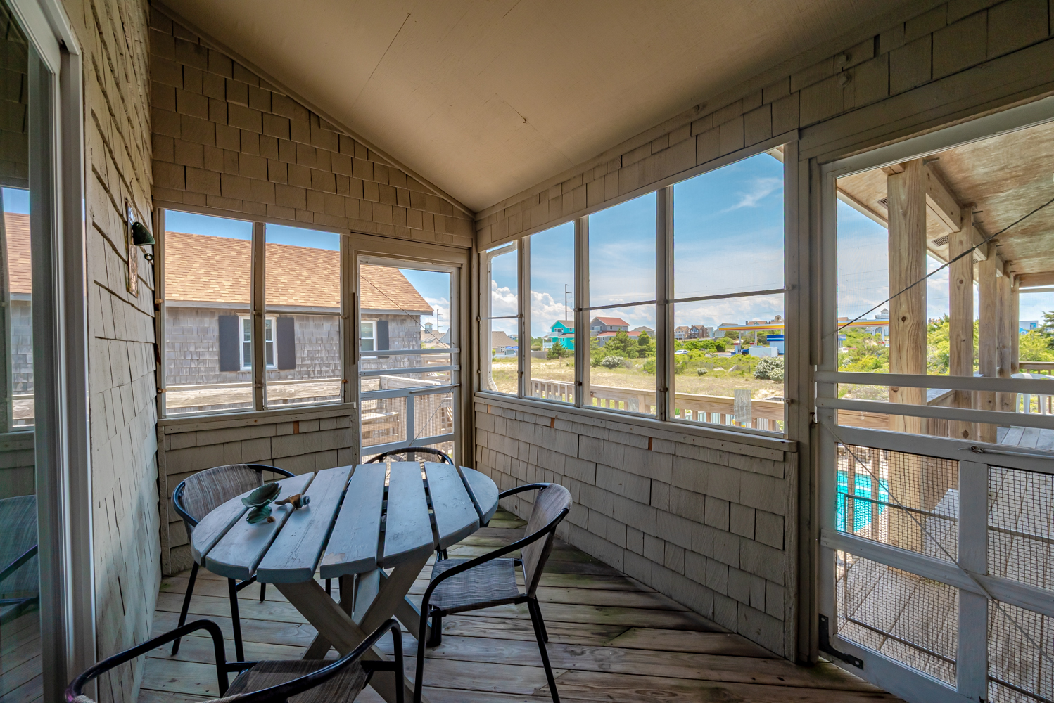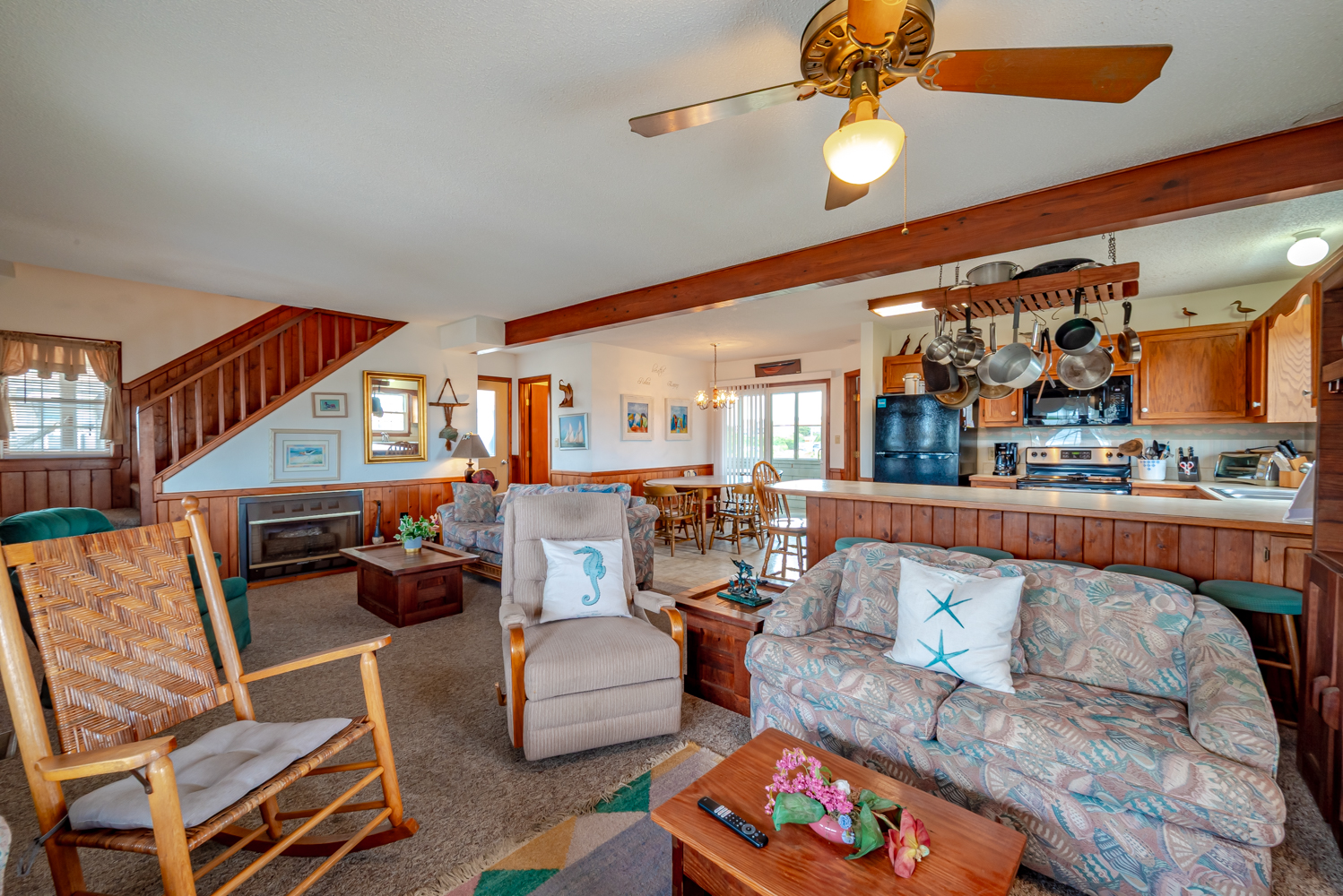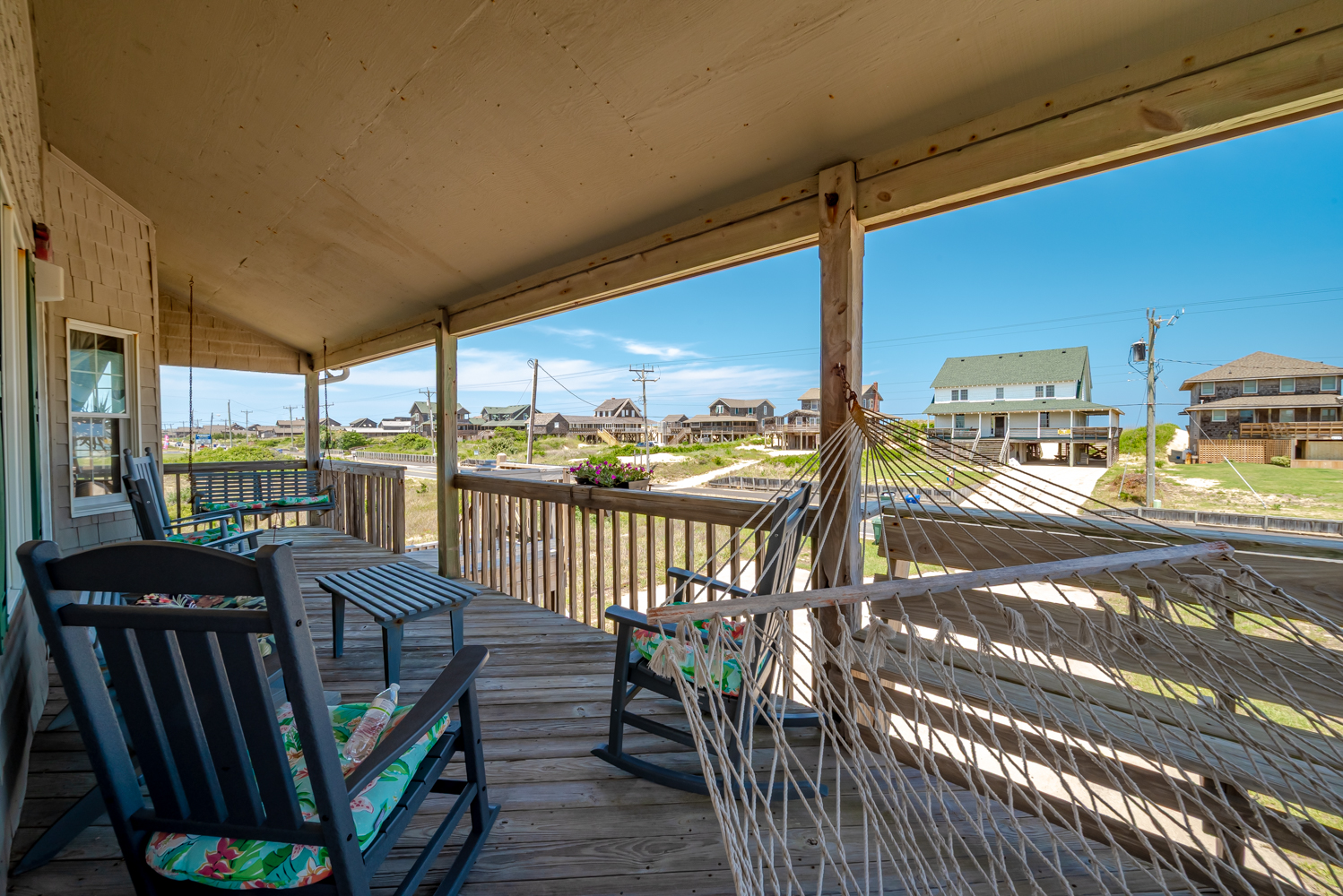 Mid Level: Living/Dining/Kitchen Areas, TV, Gas Fireplace, 2 Bedrooms (1 Private Suite w/King, Full Bath, 1 Bedroom w/Queen, TV), Full Bath, Screen Porch w/Furniture, Covered Deck w/Furniture, and Sun Deck w/Hammock, Built-In Seating, Rocking Chairs, and 3 Porch Swings.