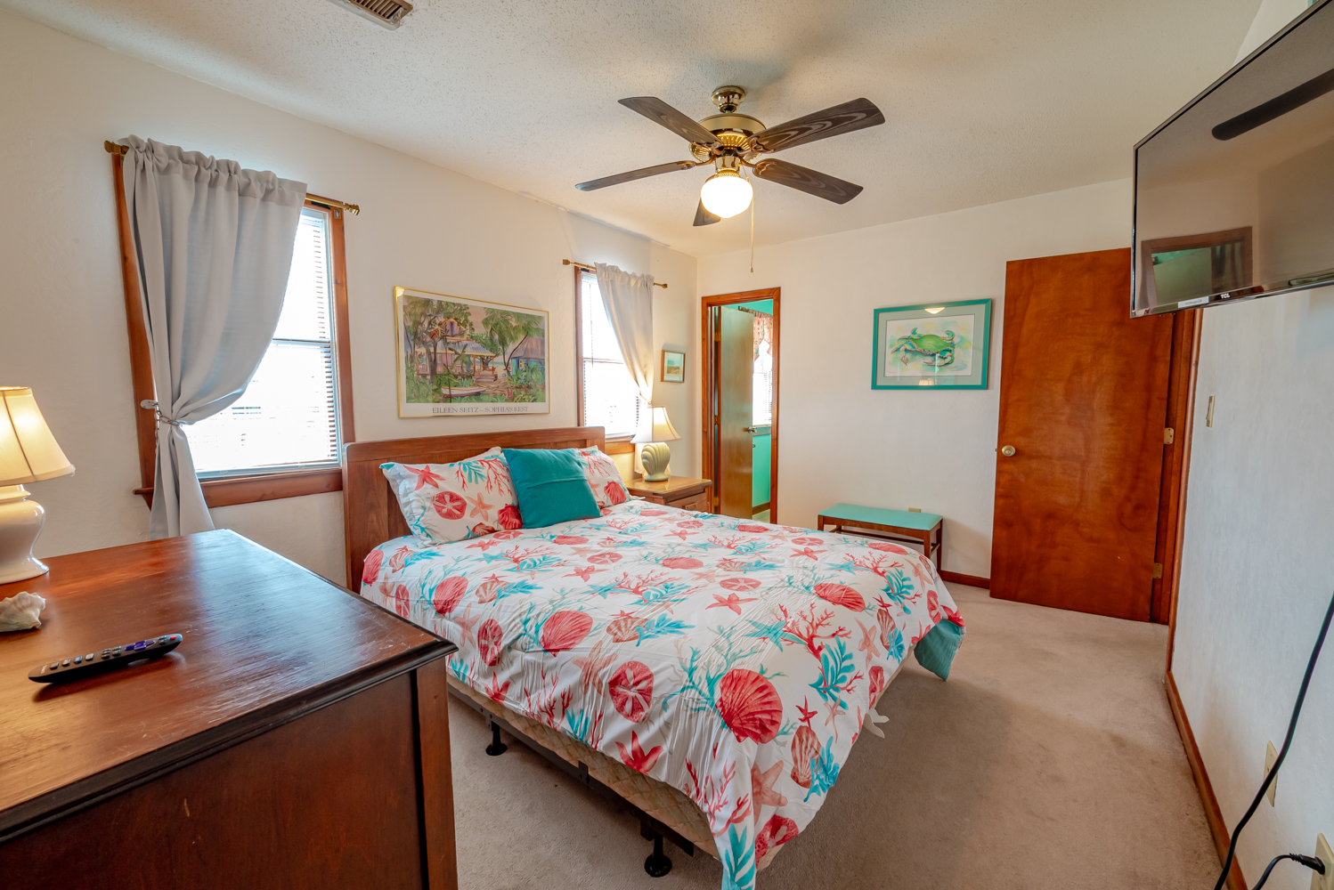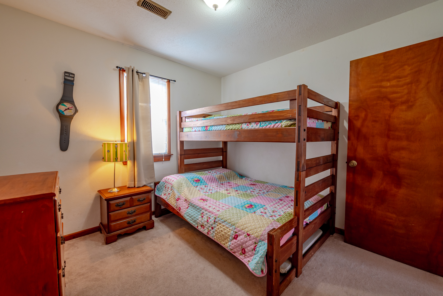 Top Level: 3 Bedrooms (Private Suite w/Queen, TV, 1 w/Duo Bunk, 1 w/2 Singles) and Shared Full Bath.