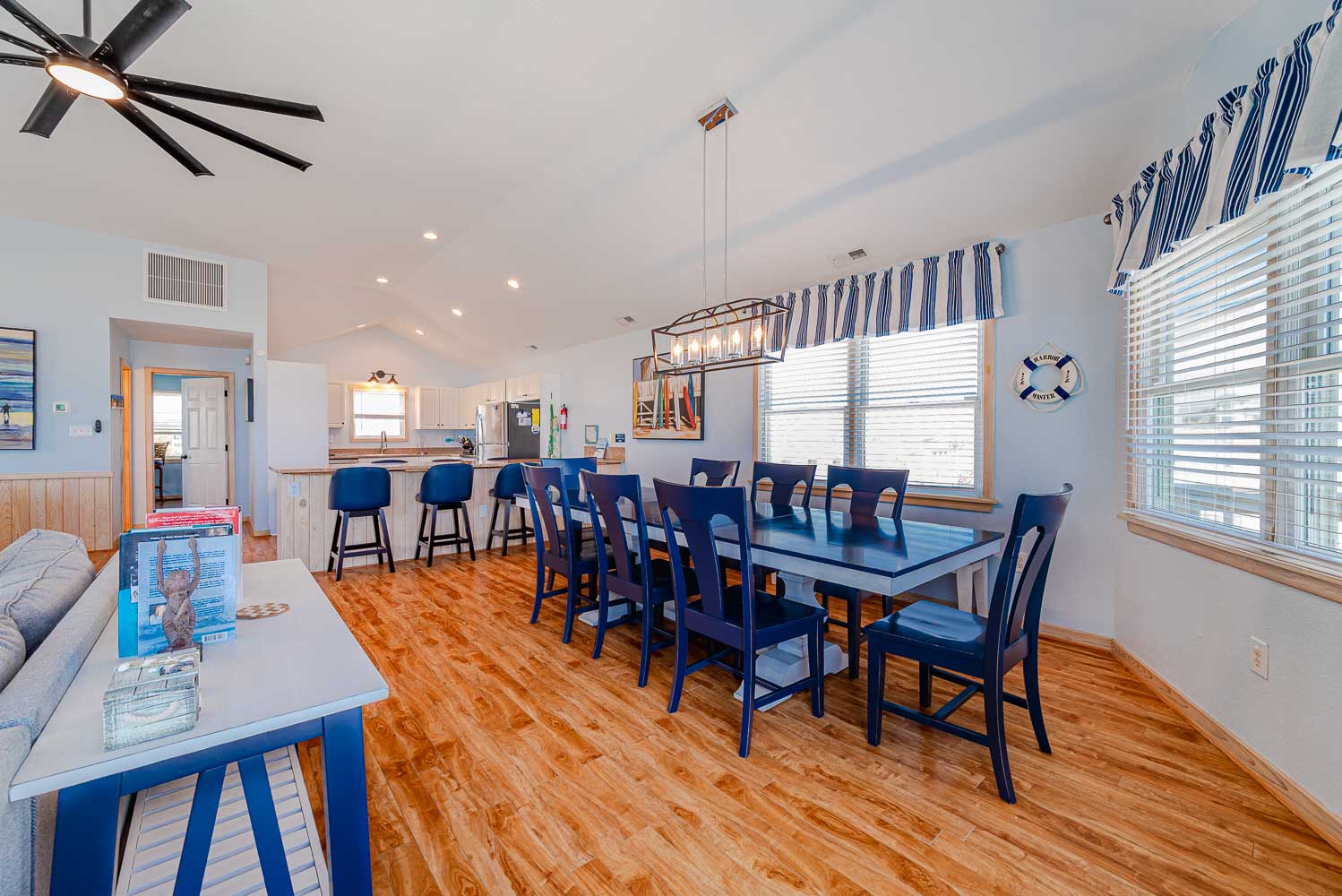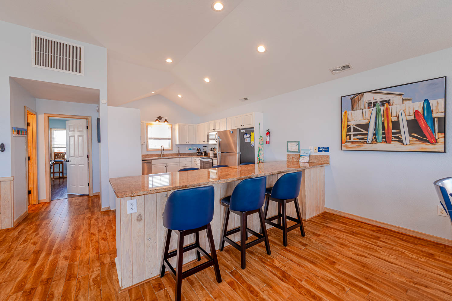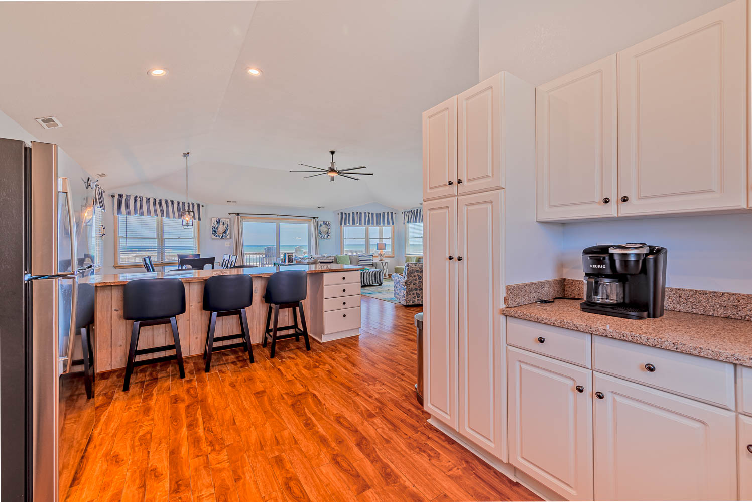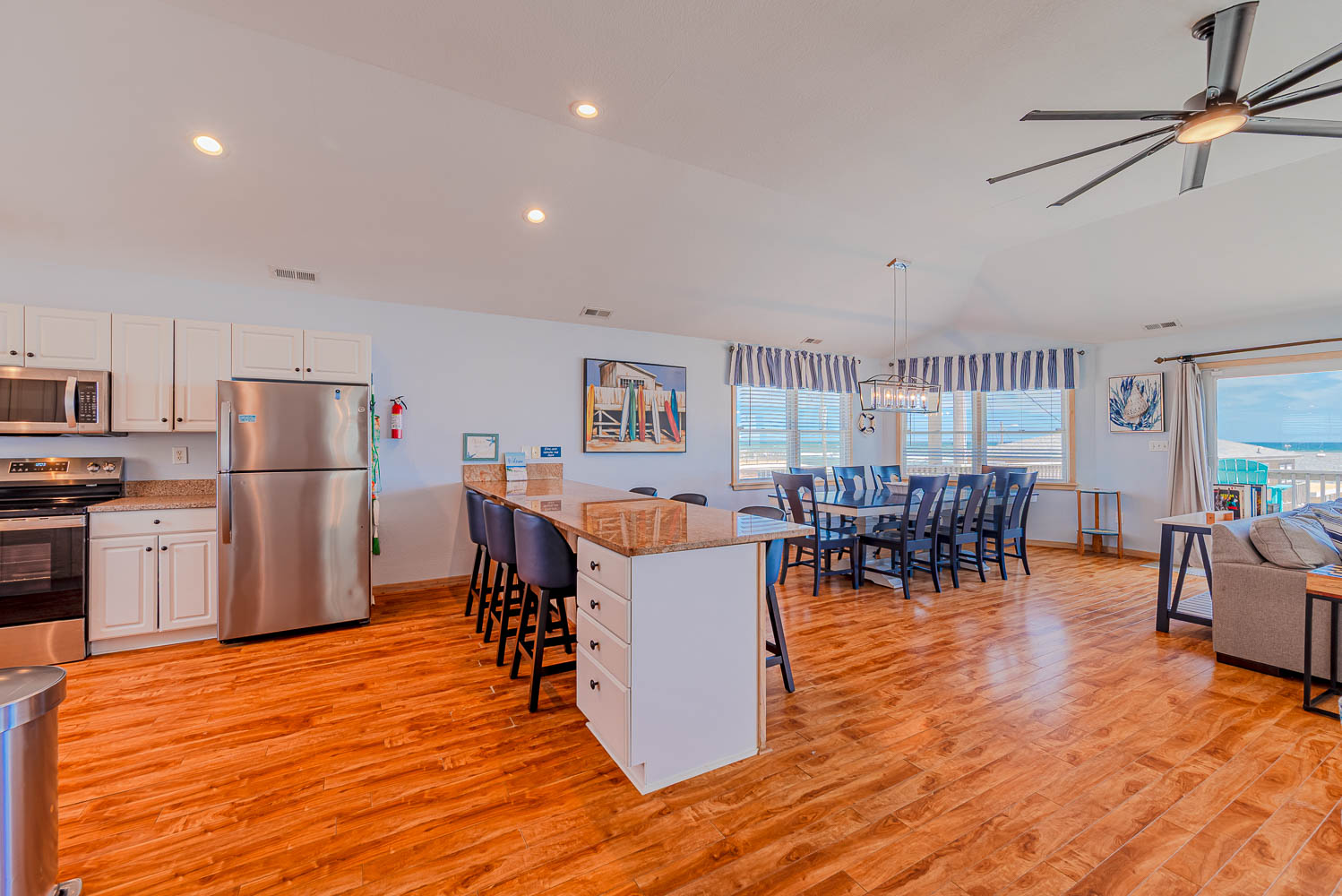 Top Level: Spacious Living Area, 51 Inch TV, Ceiling Fan, Fully Equipped Kitchen, Stainless Steel Appliances, Granite Counters, Island Bar Seating for Six (6), Dining Area w/Seating for Ten (10), Rec. Room/Den w/TV, Shuffleboard and sitting area, Access to Oceanfront Sun Deck w/Deck Furniture, and Outstanding Ocean Views.