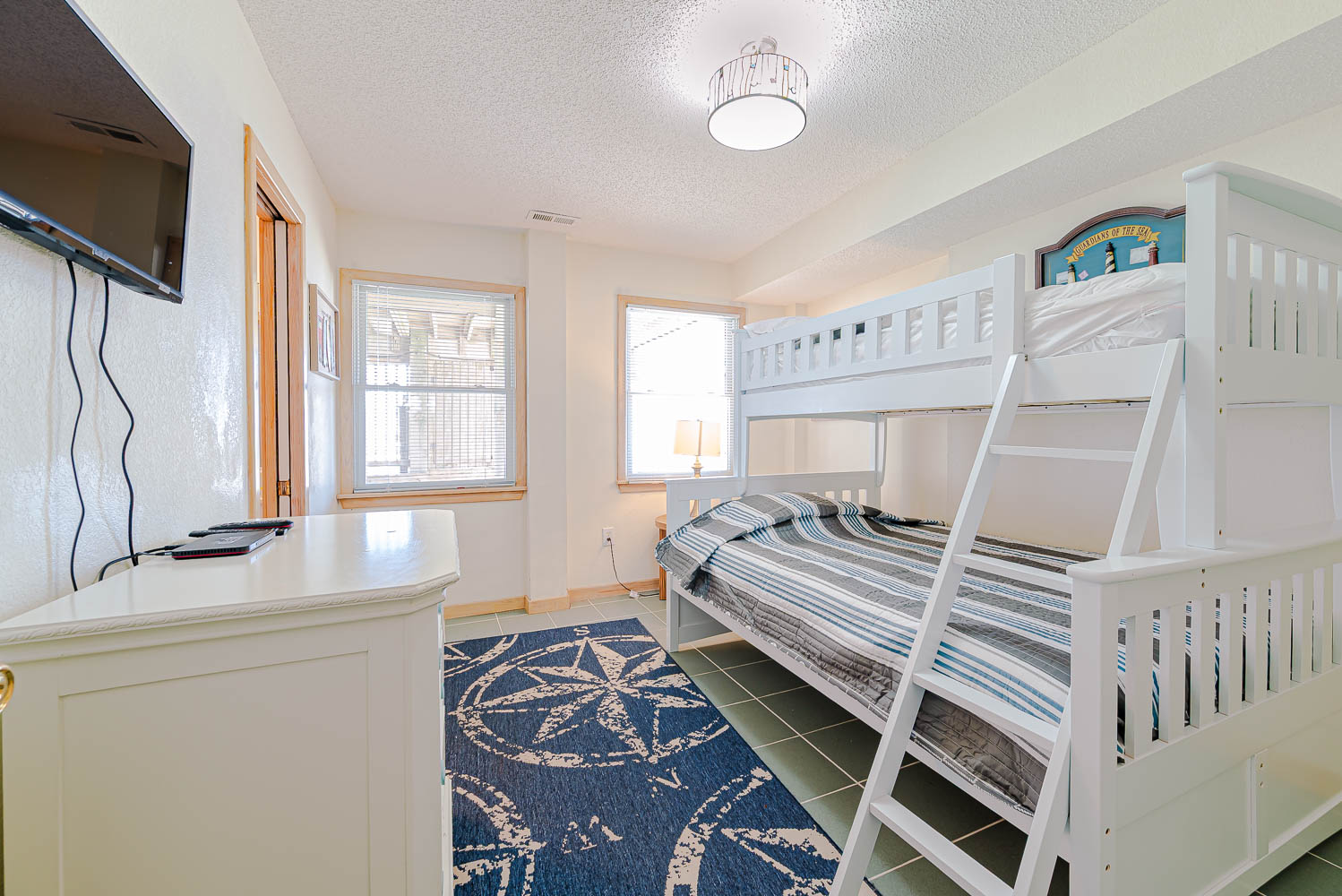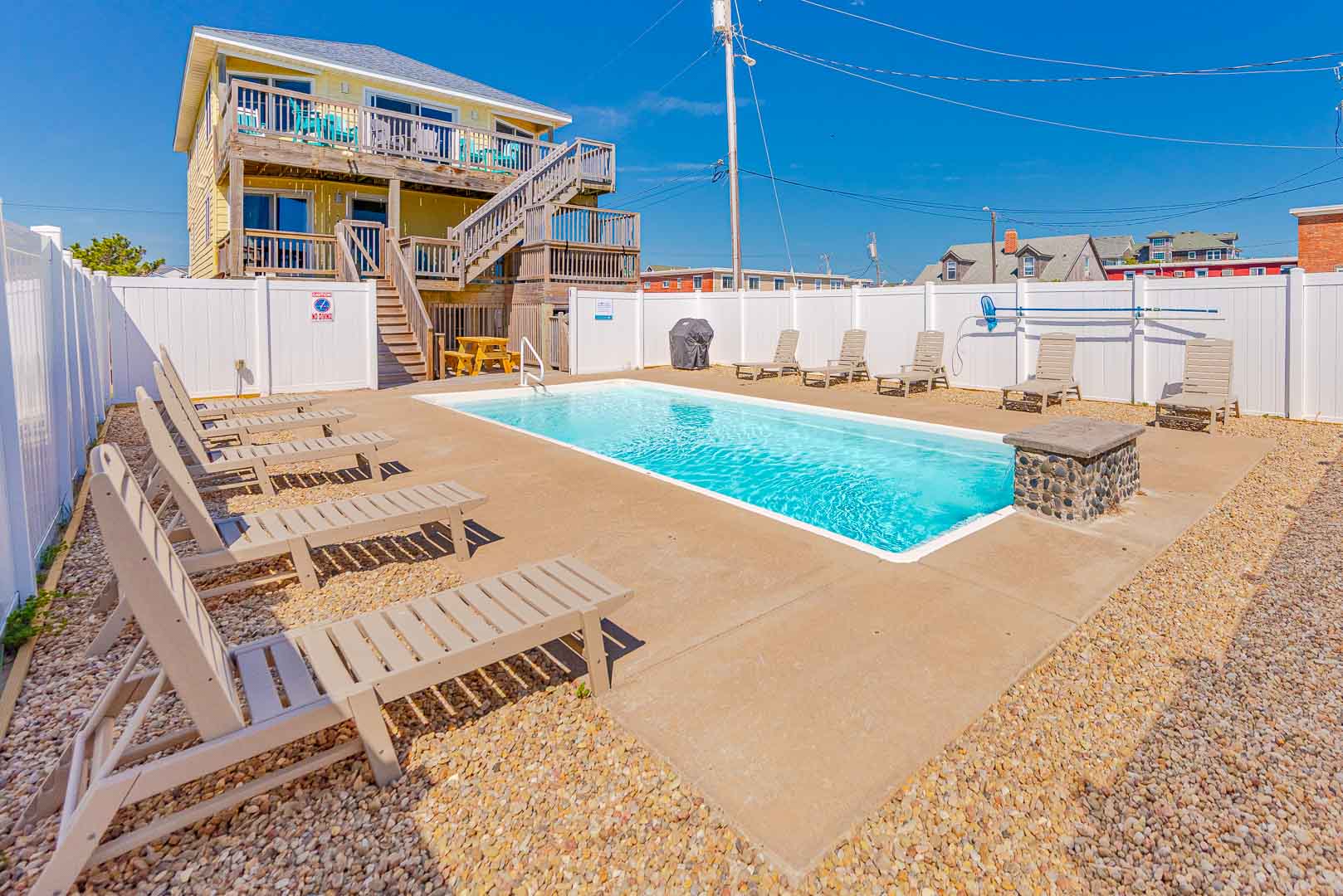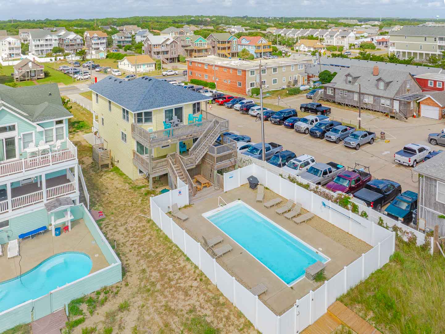 Ground Level: Parking for 5 Vehicles, Enclosed Outside Shower, Covered Entry, Tiled Flooring, 2 Bedrooms (1 w/Duo Bunk, TV; 1 w/Duo Bunk, Bunk Set, TV); Full Jack-n-Jill Bath w/Tub/Shower, Gas Grill, Picnic Table, Steps to Private 14x33 Swimming Pool, Lounger Chairs, and Sand Path to Dune Top Deck w/Deck Furniture, Ocean and Beach Views, and Steps to Beach.