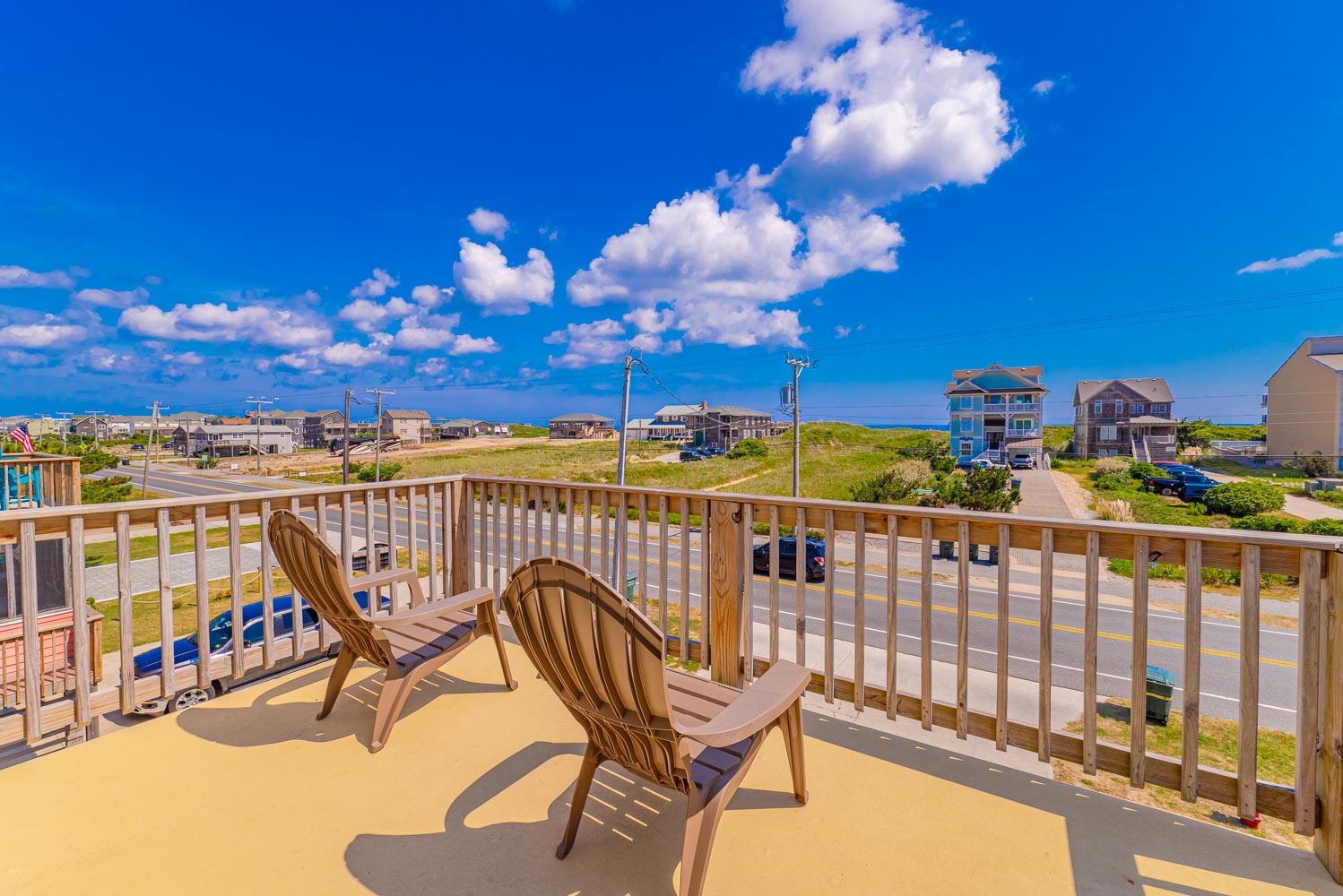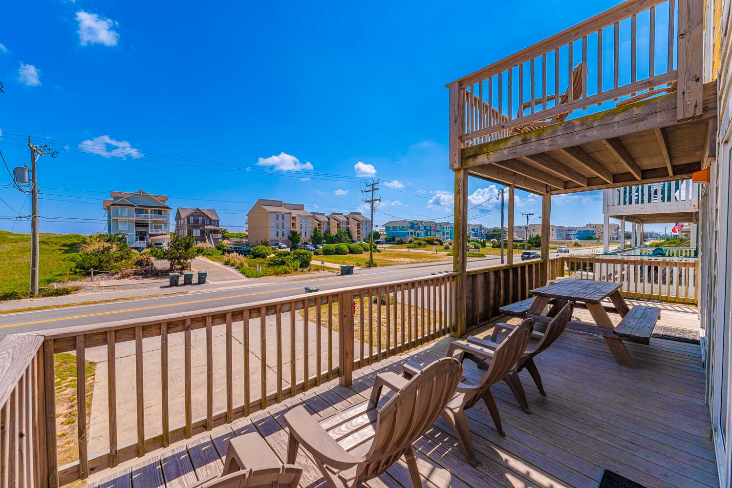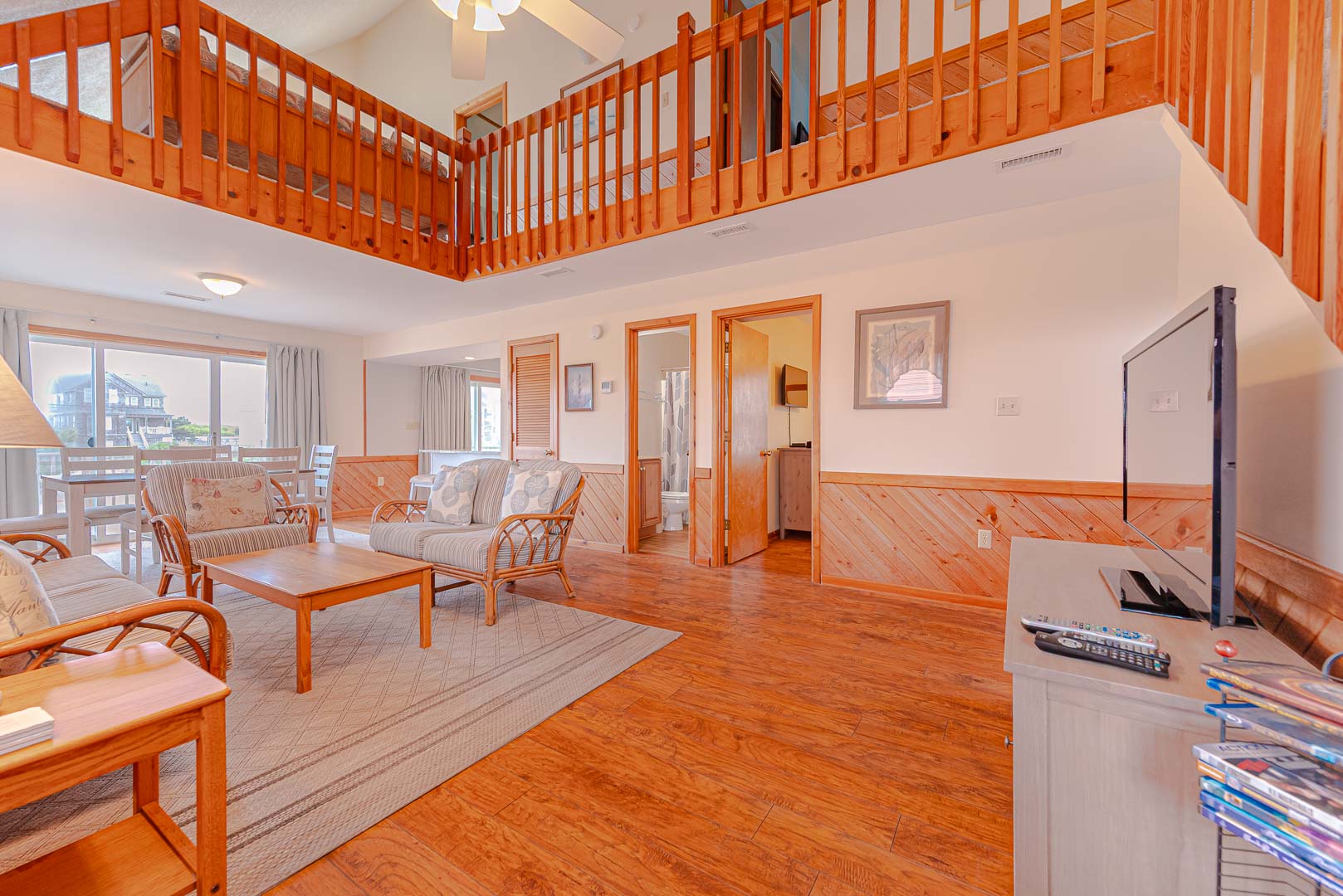Top Level: 2 Bedrooms (1 w/Queen, TV; 1 w/Bunk Set, Single, TV), Full Bath, Loft w/Sitting Area, and Sun Deck w/Horizon Ocean Views.