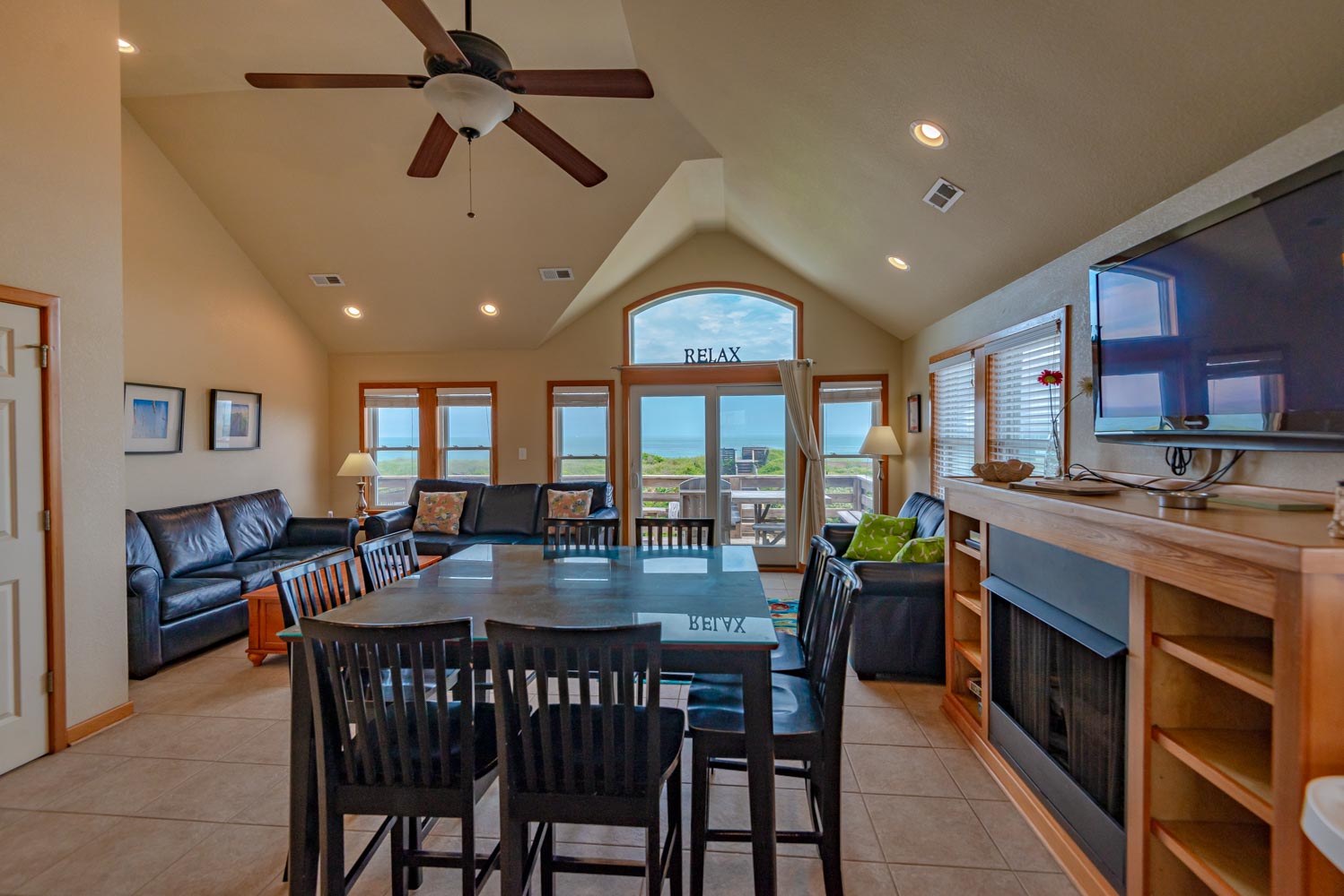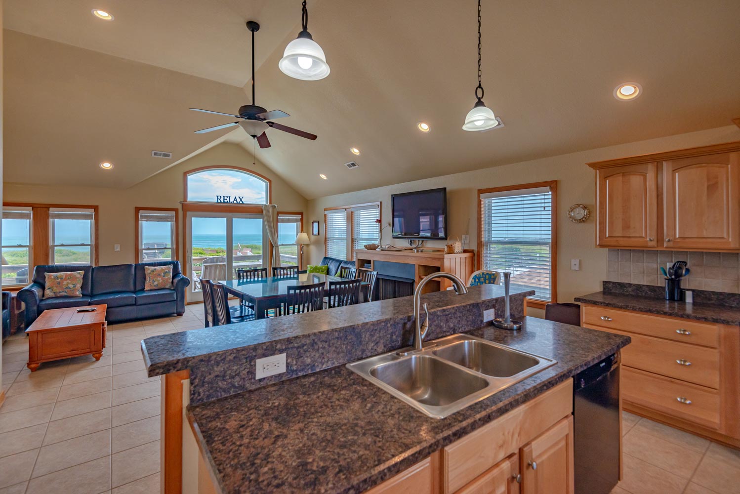 Top Level: Open & Spacious Living/Dining/Kitchen Area featuring Fantastic Ocean Views, Flat Screen HDTV, Gas Fireplace, Half Bath, Oceanfront Private Suite w/King, Flat Screen TV, Full Bath, & Deck Access, & Large Oceanfront Sun Deck.