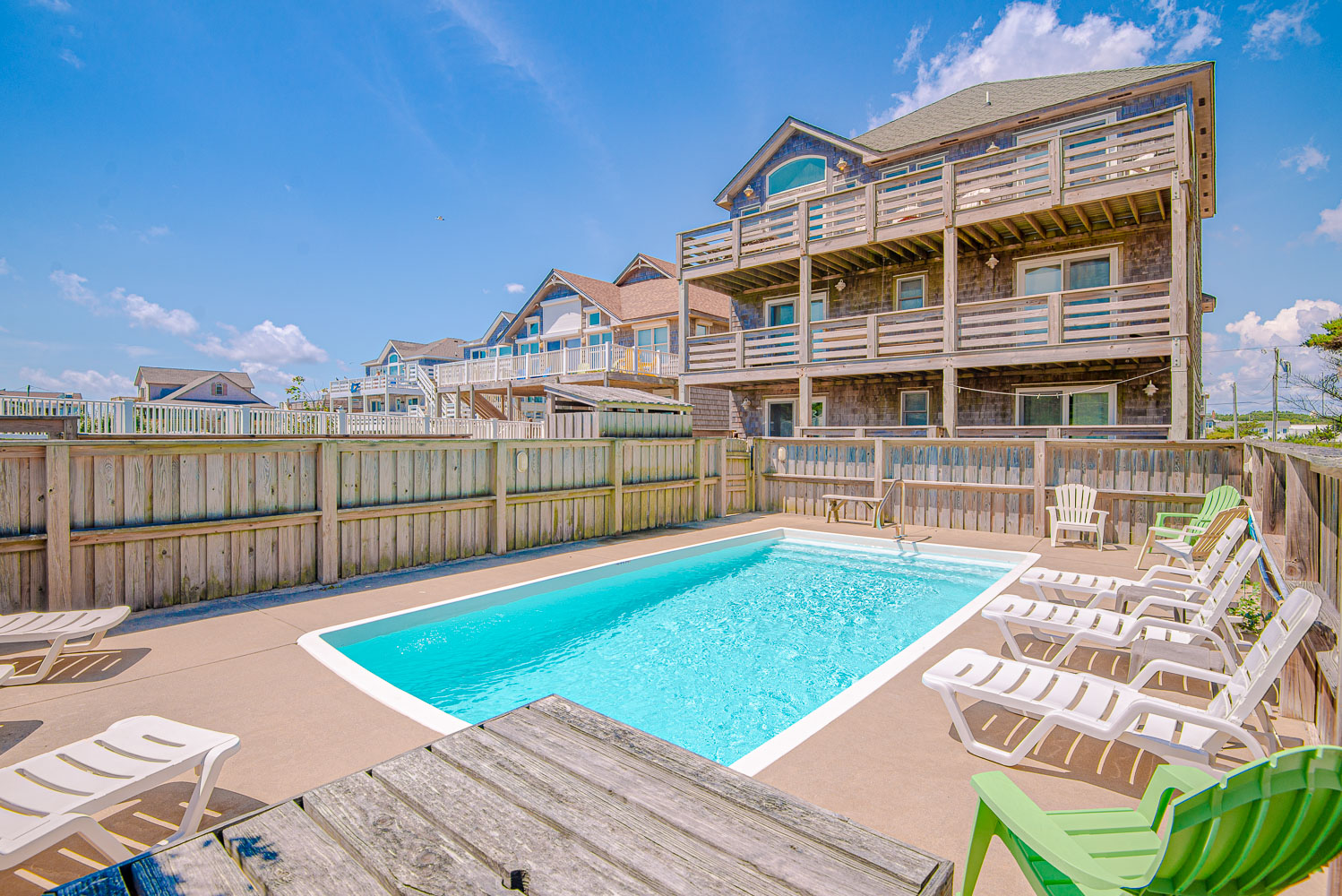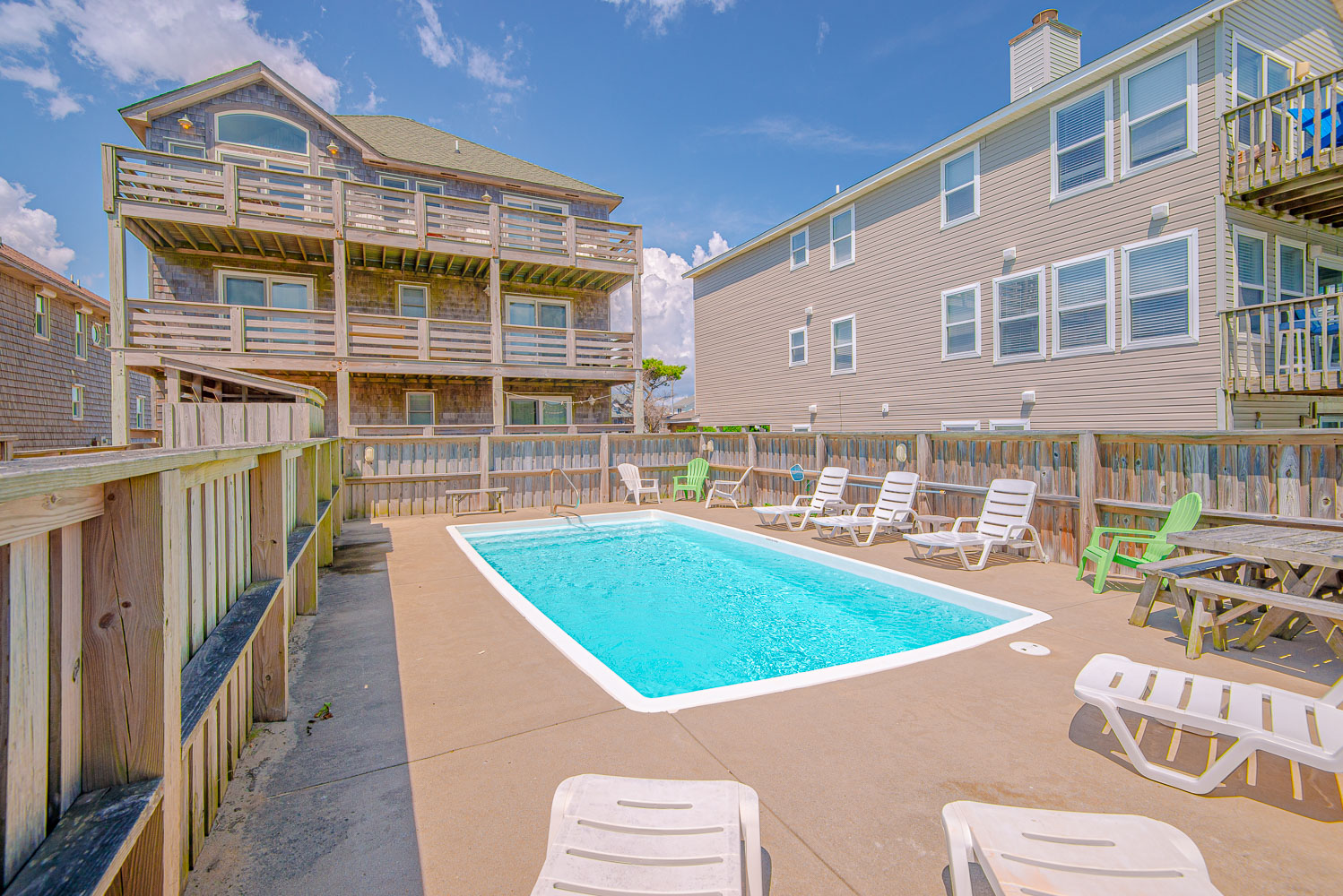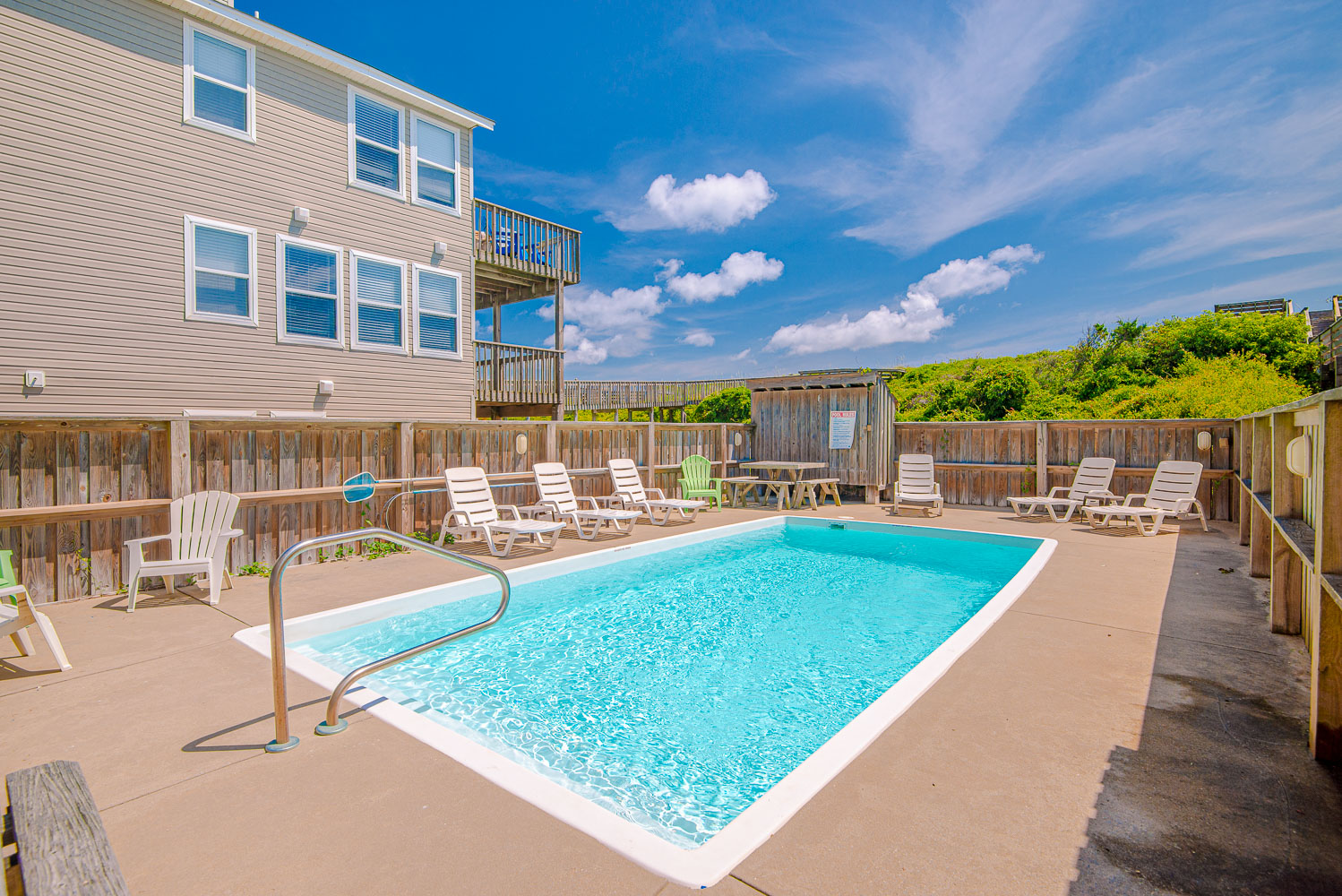 Ground Level: Parking for 5 cars (2 under house), Steps to Entry, Rec. Room w/Pool Table, Wet Bar, TV, Three steps to Elevator , Laundry Area, Full Bath, Bedroom w/King, Flat Screen TV, & Covered Deck Access, Covered Deck w/Steps to Patio Area, Private 16x30 Swimming Pool - Open Seasonally, Hot Tub, Enclosed Outside Shower, Fish Cleaning Station, Park Grill, & Private Walkway to Beach w/Dune Top Deck.