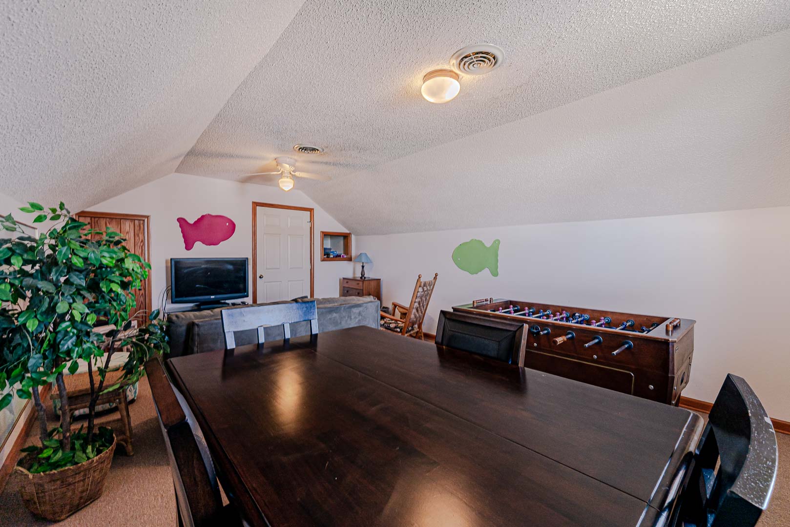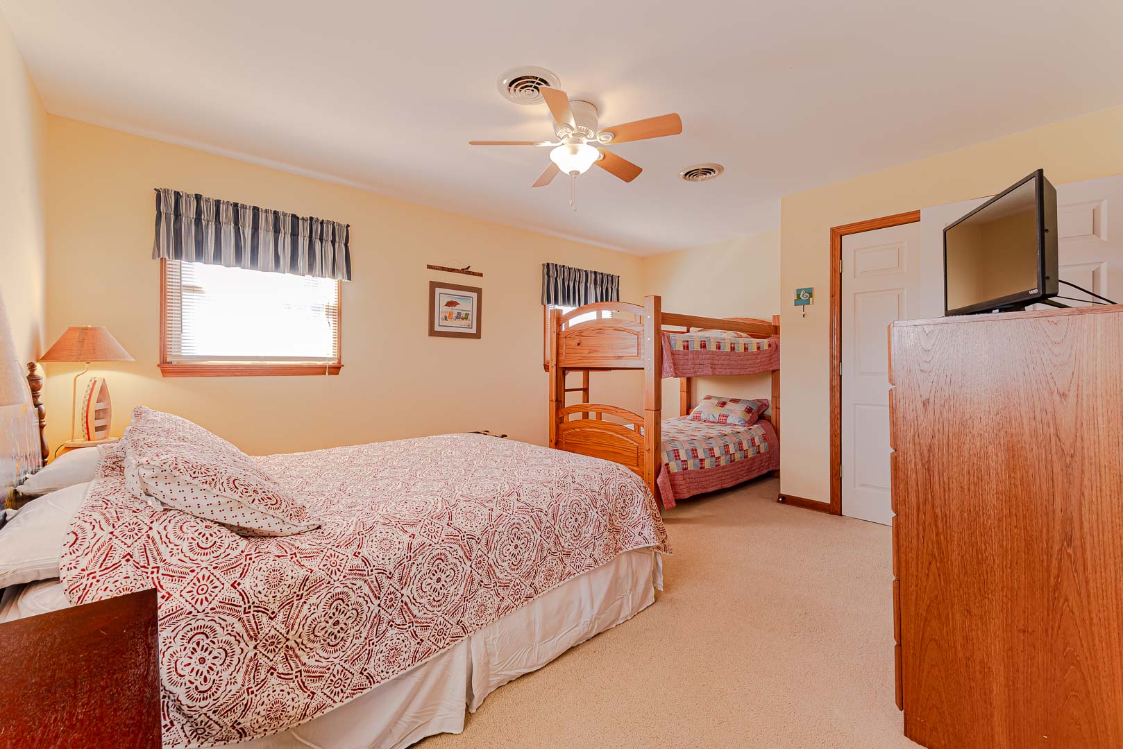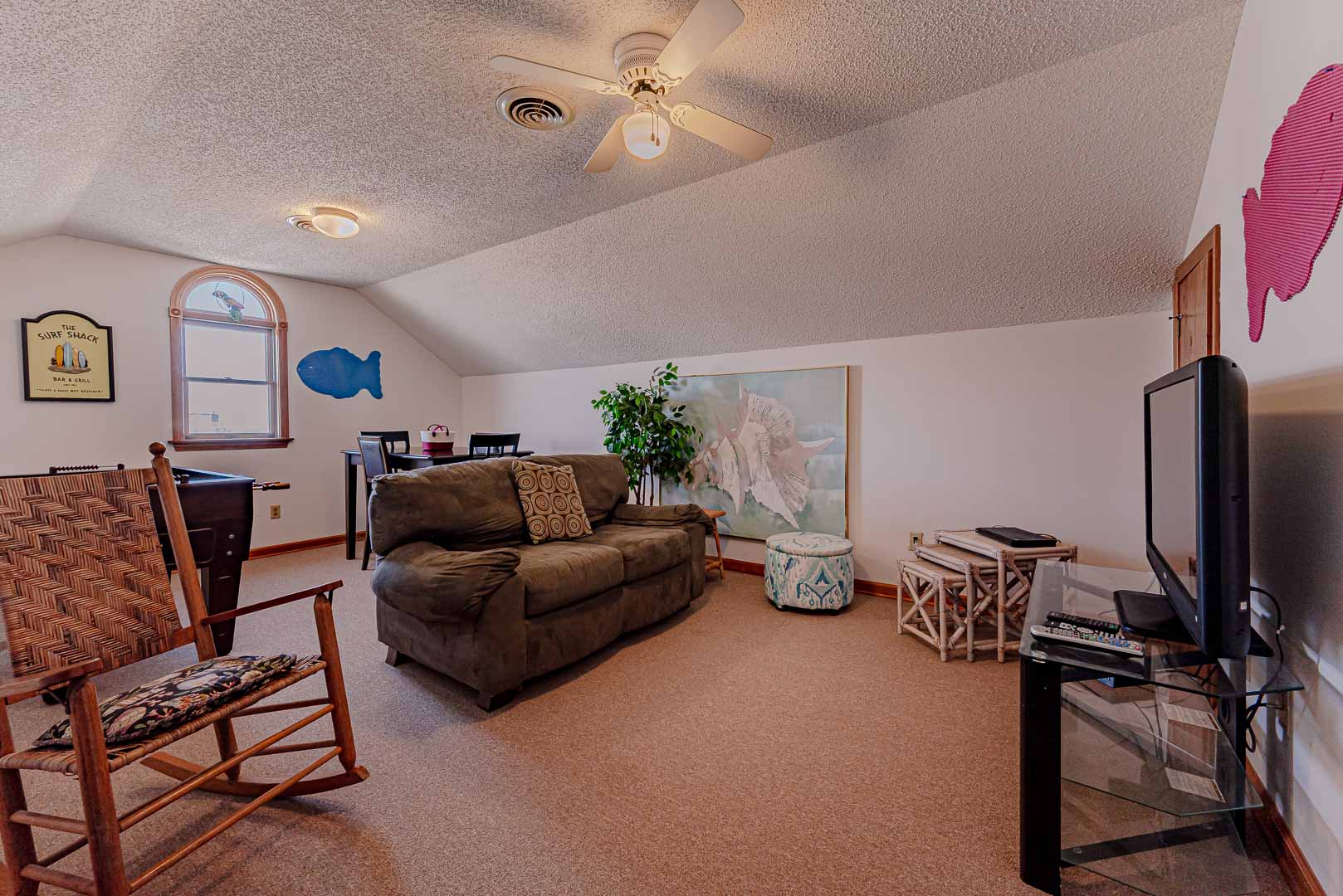 Top Level: 2 Bedrooms (1 w/Queen, Bunk Set, & TV & 1 w/Queen & TV), Rec. Room w/Large Flat Panel TV/DVD, Foosball Table, Card Table, 1 Full Bath, & Sun Deck w/Built-In Seating & Beautiful Ocean Views.