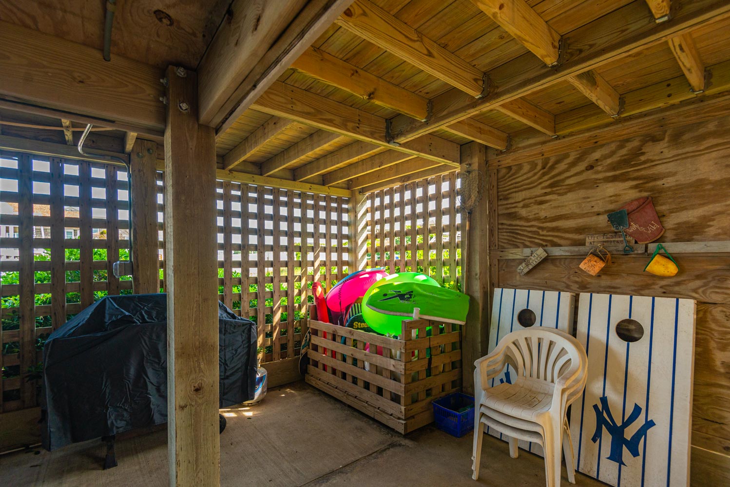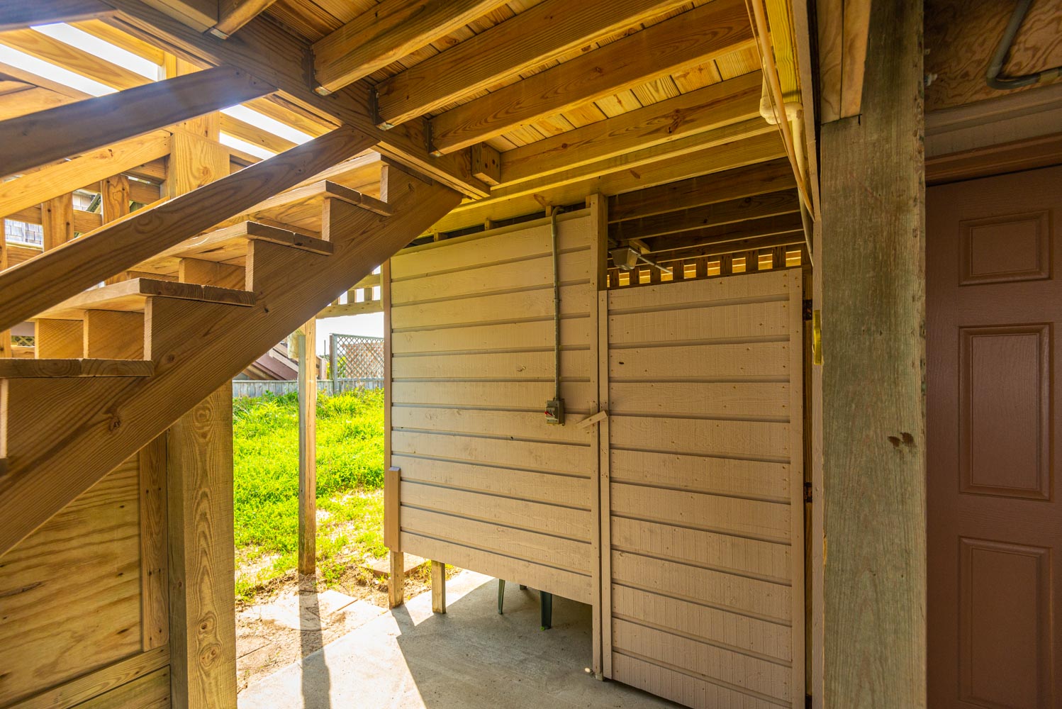 Ground Level: Parking for 4 Cars, Large Concrete Under House Area w/Picnic Table & Outdoor Furniture, Carport, Covered Entry, Bedroom w/2 Singles & TV, Full Bath, & Enclosed Outside Shower.