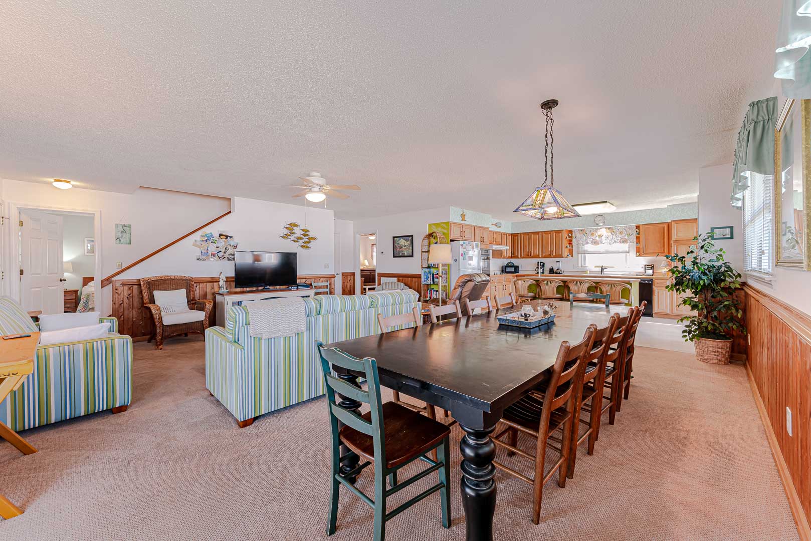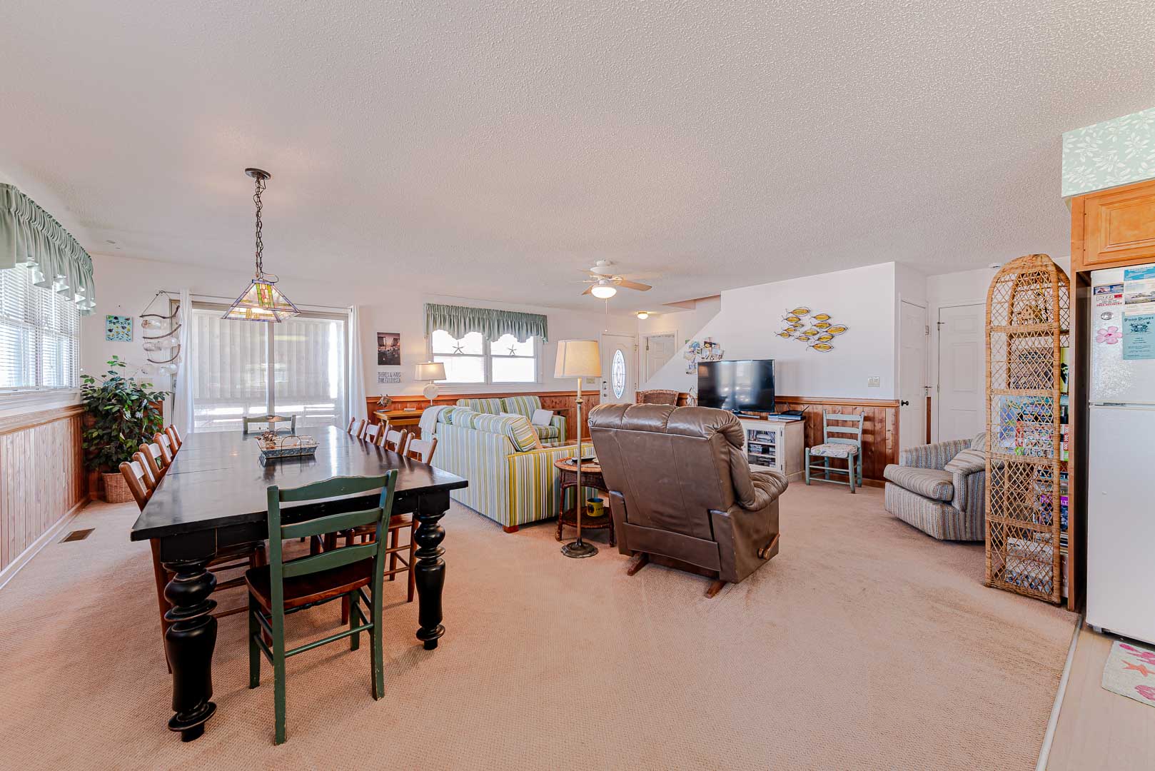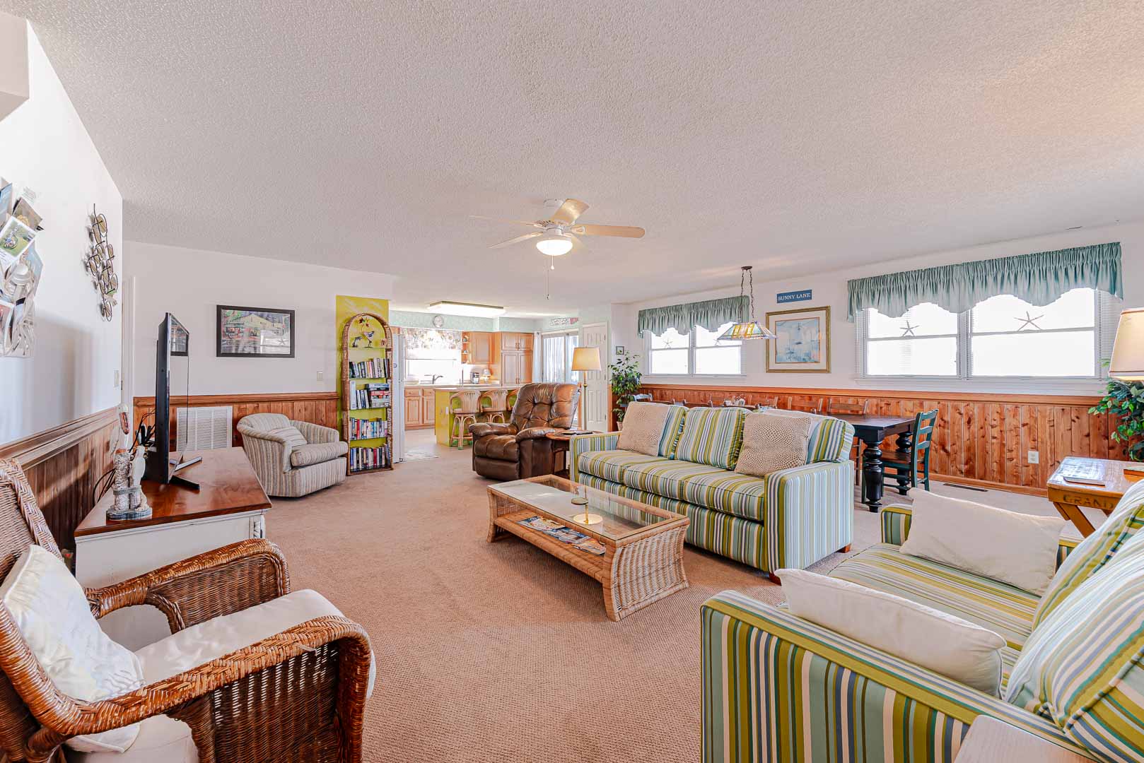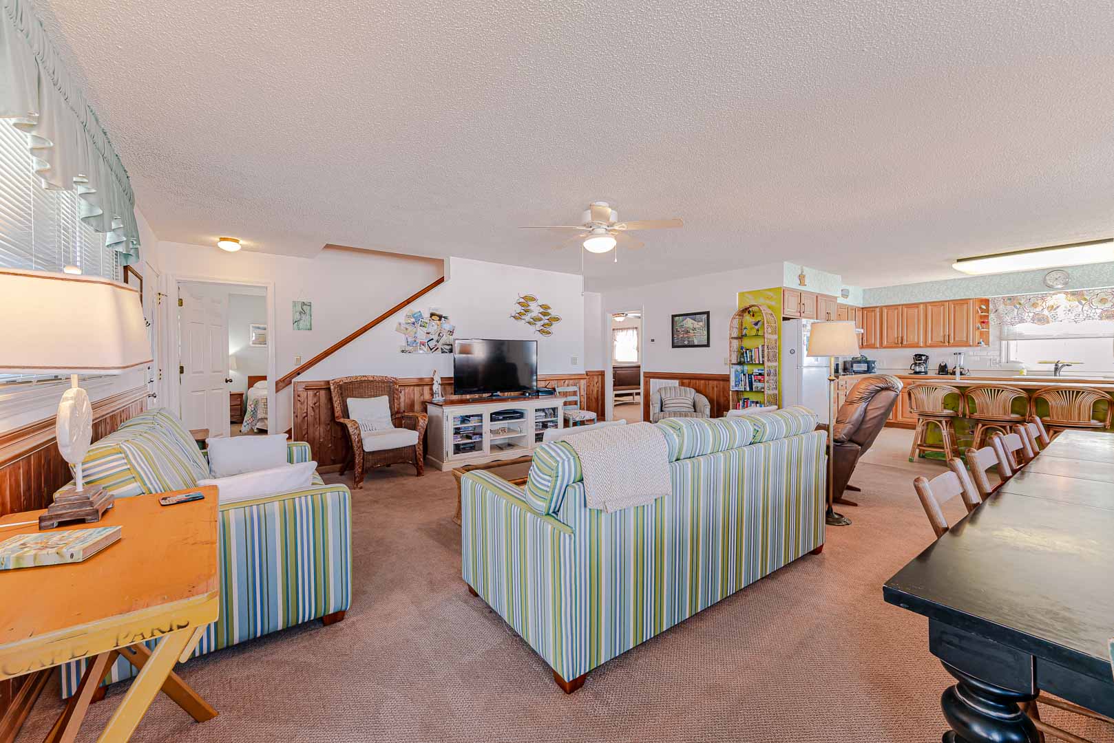 Mid Level: Living/Dining/Kitchen Area, Large Flat Panel TV, Half Bath, 2 Bedrooms (1 w/King & TV, 1 w/Queen & TV, & Shared Full Bath, & Wrap Around Covered Deck w/Built-In Seating, Deck Furniture, & Ocean Views.