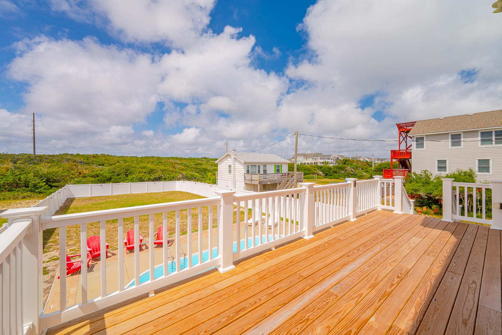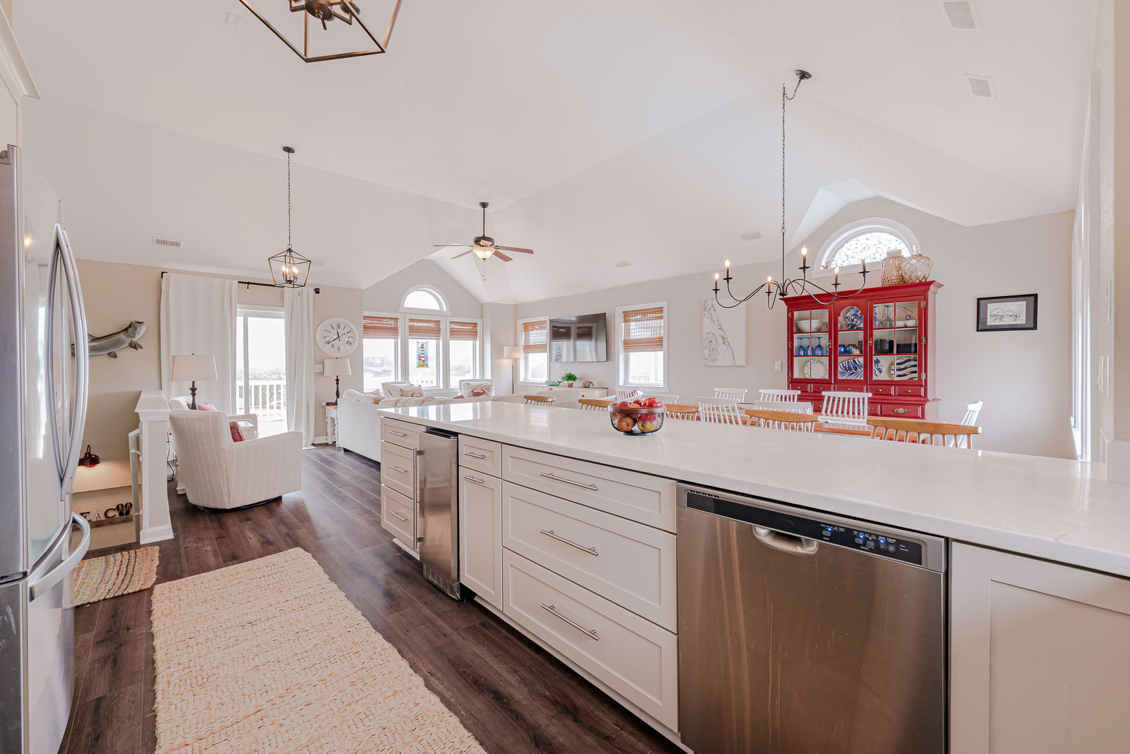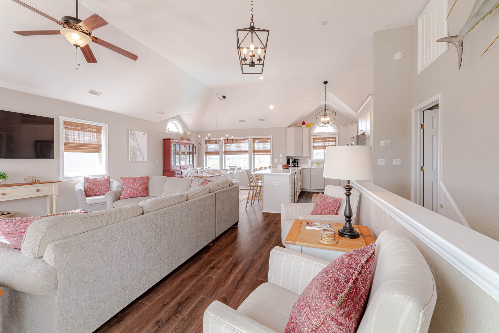 Top Level: Spacious Living Area, Cathedral Ceilings, TV, Ample Windows for Natural Light, Ocean Views; Fully Updated Kitchen, Stainless Steel Appliances, Breakfast Bar w/Seating; Dining Area; Bedroom w/King, TV, Full Bath w/Tiled Walk-In Shower; Jockey’s Ridge Views, and Ocean Facing Sun Deck w/Furniture.