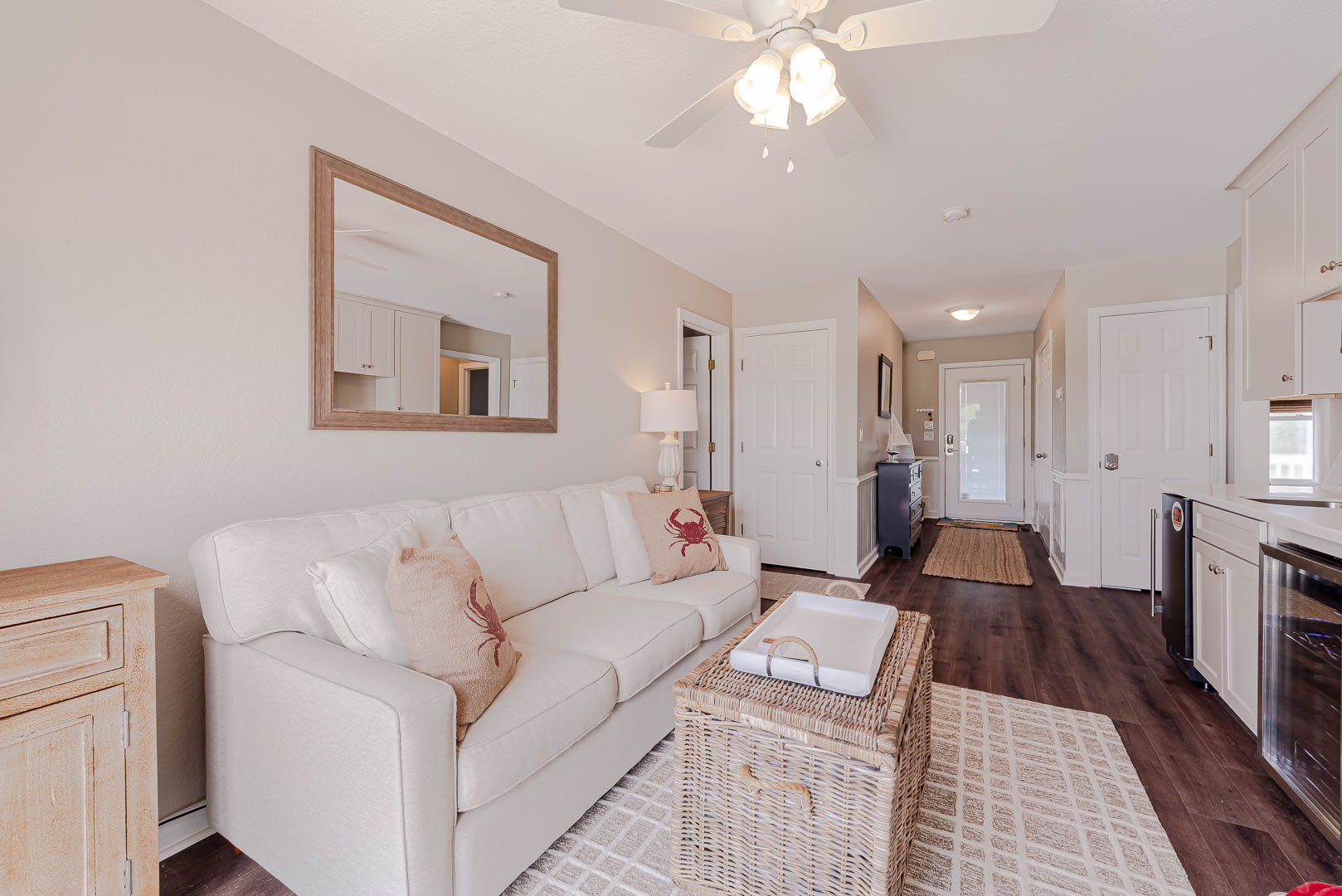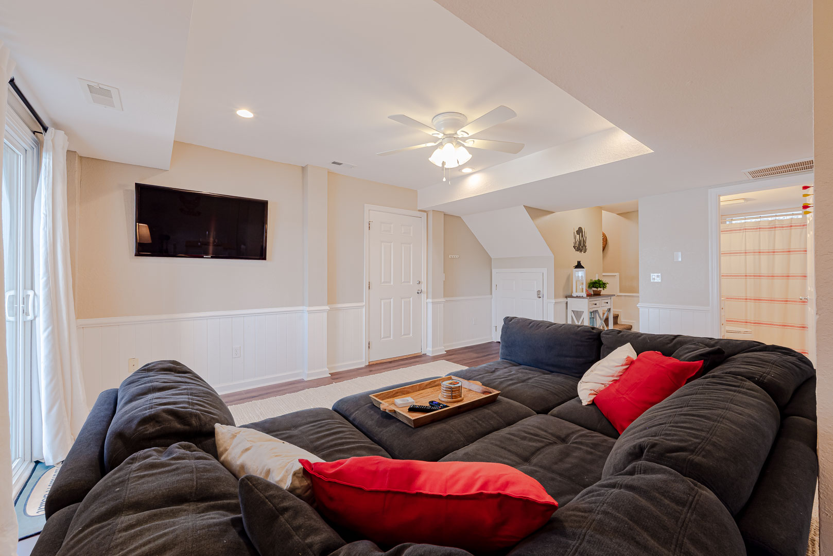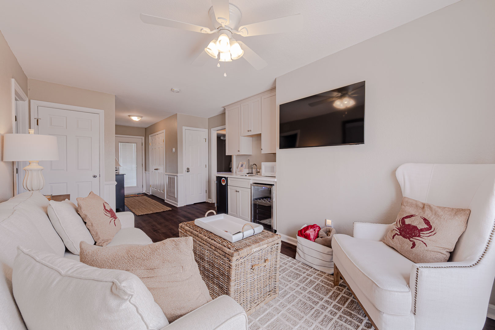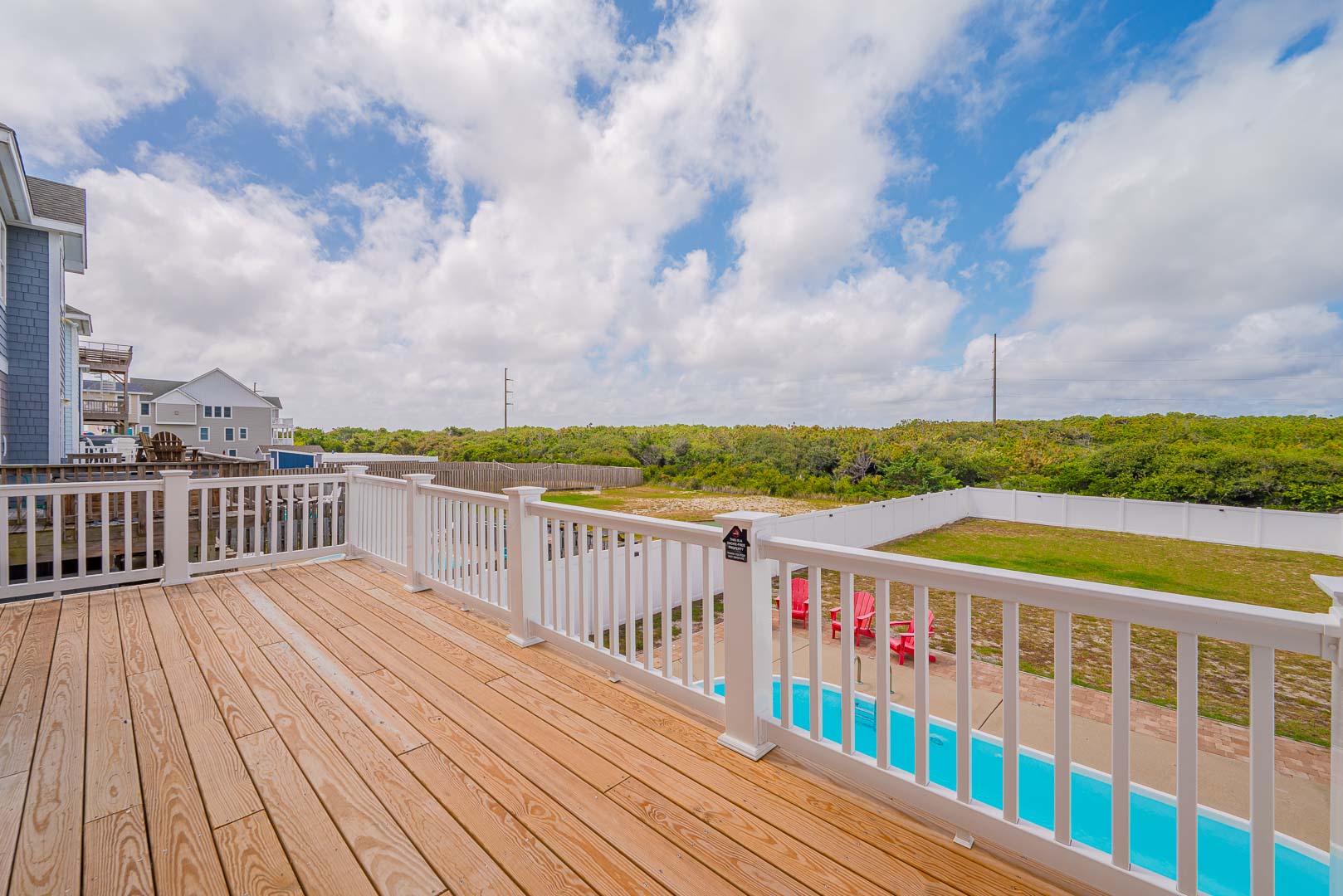 Top Level: Spacious Living Area, Cathedral Ceilings, TV, Ample Windows for Natural Light, Ocean Views; Fully Updated Kitchen, Stainless Steel Appliances, Breakfast Bar w/Seating; Dining Area; Bedroom w/King, TV, Full Bath w/Tiled Walk-In Shower; Jockey’s Ridge Views, and Ocean Facing Sun Deck w/Furniture.