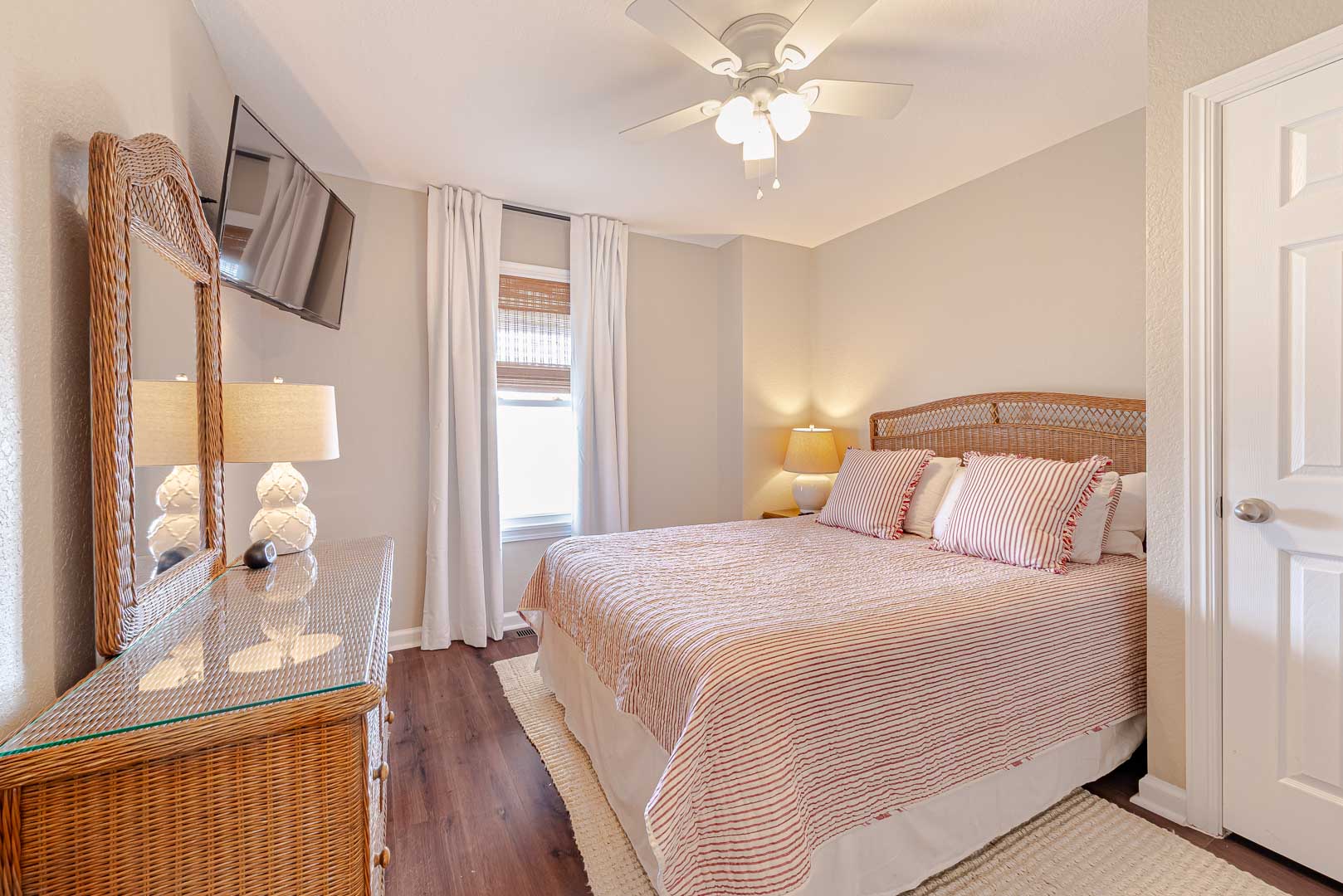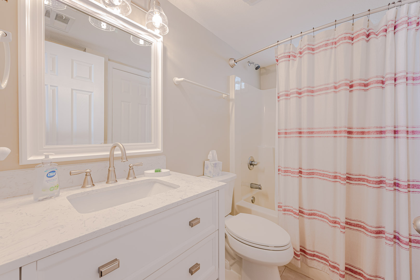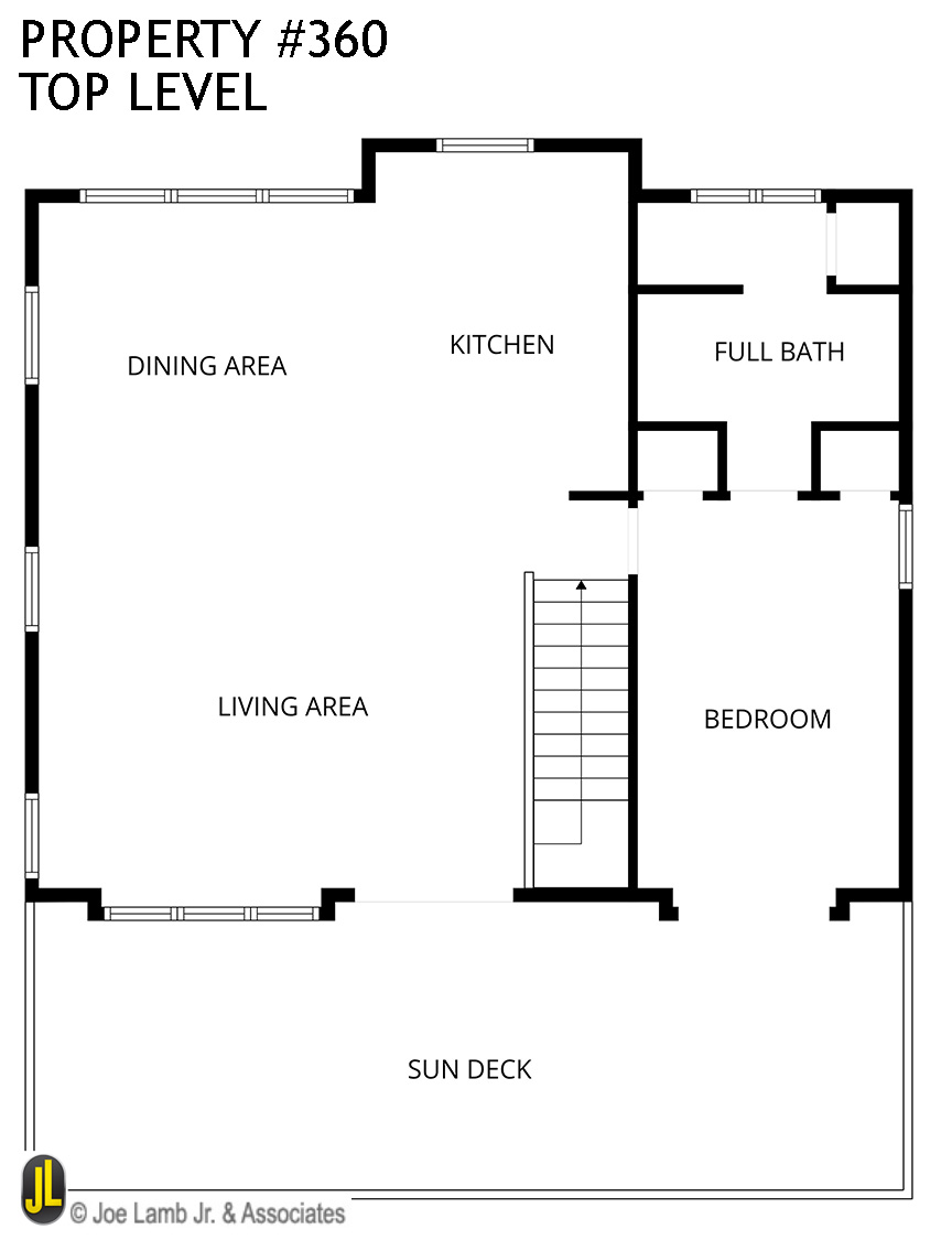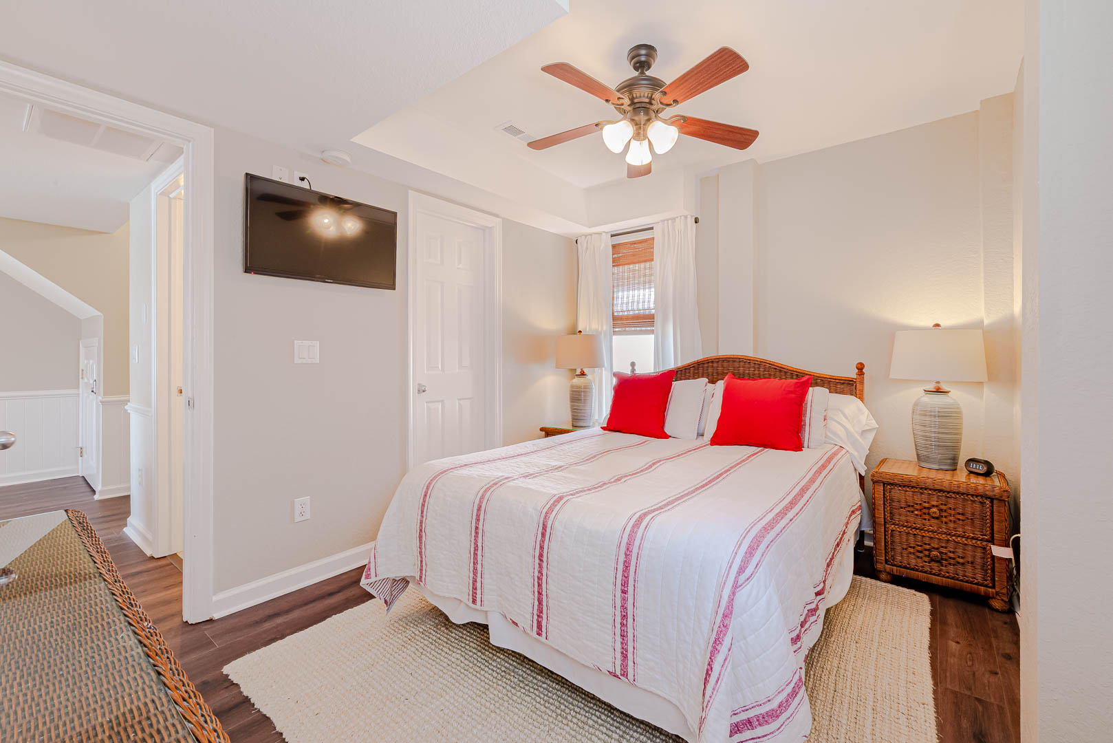 Mid Level: Foyer Entry, Den, TV, Queen Sleep Sofa, Wet Bar, Beverage Coolers, 3 Bedrooms (Private Suite w/King, TV, Full Bath w/Large Tiled Walk-In Shower; 1 w/King, TV; 1 w/Queen, TV), Full Hall Bath w/Tub/Shower, Covered Deck and Sun Deck w/Deck Furniture.