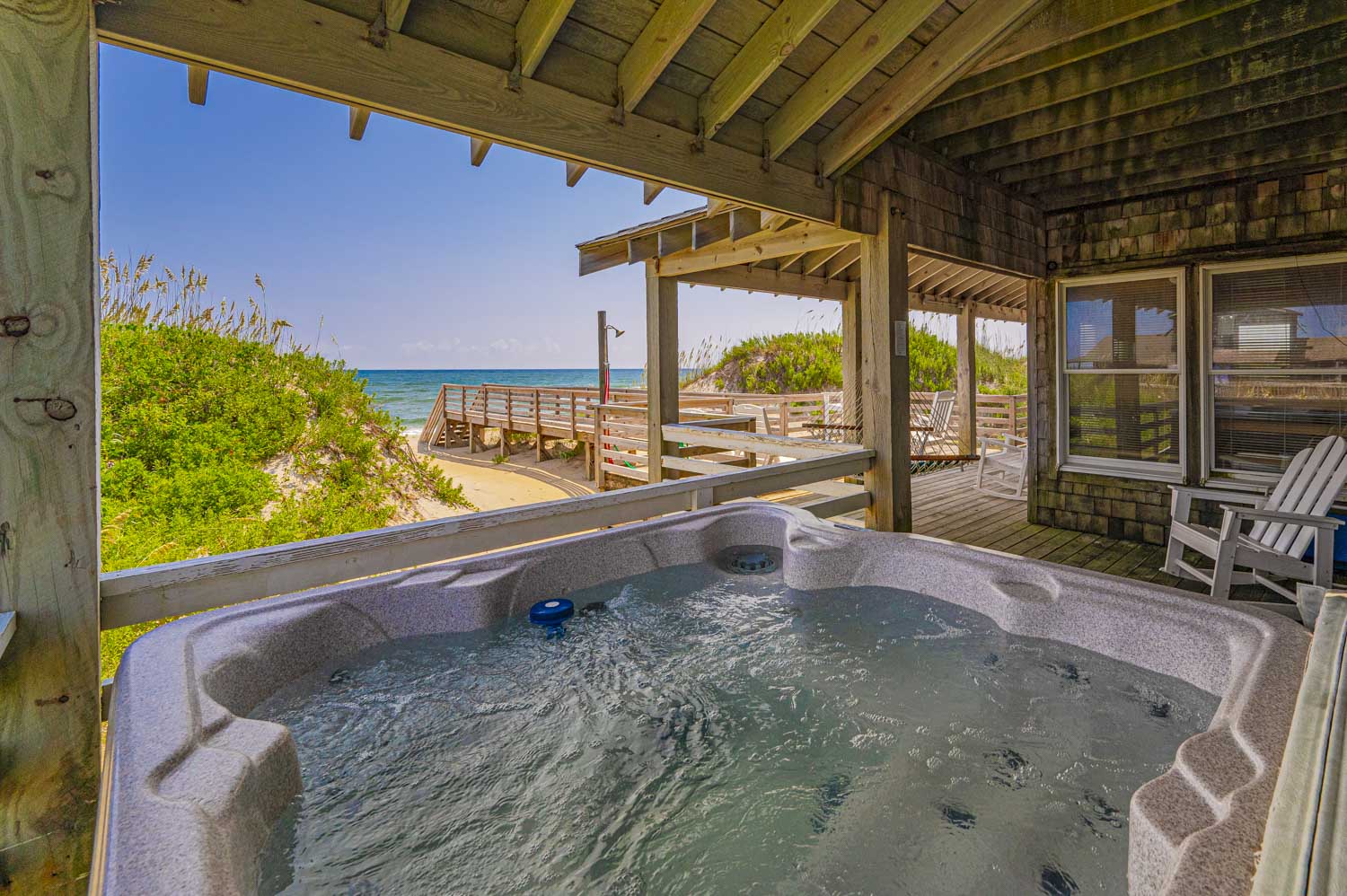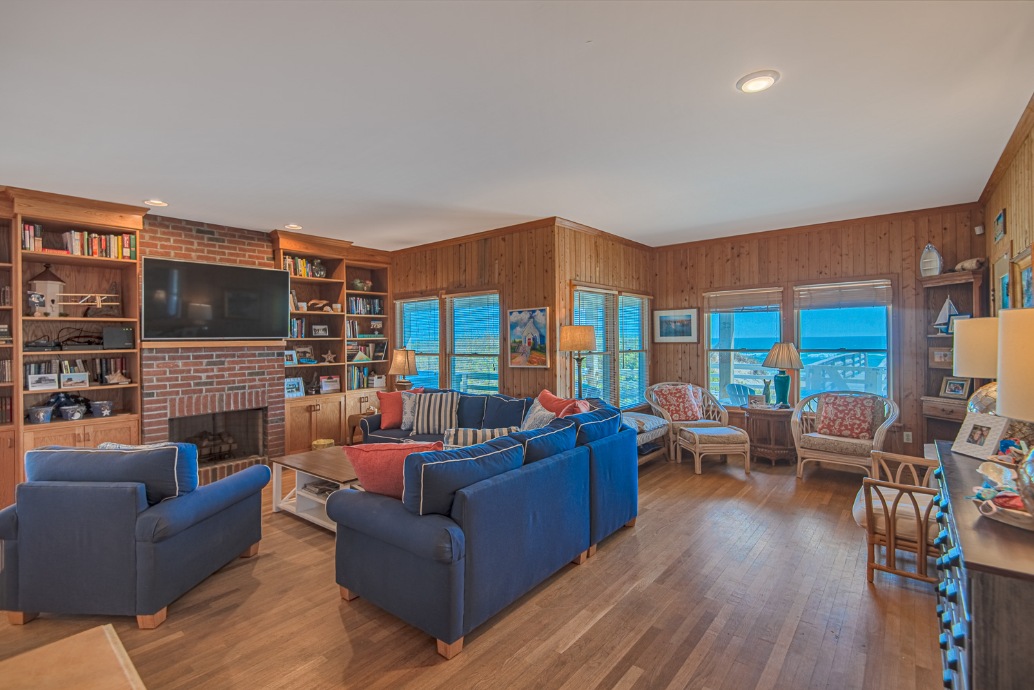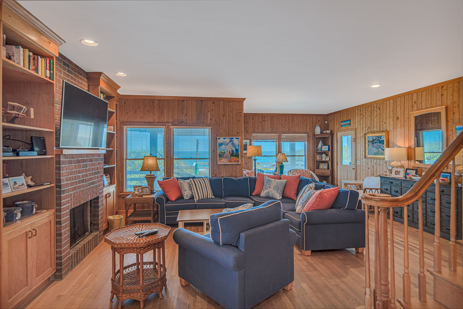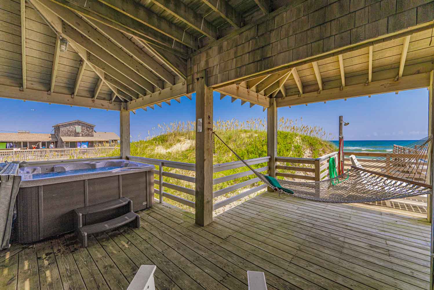 Mid Level: Living/Dining/Kitchen Area, TV, 2 Bedrooms (1 w/King, TV; 1 w/Queen, TV), Half Bath, Full Hall Bath w/Tub/Shower, Covered Deck w/Hot Tub, Sun Deck, and Walkway to Beach.