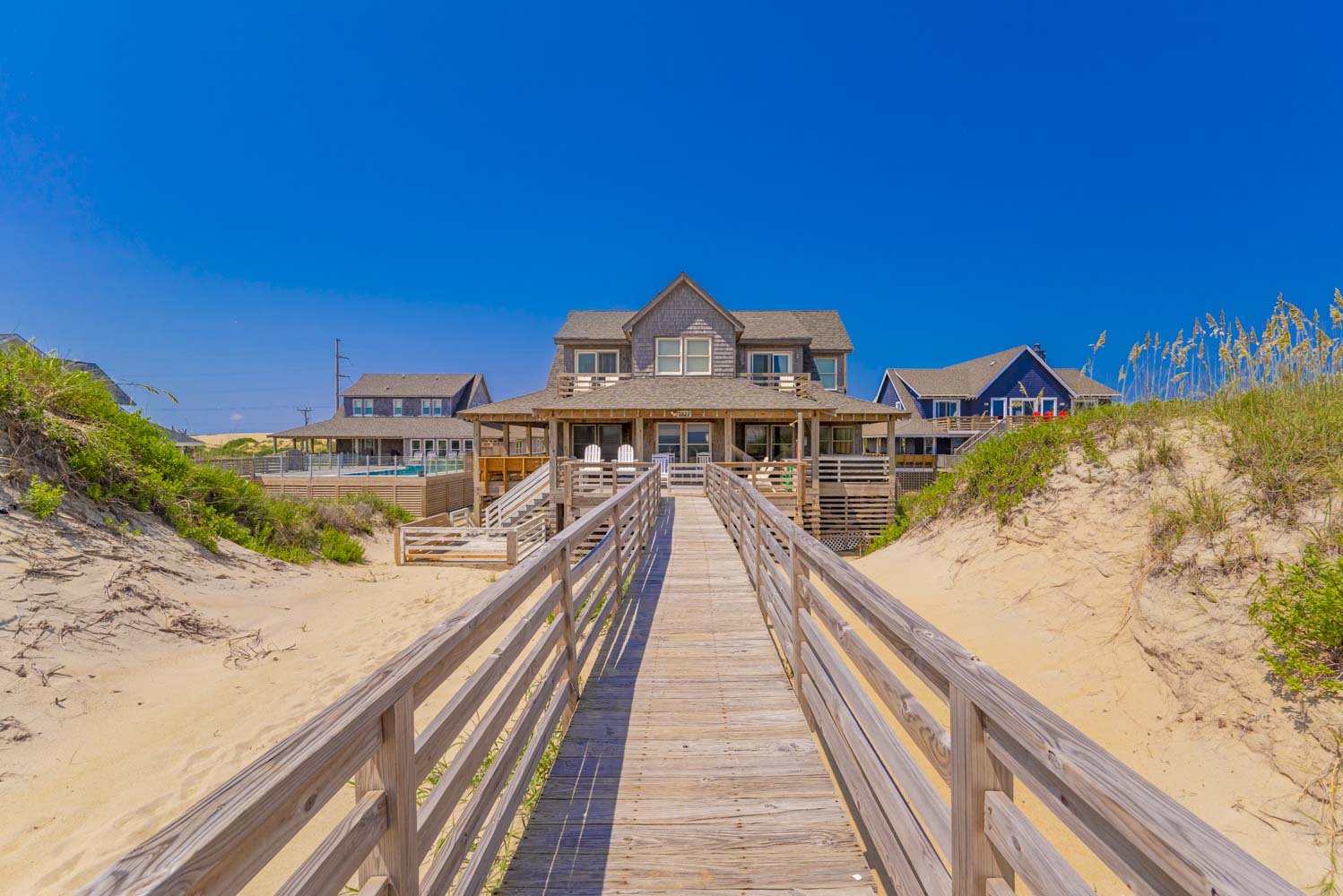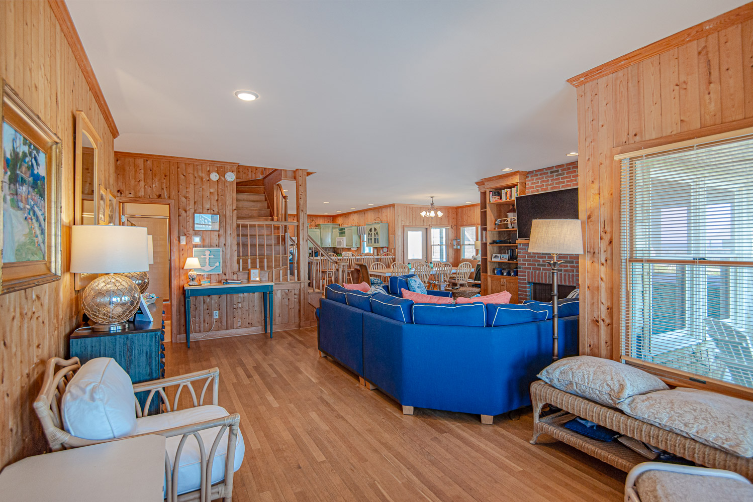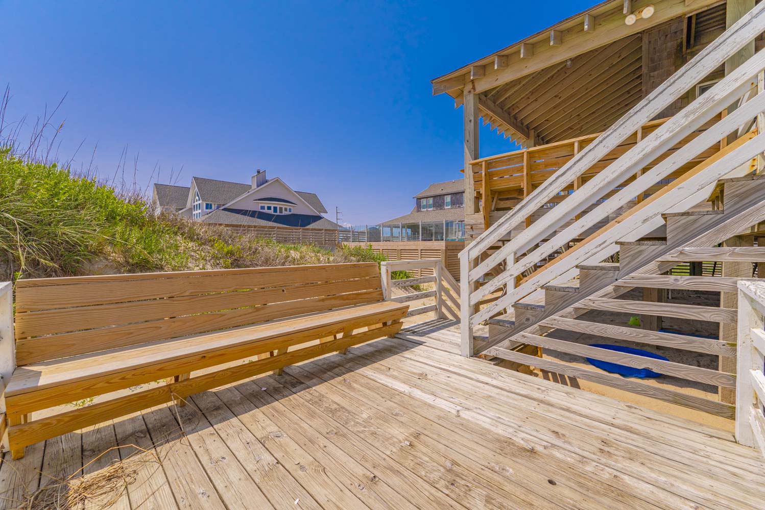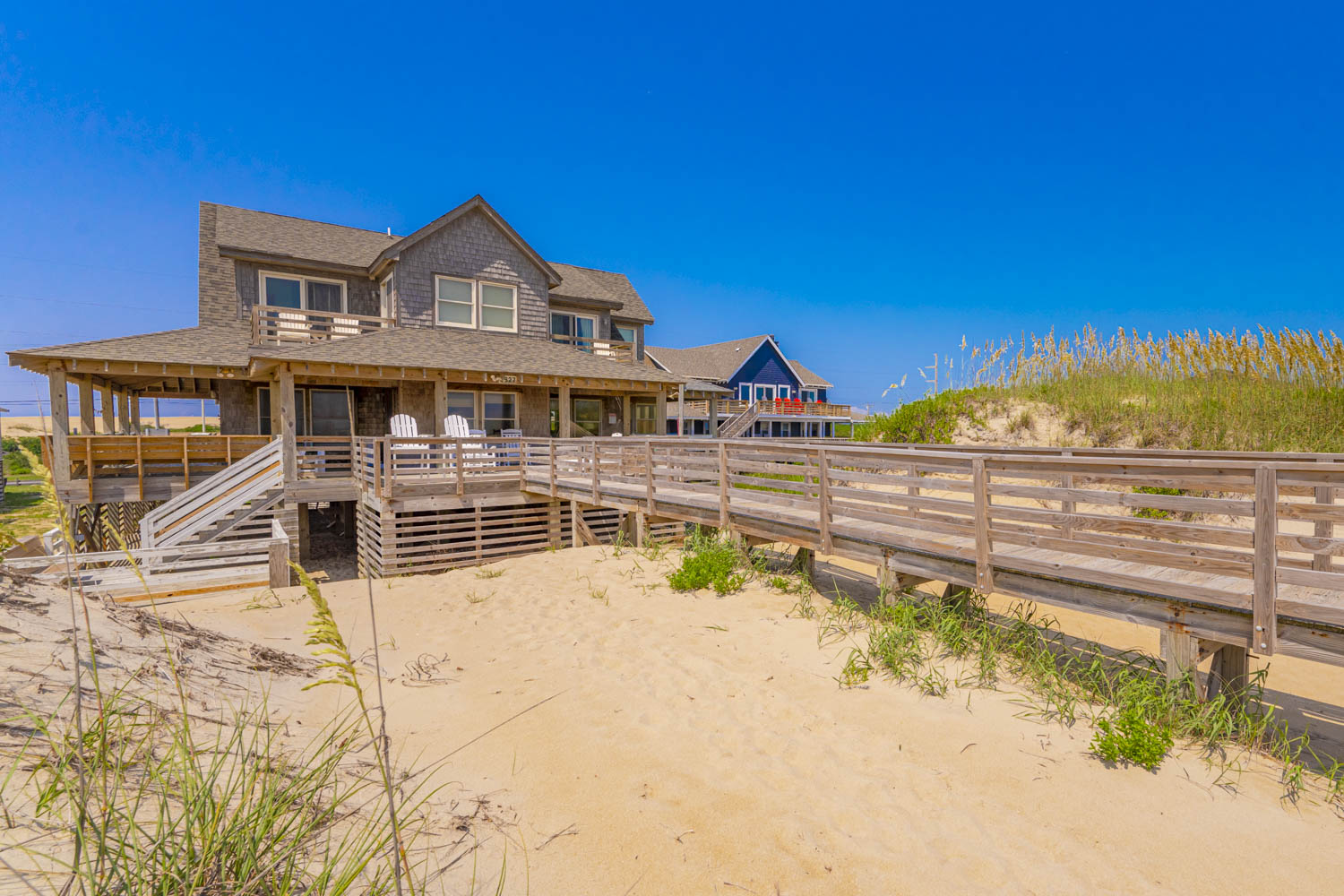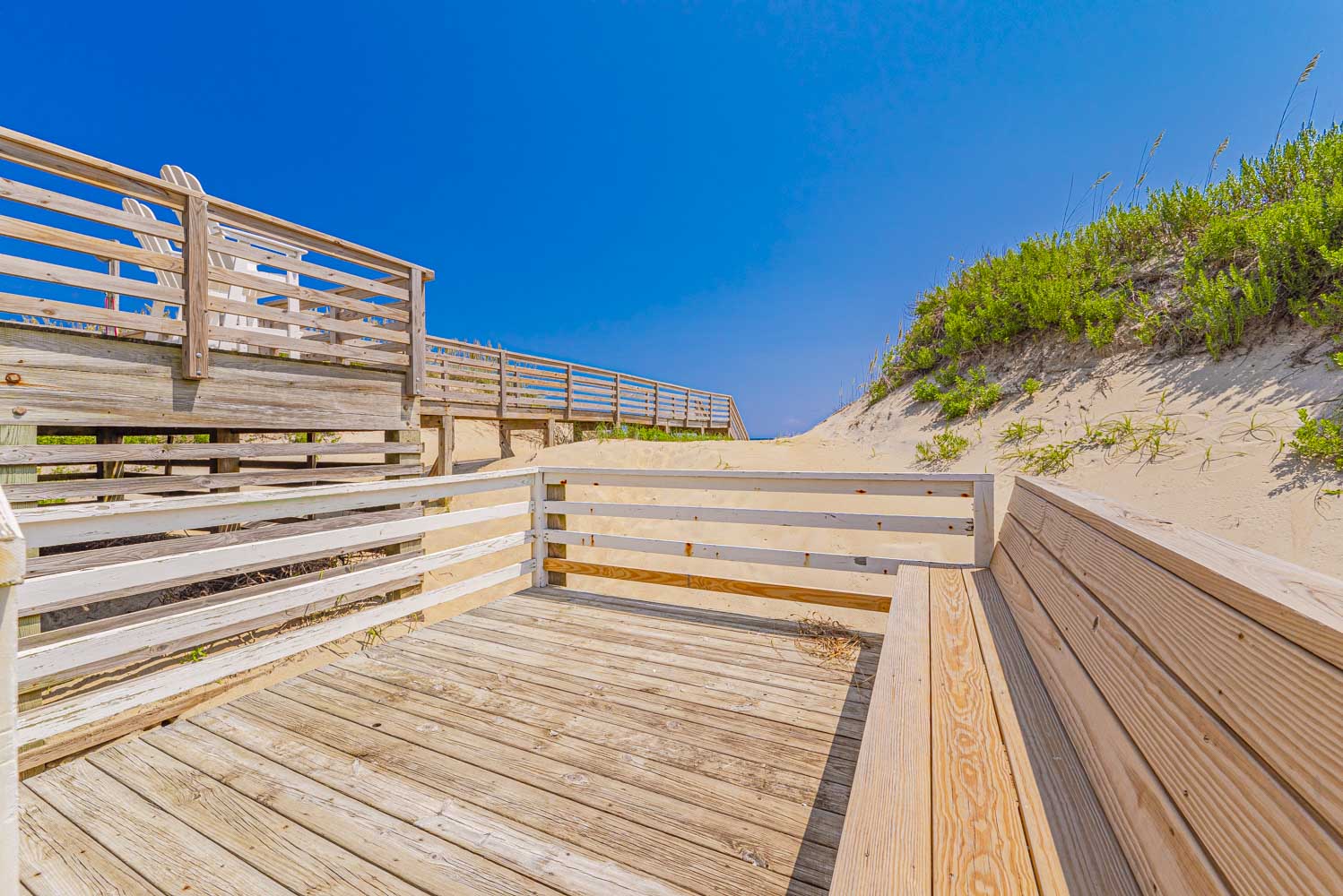 Mid Level: Living/Dining/Kitchen Area, TV, 2 Bedrooms (1 w/King, TV; 1 w/Queen, TV), Half Bath, Full Hall Bath w/Tub/Shower, Covered Deck w/Hot Tub, Sun Deck, and Walkway to Beach.