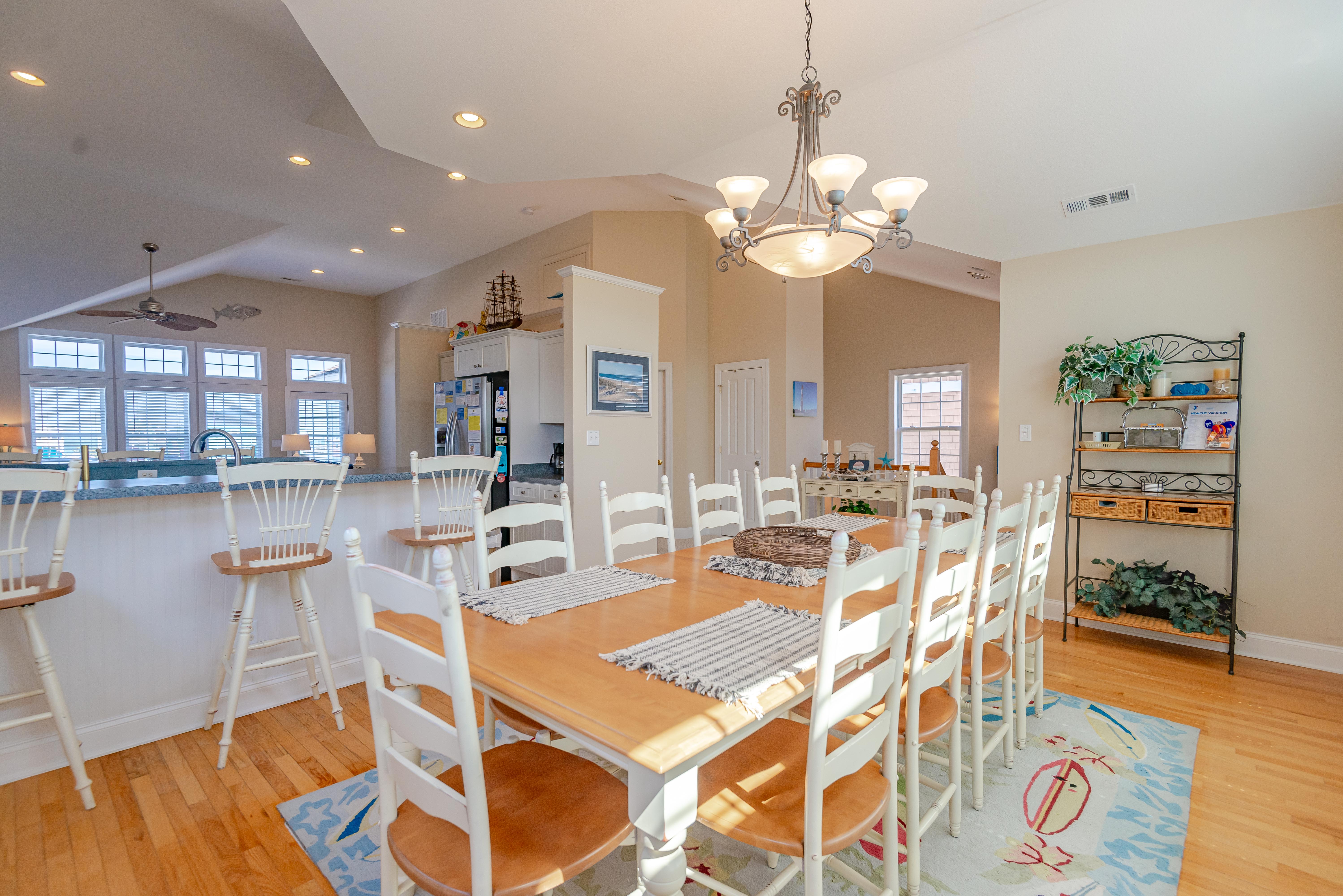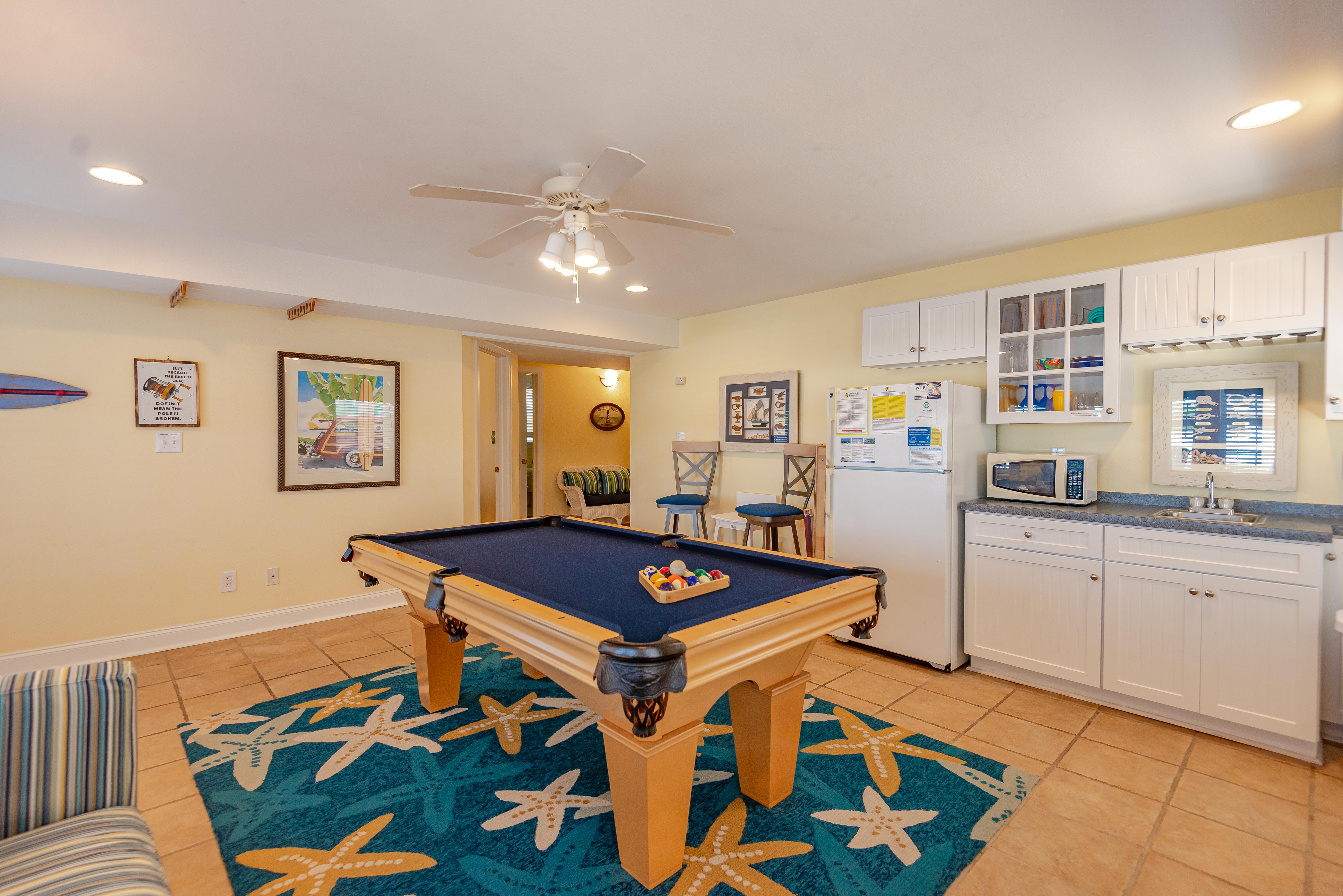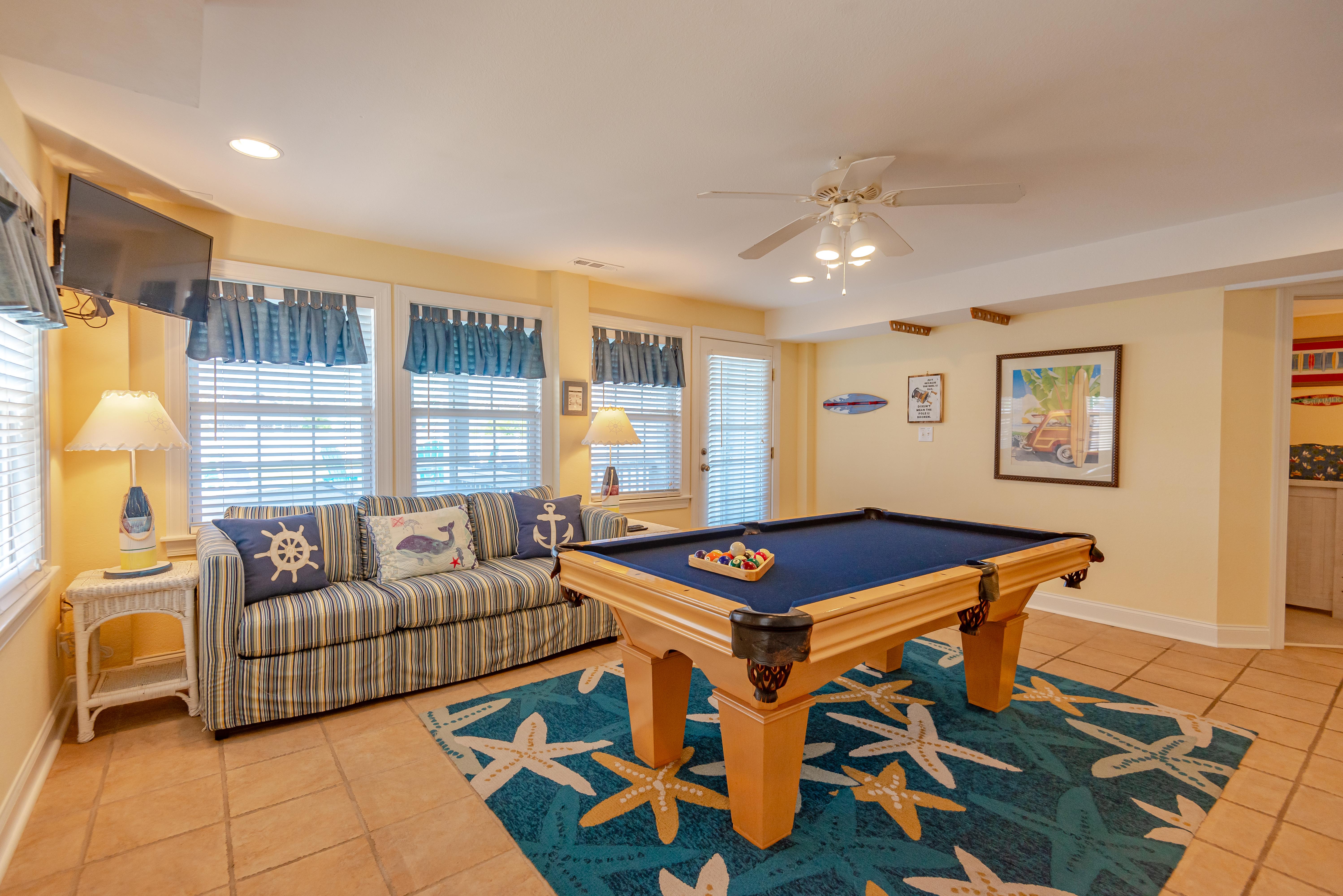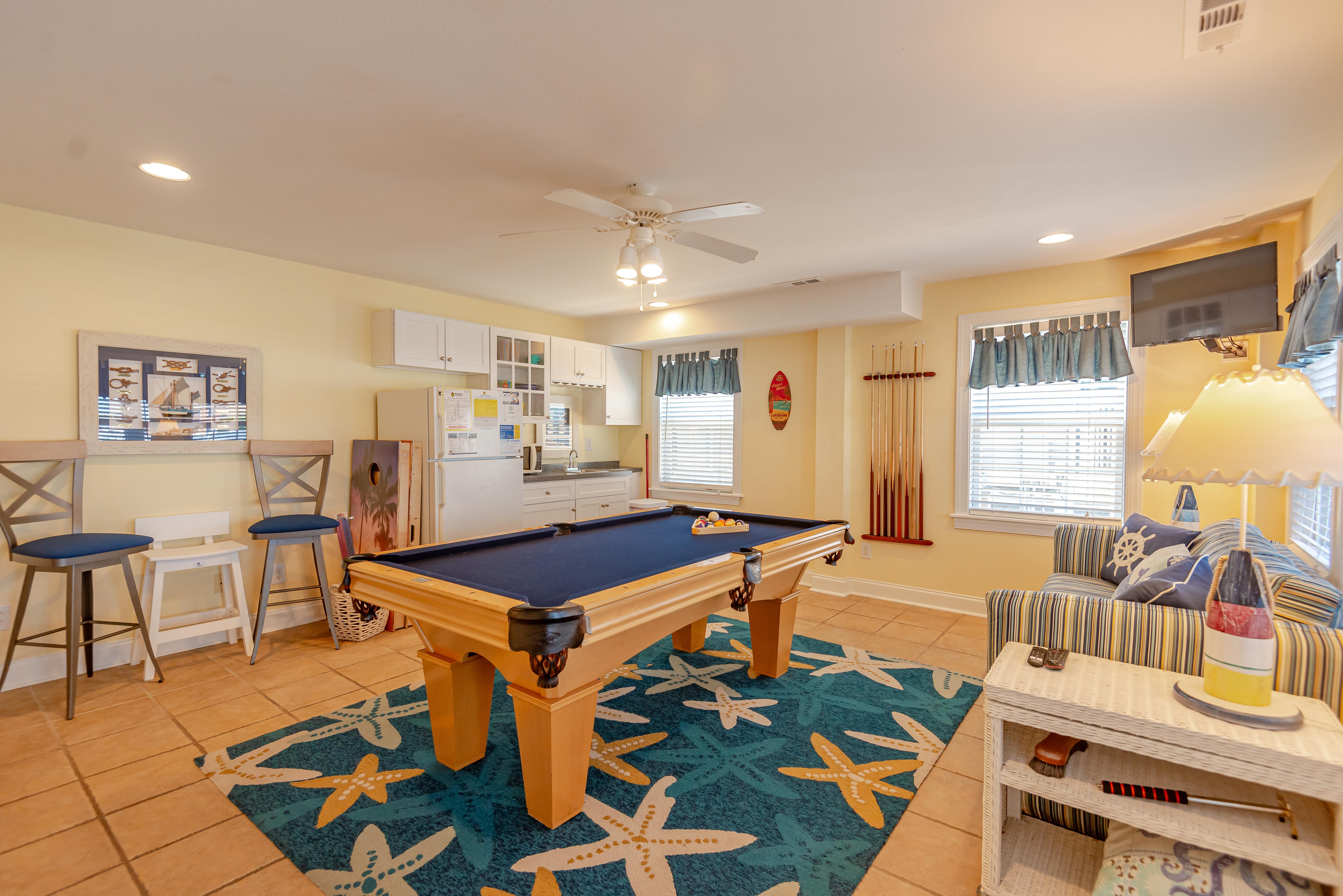 Top Level: Living/Dining/Kitchen, Unique Bar Surrounding Kitchen, TV, DVD, Gas Fireplace, Half Bath, Ocean Views, Grand Private Suite w/King, TV, Full Bath w/Jacuzzi, and Access to Sun Deck w/Furniture Overlooking Back Yard & Pool Area.