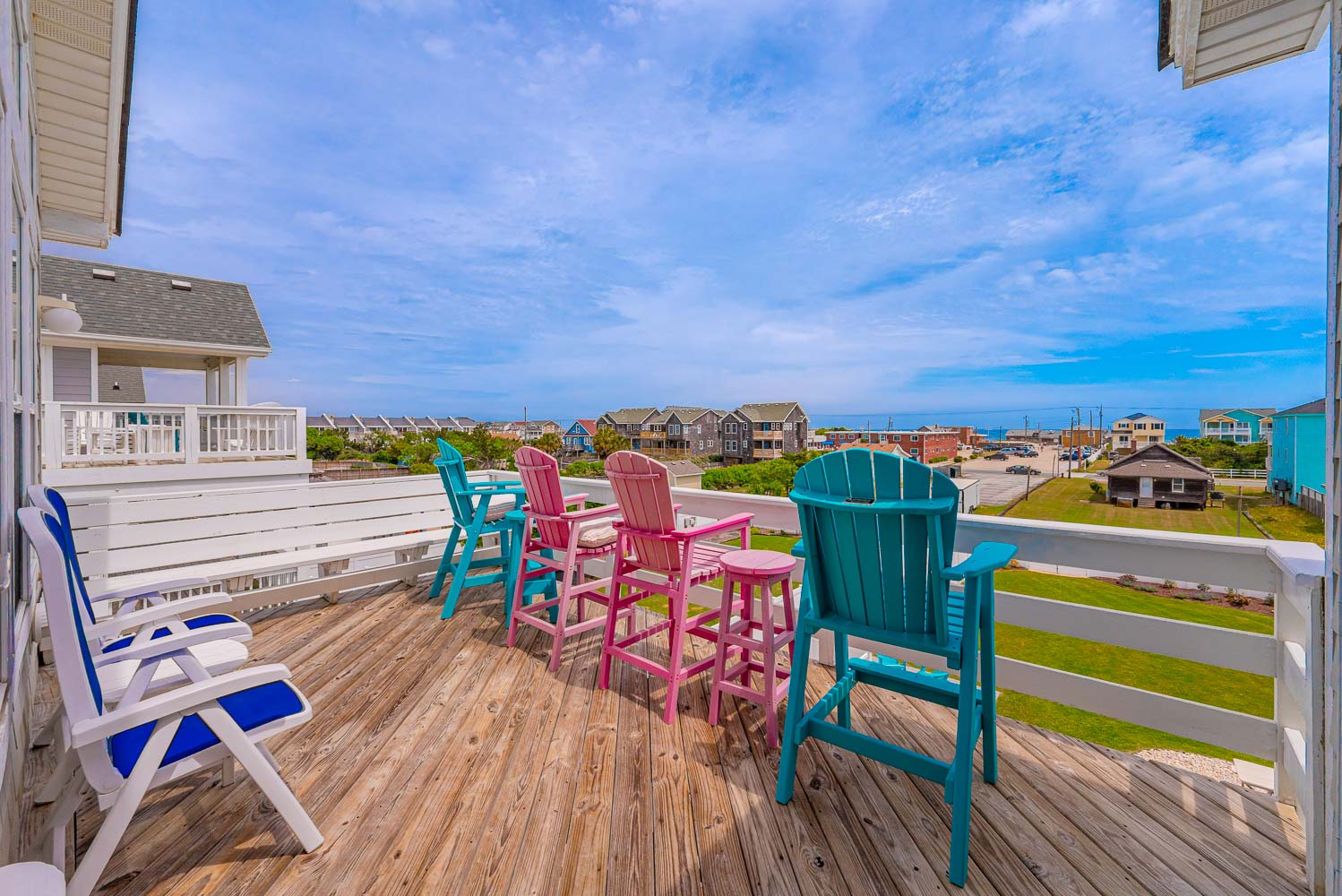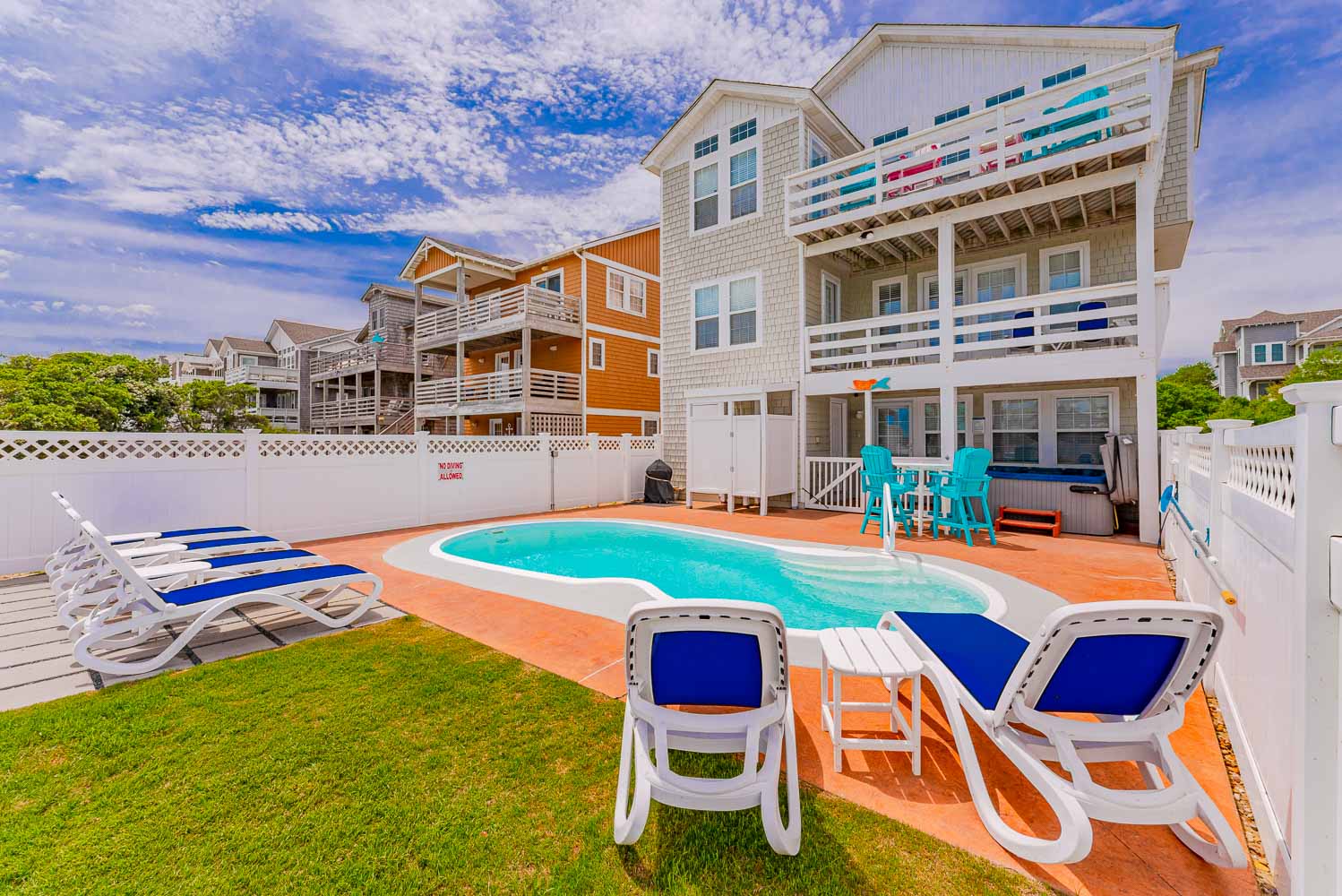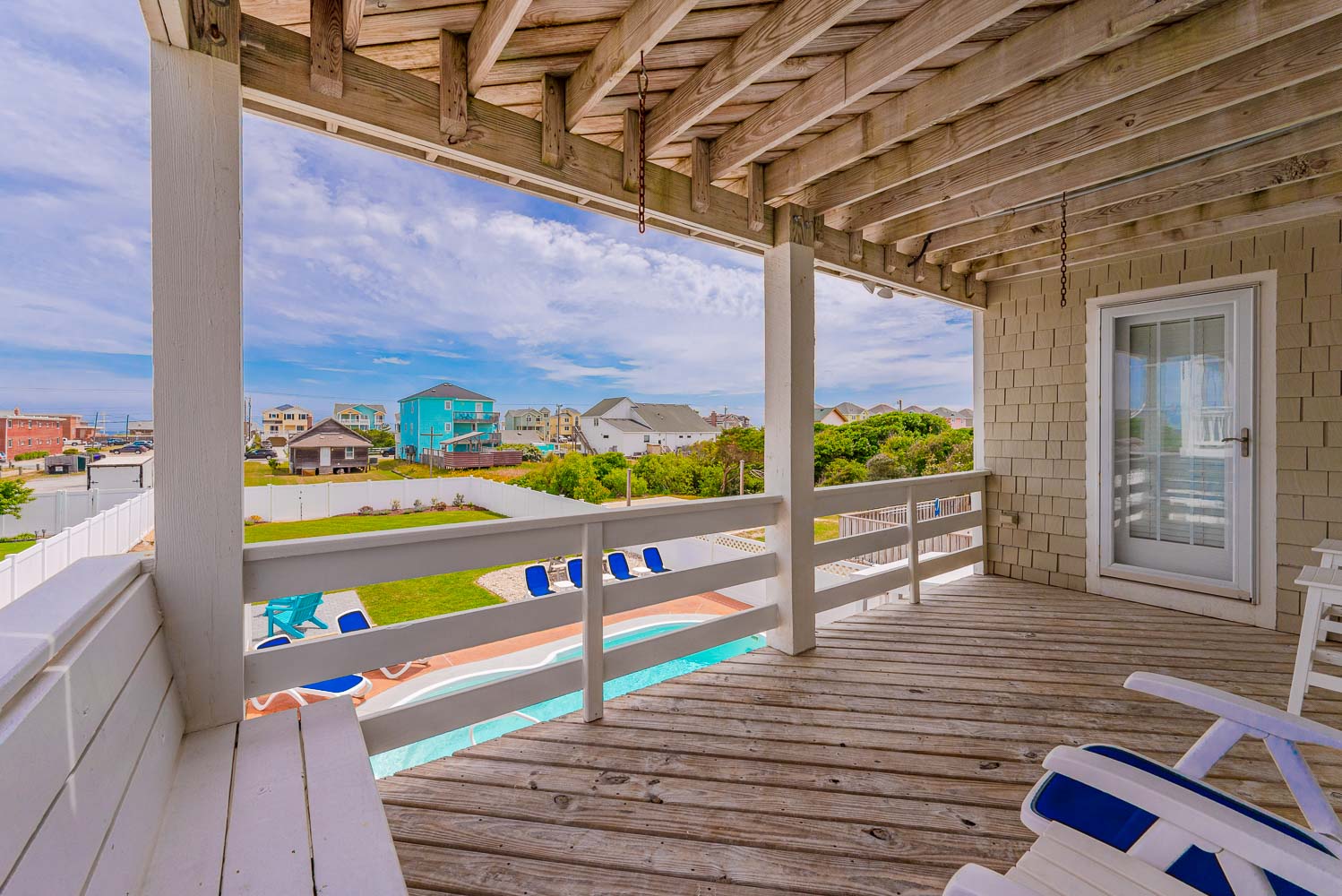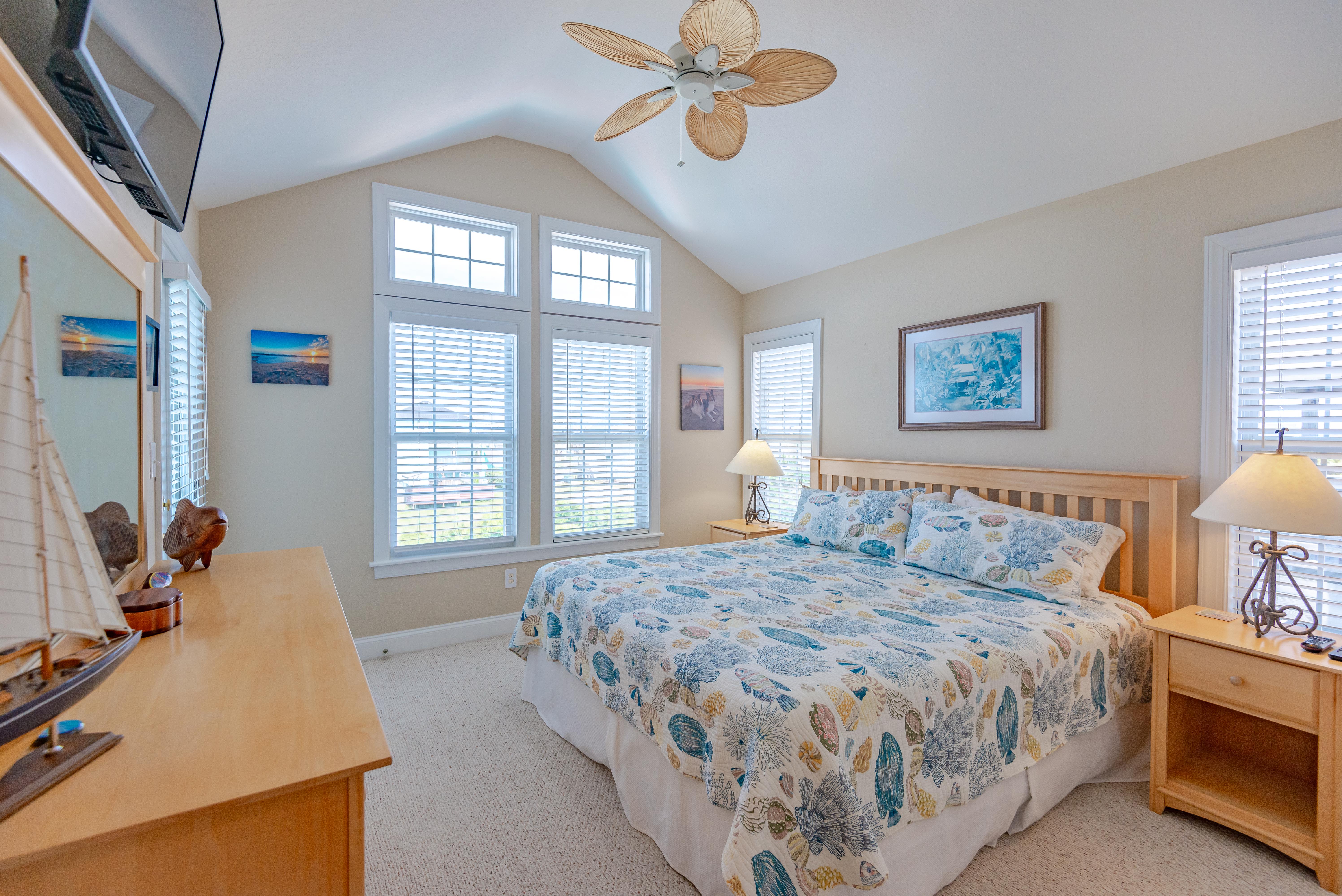 Top Level: Living/Dining/Kitchen, Unique Bar Surrounding Kitchen, TV, DVD, Gas Fireplace, Half Bath, Ocean Views, Grand Private Suite w/King, TV, Full Bath w/Jacuzzi, and Access to Sun Deck w/Furniture Overlooking Back Yard & Pool Area.