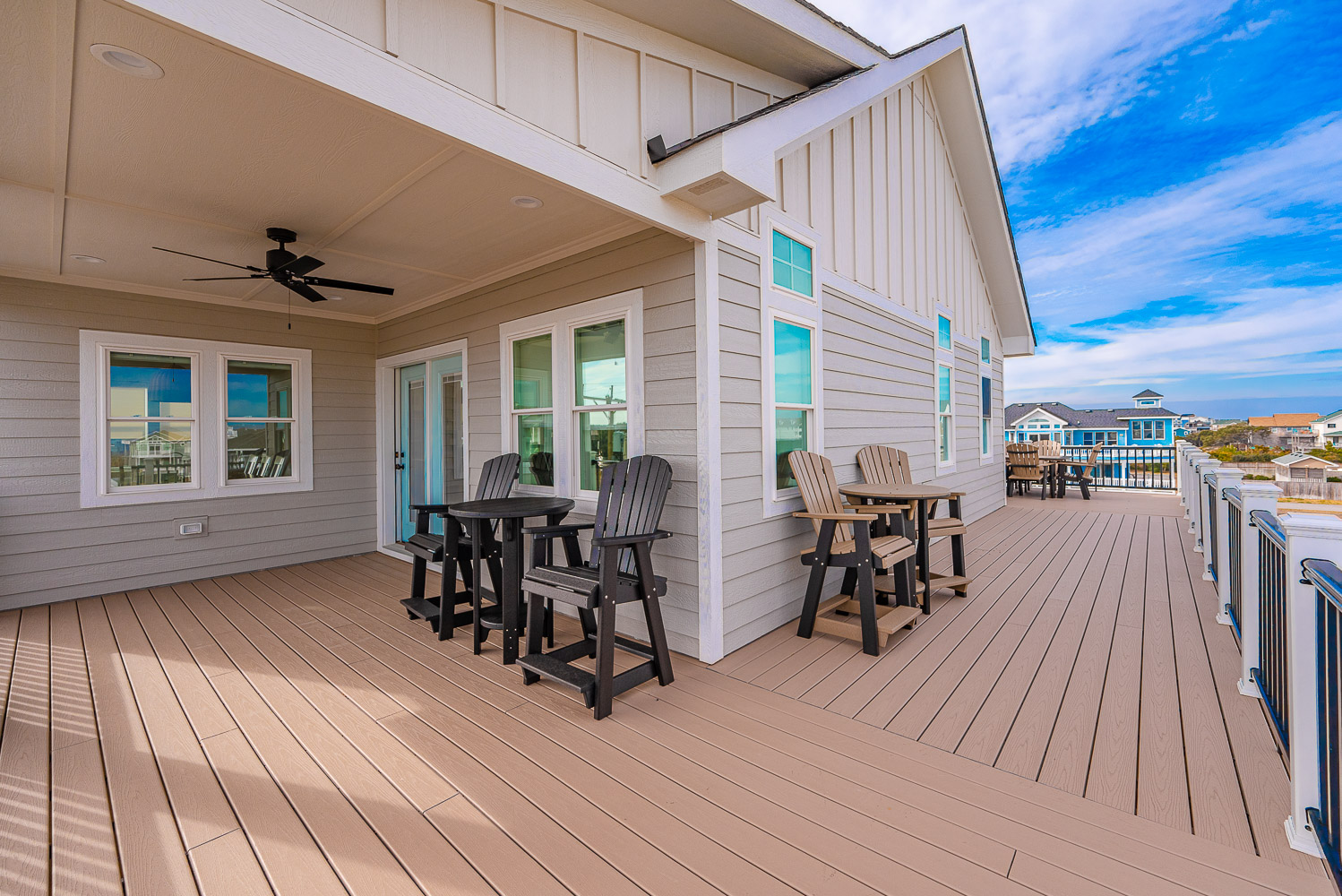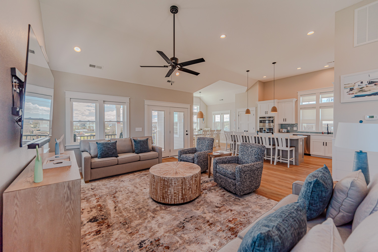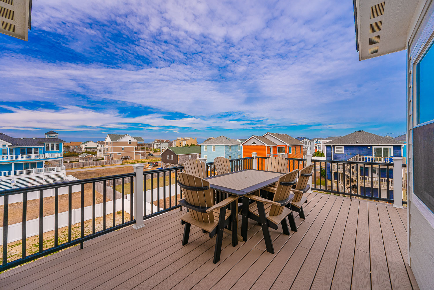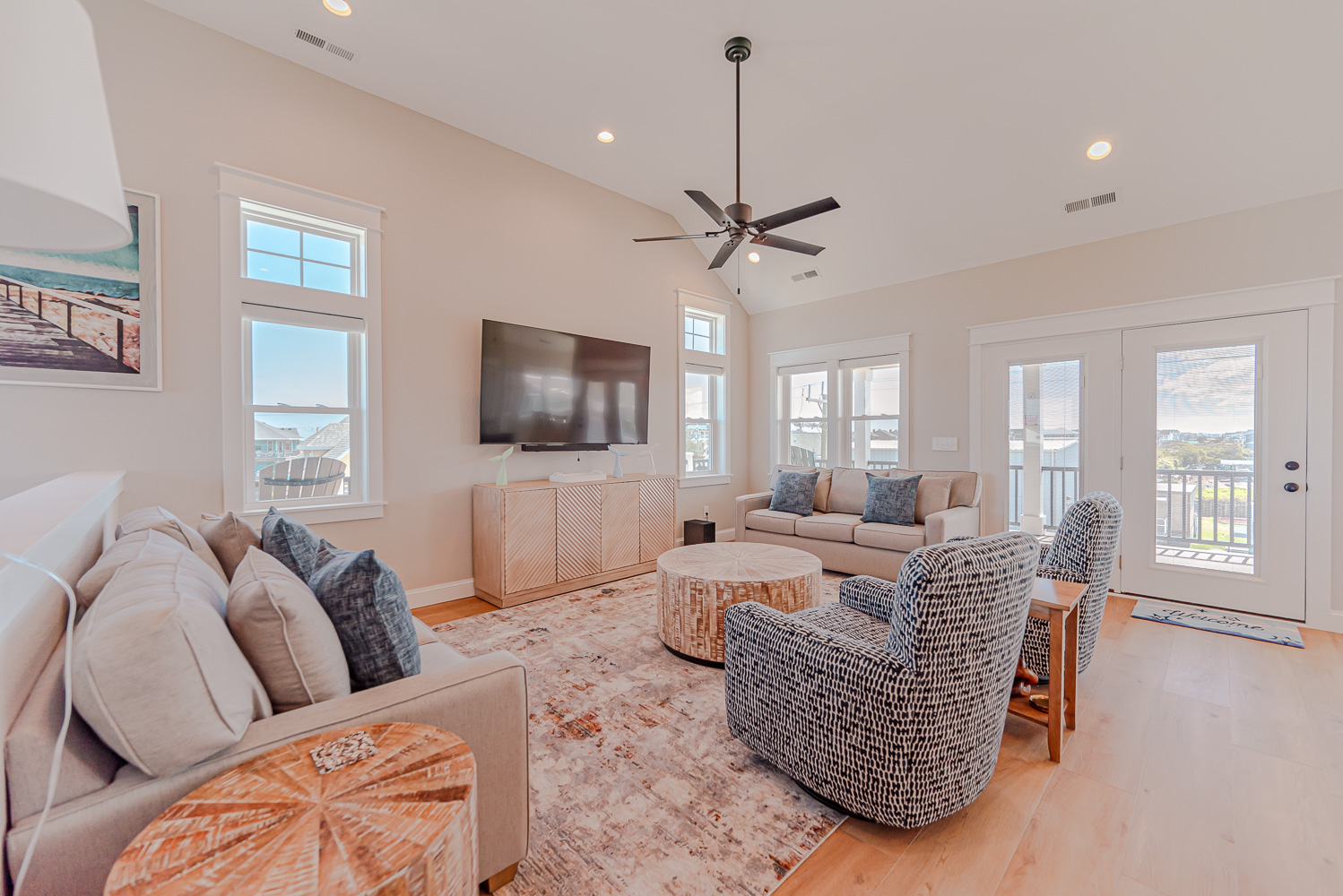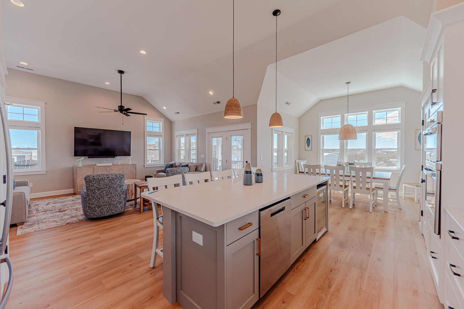 Top Level: Spacious Living Area w/TV, Access to Large Sun Deck, Well Equipped Kitchen, 2 Dishwashers, Island Bar Seating for Five (5), Dining Area, Seating for Ten (10), Horizon Ocean Views, Half Bath, Covered Deck w/Deck Furniture, Sun Deck w/Deck Furniture, Private Suite w/King, TV, and Full Bath w/ Walk-In Shower.