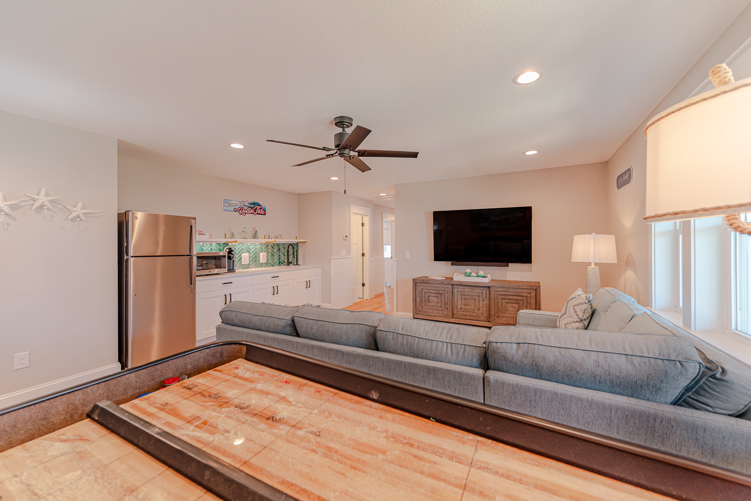 Inside, the home features upgraded touches throughout along with a family-friendly layout that includes multiple private suites for added comfort and privacy. The ground level offers a fun rec room with shuffleboard, a wet bar with a full-size refrigerator, and a king suite. The mid level includes four more private suites—perfect for giving each family group their own space—while the top level features a spacious living area, a well-equipped kitchen with two dishwashers, and another king suite. An elevator (to levels 2 and 3) makes unloading groceries or luggage much easier, too.