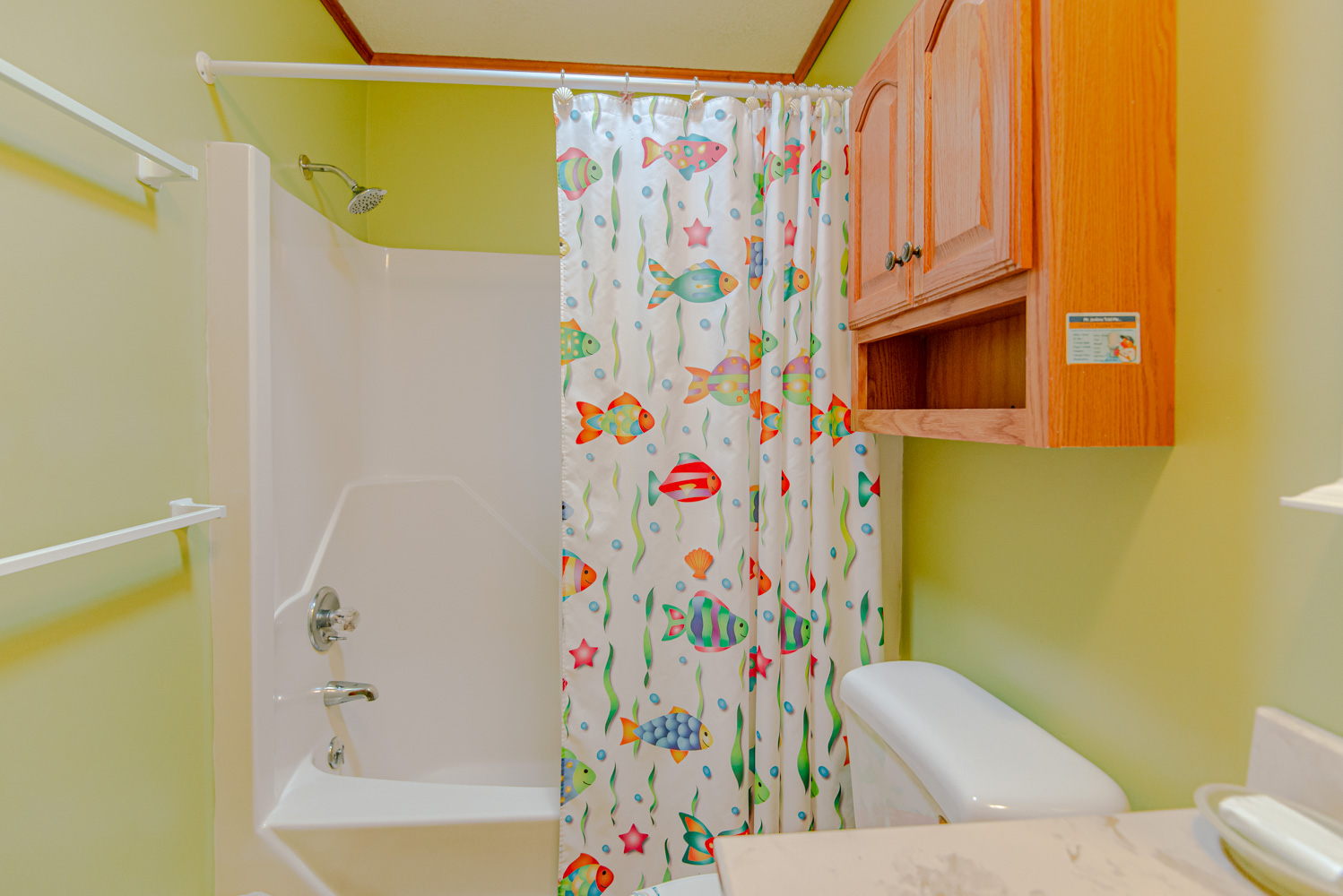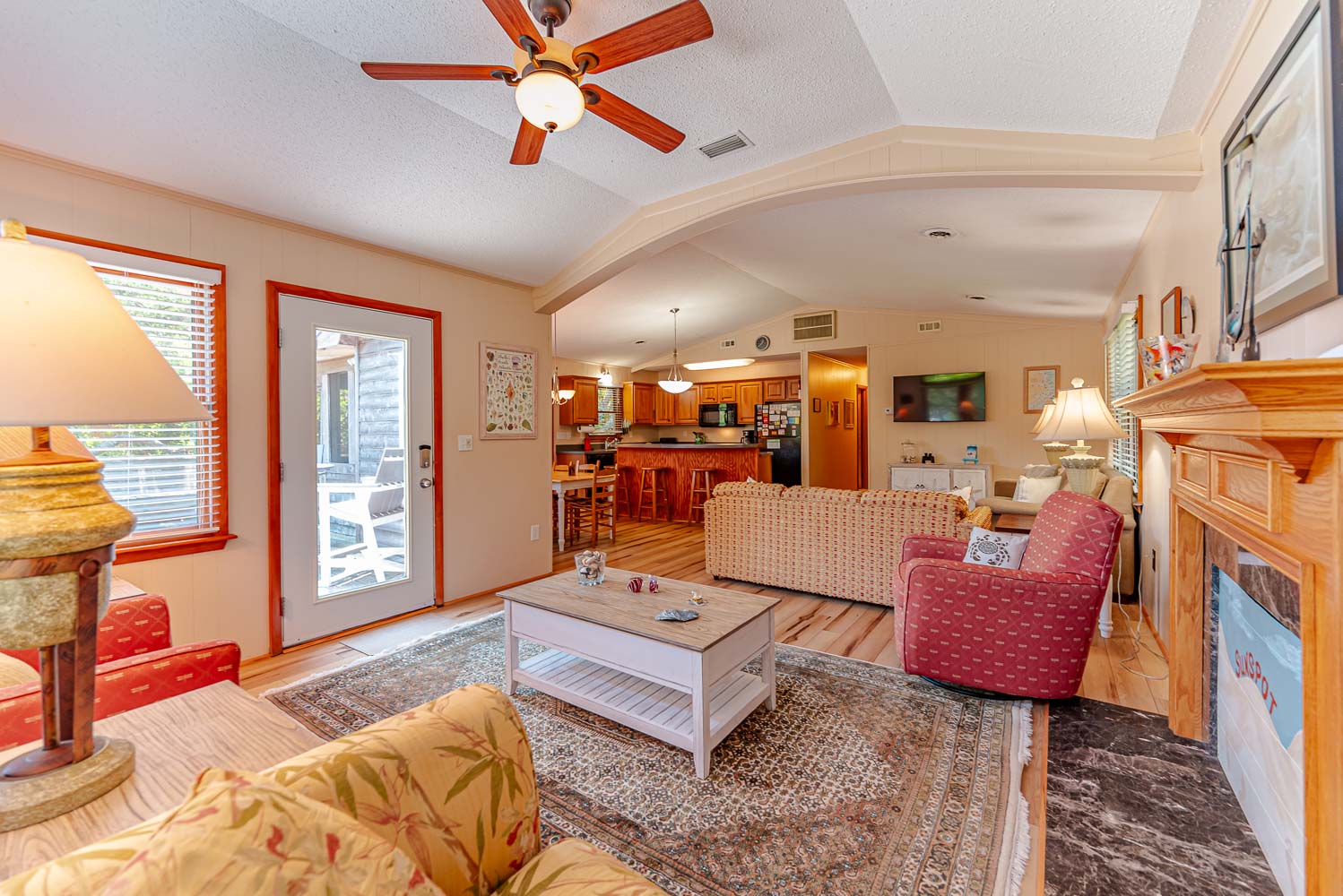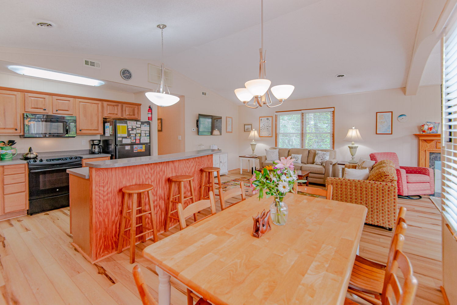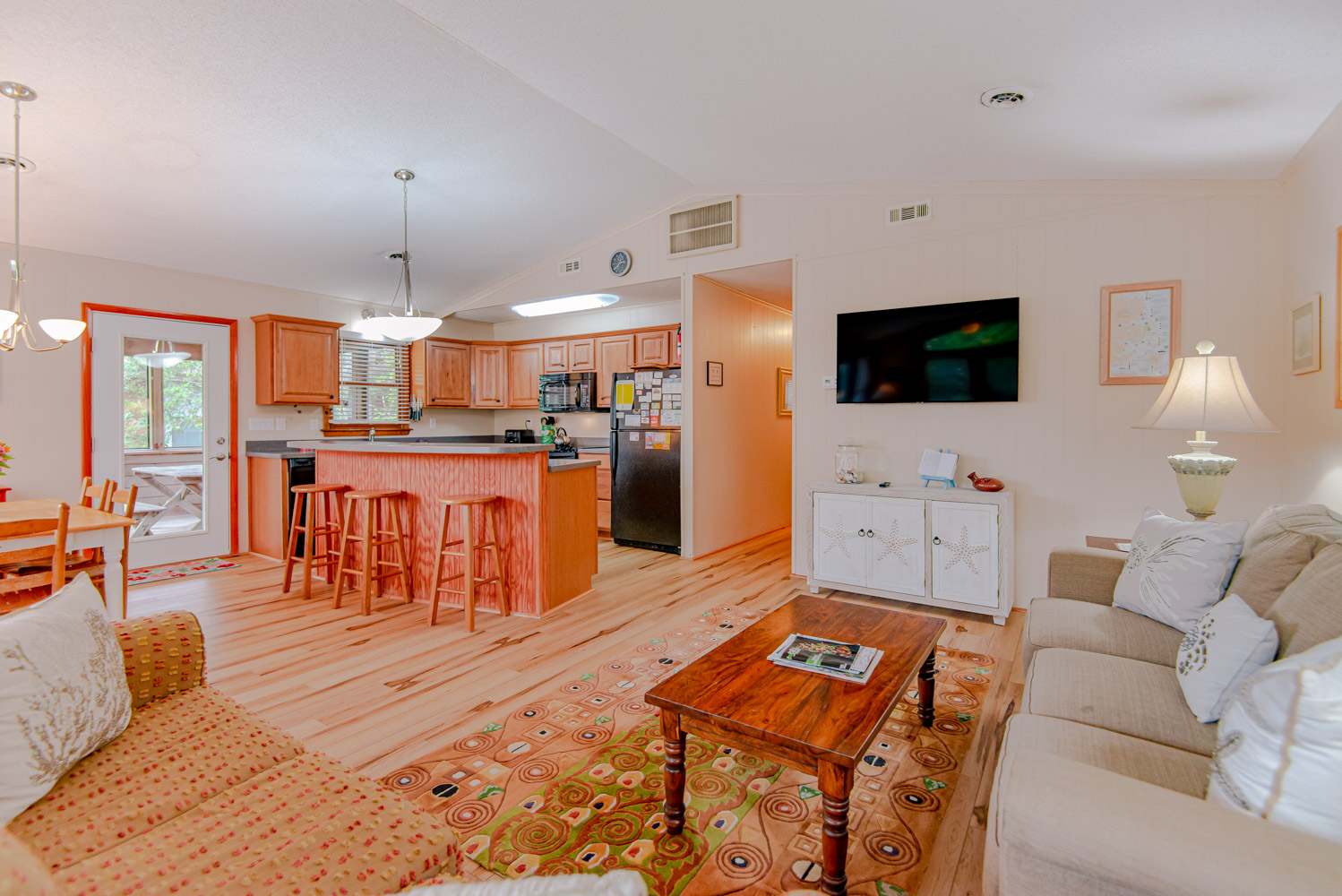 Main Level: Spacious Living Area, Flat Screen TV, Streaming Apps, Queen Sleep Sofa, Dining Area w/Seating for Six (6), Kitchen Area w/Island Bar Seating for Three (3), 3 Bedrooms (Private Suite w/King, TV, Full Bath w/Custom Walk-in Shower w/4 Inch Step, 1 w/Queen, 1 w/2 Singles), Full Hall Bath w/Tub/Shower, Screen Porch w/Picnic Table, Large Sun Deck w/Built-In Benches and Safety Gate for Children.