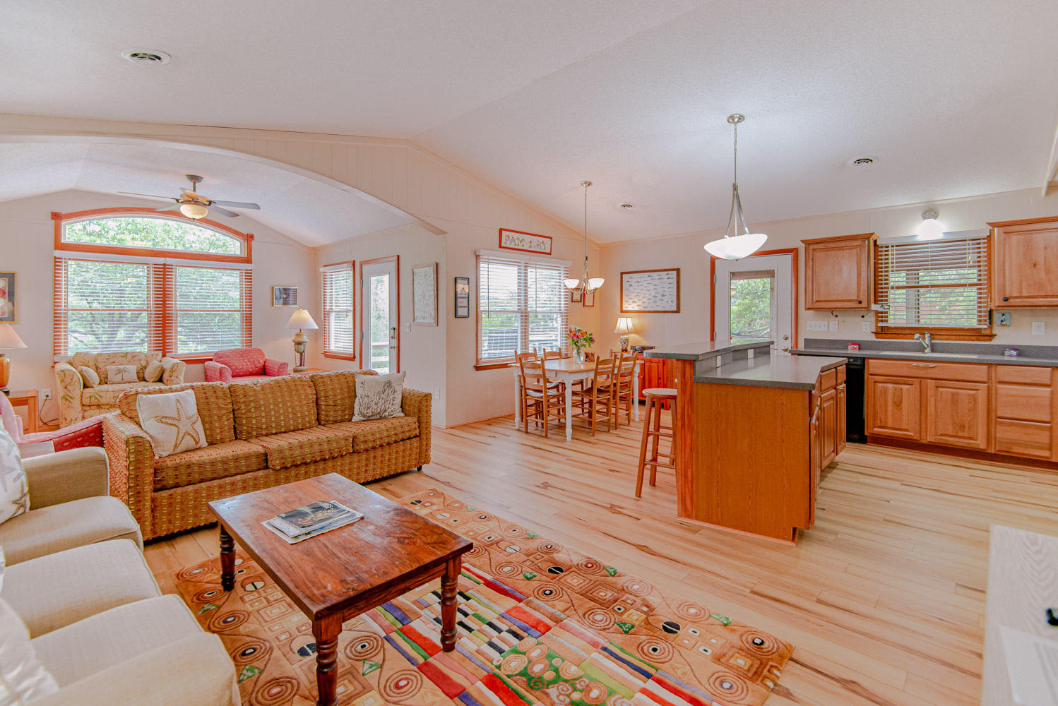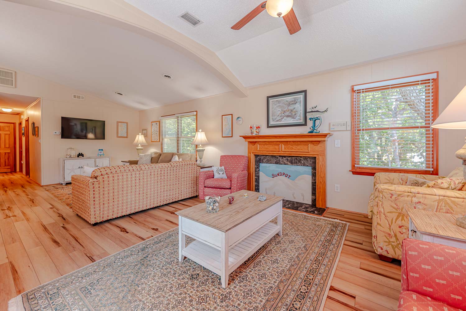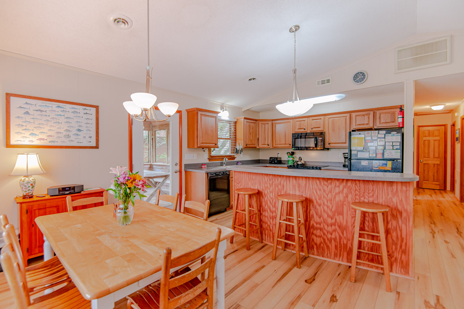 Main Level: Spacious Living Area, Flat Screen TV, Streaming Apps, Queen Sleep Sofa, Dining Area w/Seating for Six (6), Kitchen Area w/Island Bar Seating for Three (3), 3 Bedrooms (Private Suite w/King, TV, Full Bath w/Custom Walk-in Shower w/4 Inch Step, 1 w/Queen, 1 w/2 Singles), Full Hall Bath w/Tub/Shower, Screen Porch w/Picnic Table, Large Sun Deck w/Built-In Benches and Safety Gate for Children.