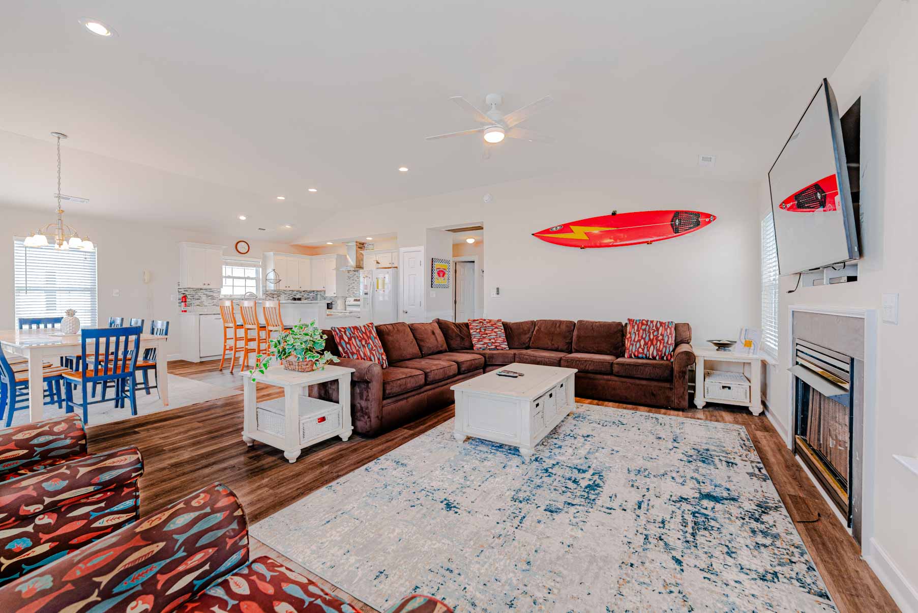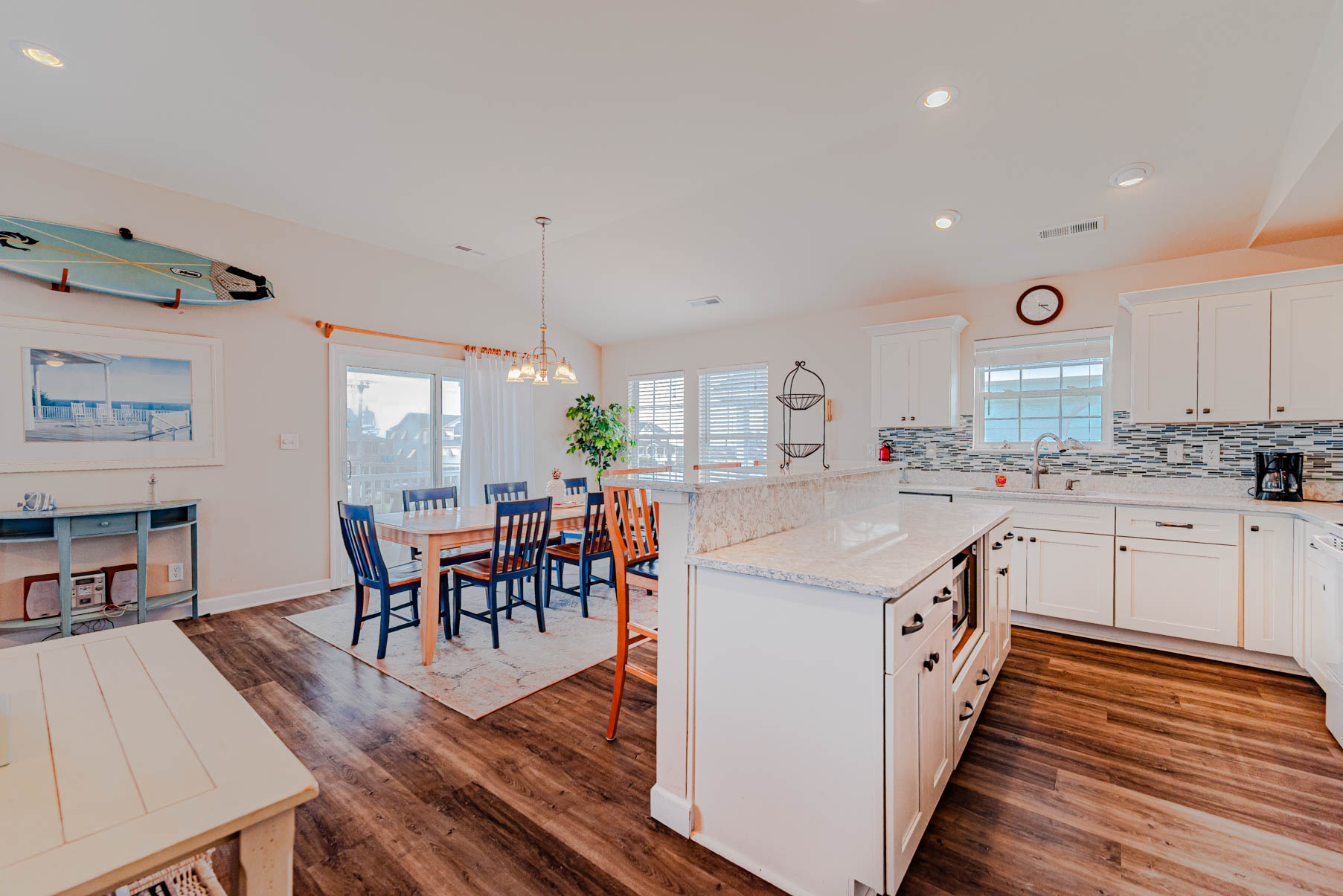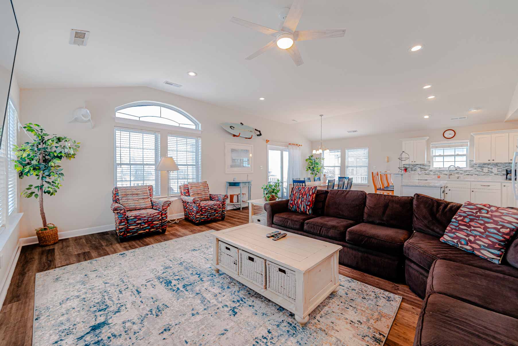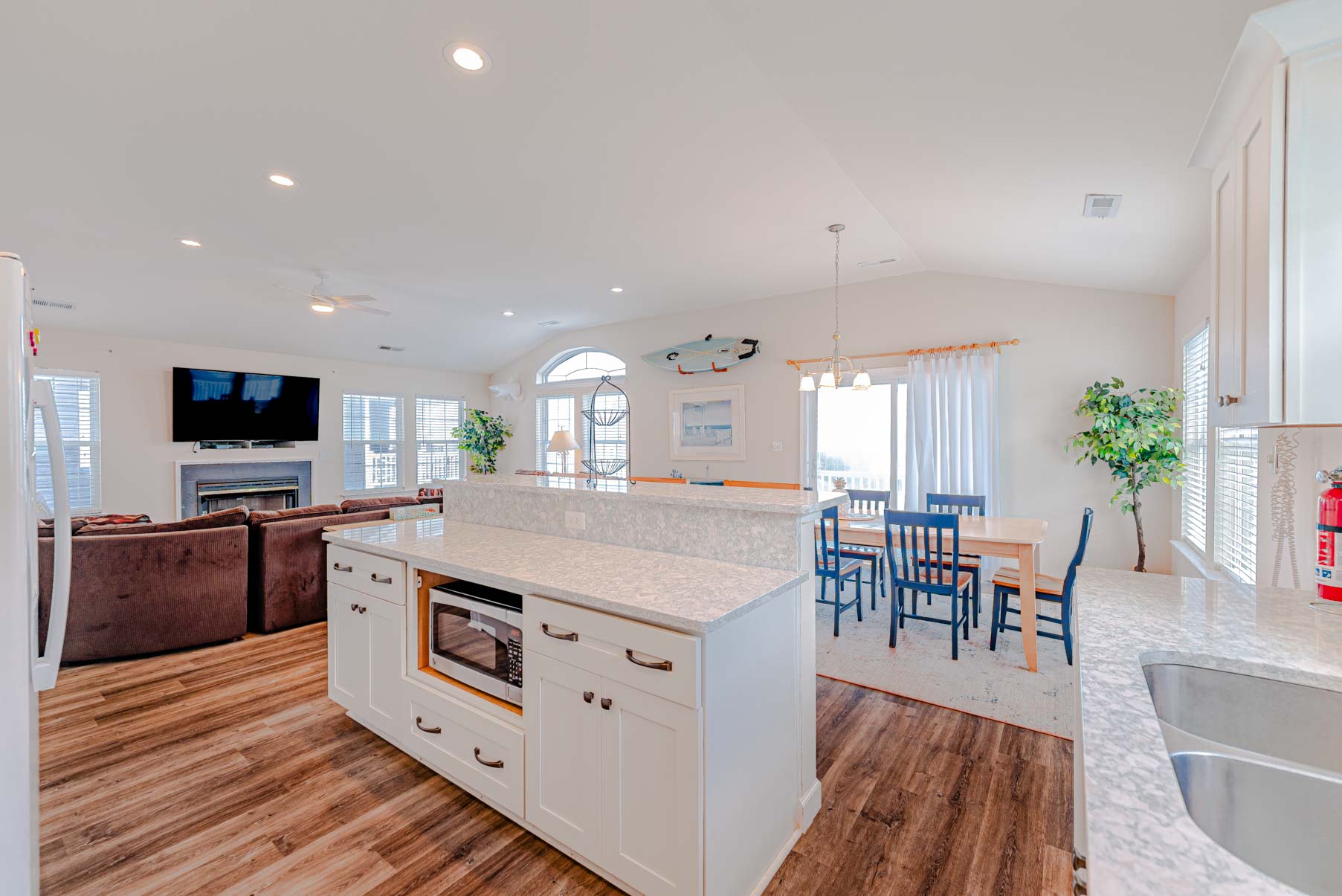 Top Level: Nicely Decorated Living/Dining/Kitchen Area, Flat Screen TV, Stereo, Full Bath w/Tile Shower, Ocean Views, Bedroom w/King, TV, Covered Deck w/Furniture, and Sun Deck w/Furniture.