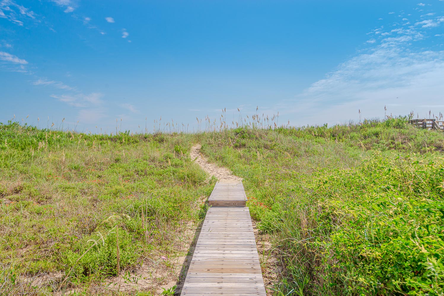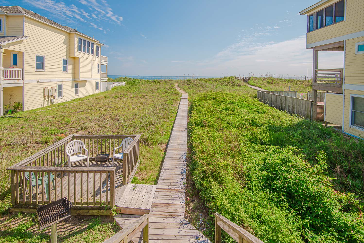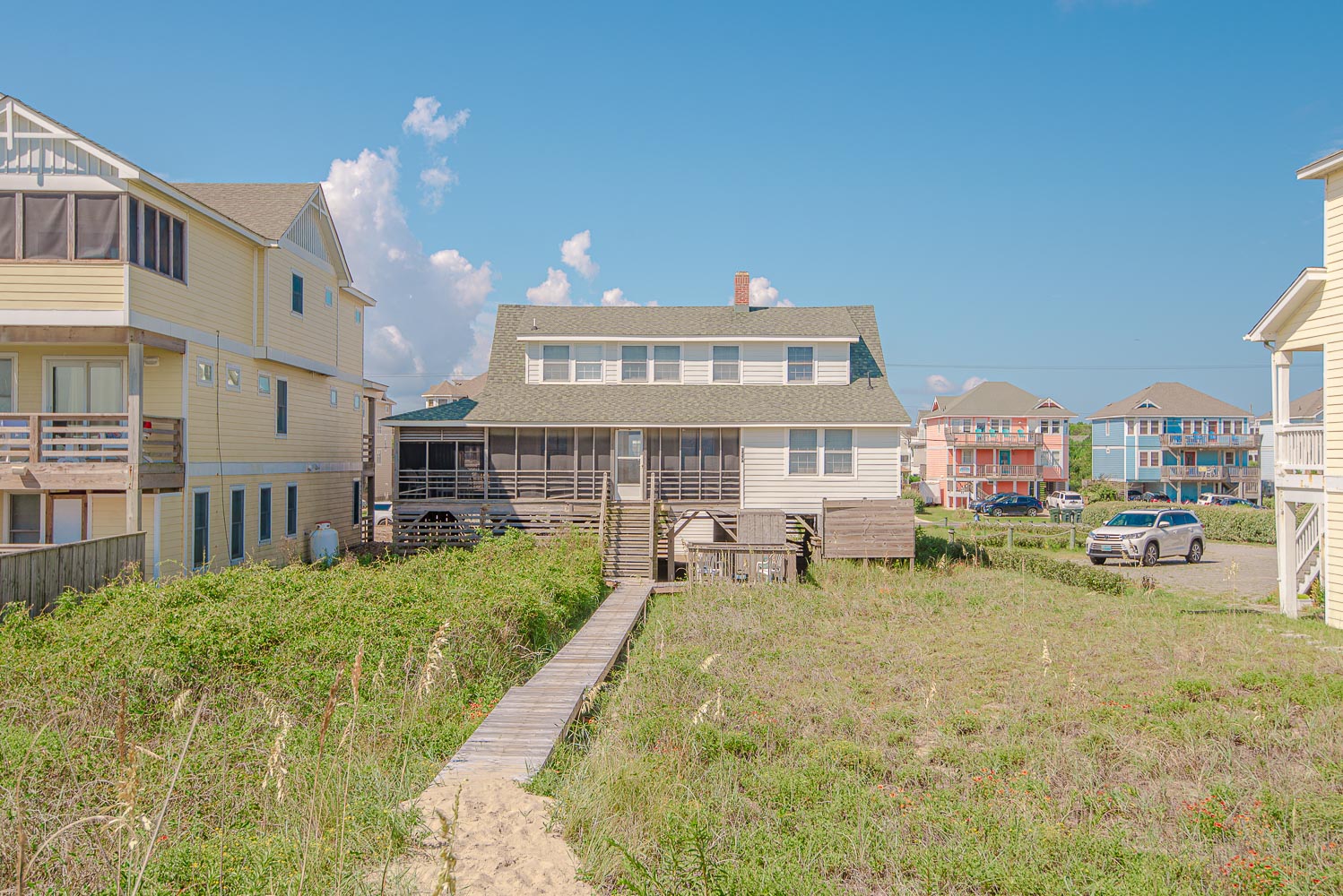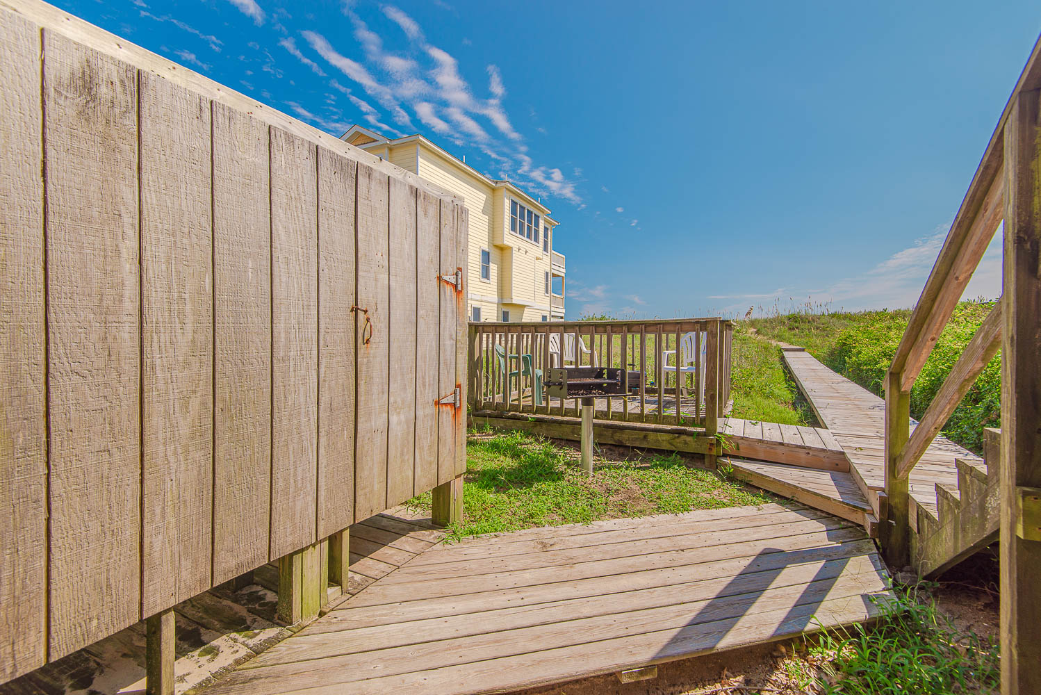 Ground Level: Parking for 6 Cars, Steps to Entry, Enclosed Outside Shower, Park Grill, & Walkway to the Beach.