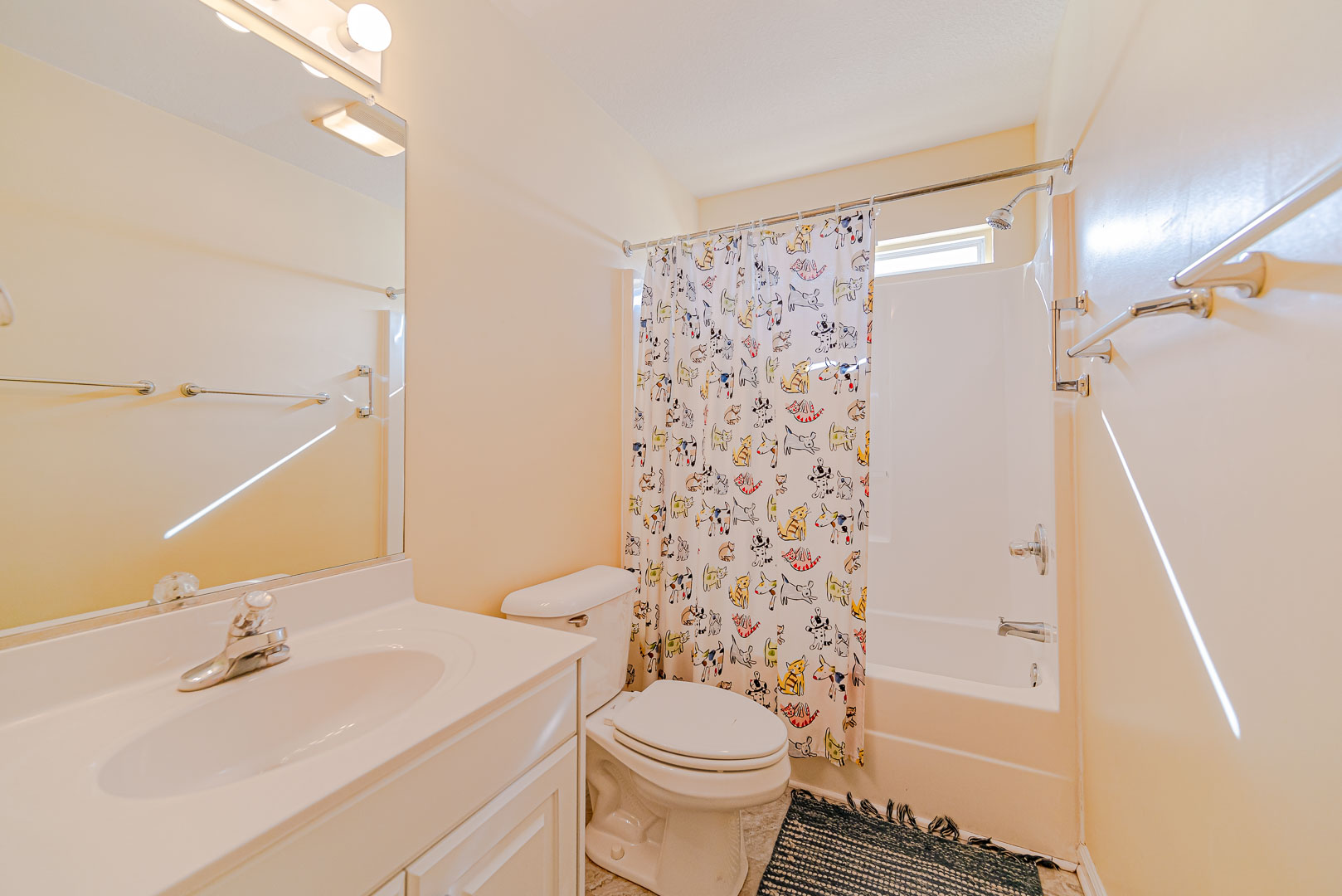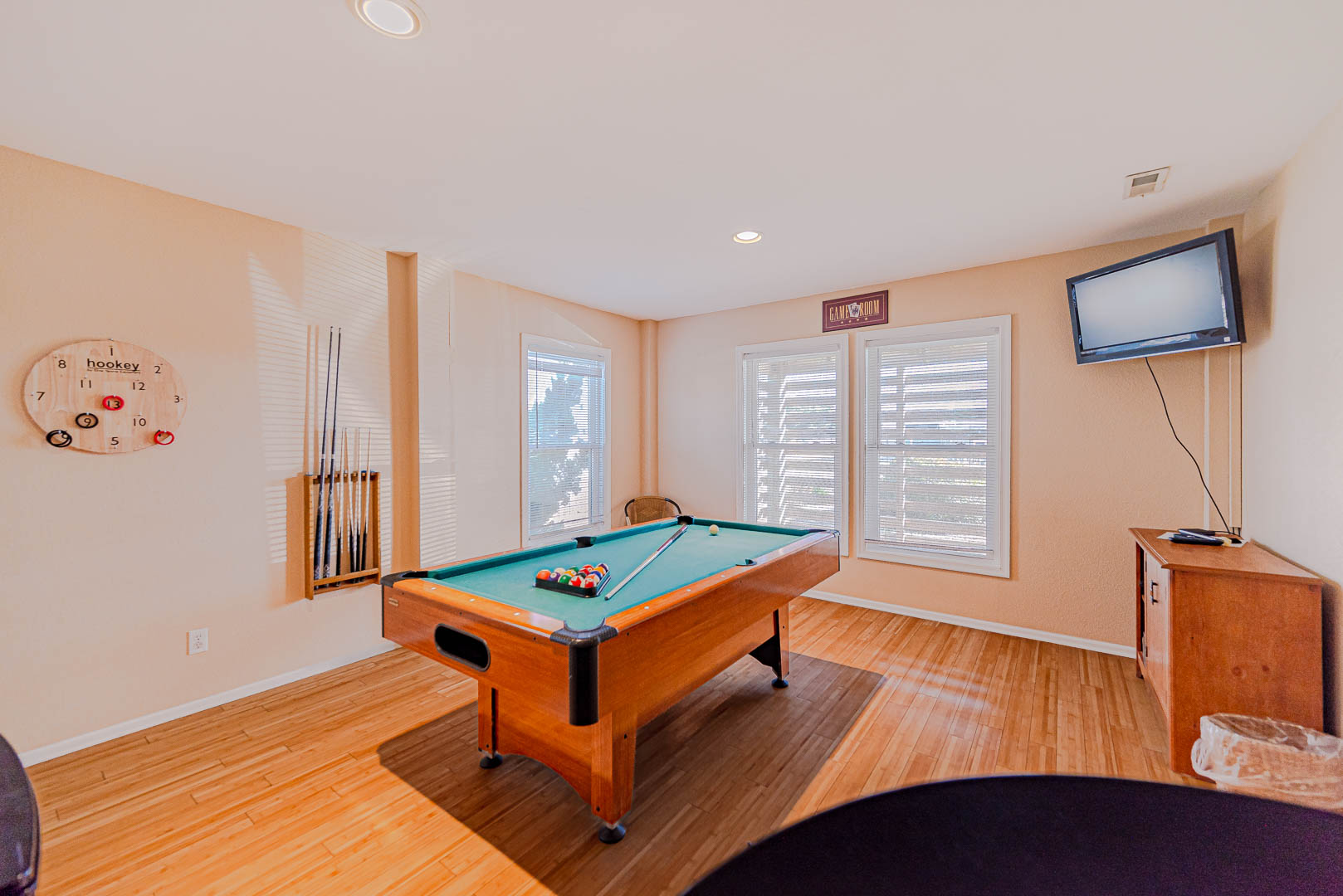 Mid Level: 3 Bedrooms (1 Private Suite w/King, Flat Screen TV, Full Bath, & Access to Covered Deck w/Hot Tub, 1 w/Queen, Flat Screen TV, & 1 w/2 Bunk Sets). Full Hall Bath. Den w/Queen Sleep Sofa, TV/DVD, & Access to Covered Deck w/Hot Tub.