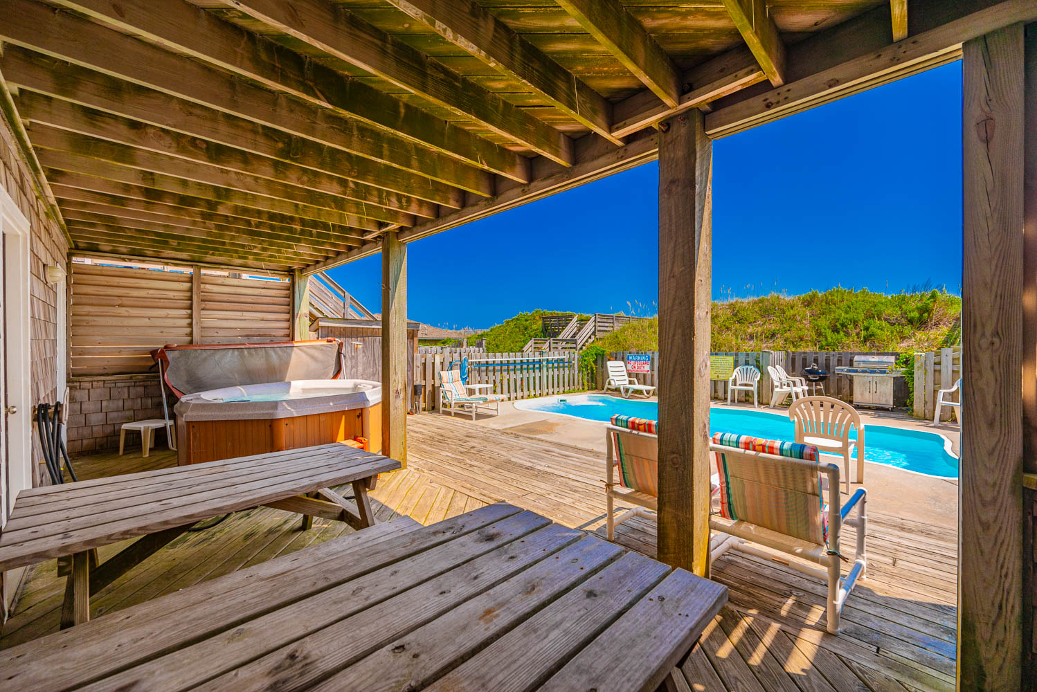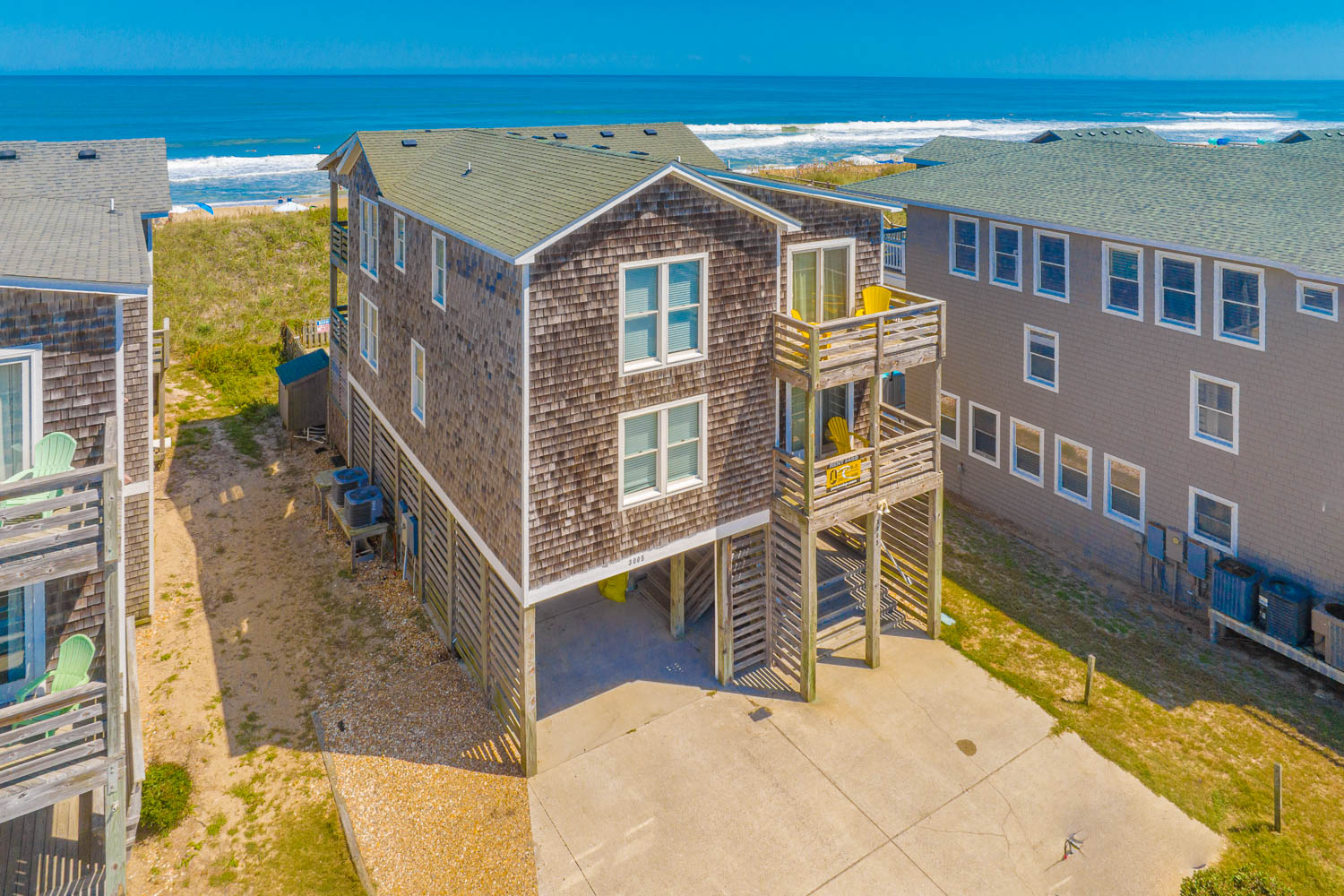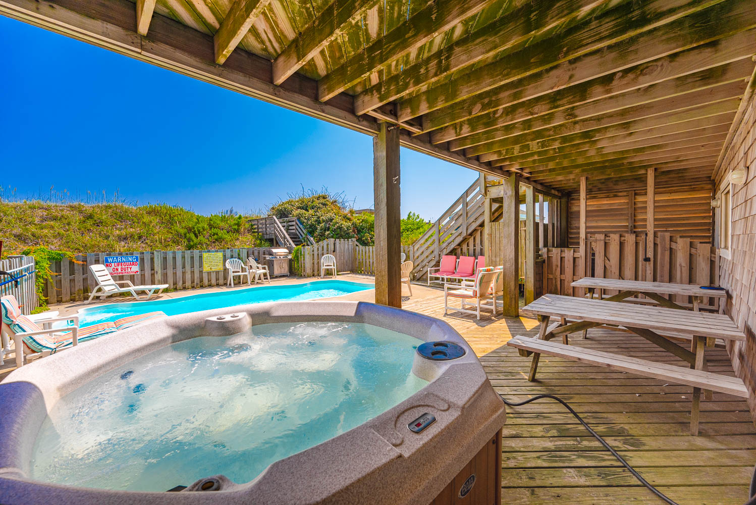 Ground Level: Parking for 4 Cars, Covered Entry, Rec. Room w/Pool Table, Half Bath, Wet Bar, Full Size Refrigerator, Microwave, Large Screen TV, 2 Covered Decks (1 Opens to Patio and Hot Tub Area), Private Swimming Pool - Open Seasonally, Hot Tub, Enclosed Outside Shower, Gas Grill, Charcoal Grill, and Walkway to Beach w/Dune Top Deck.